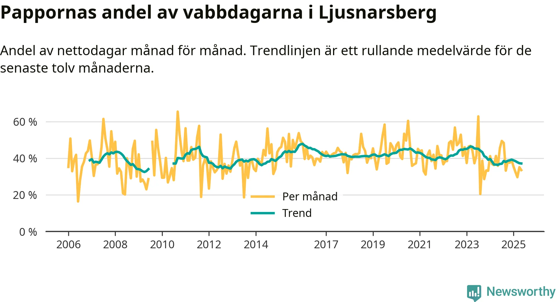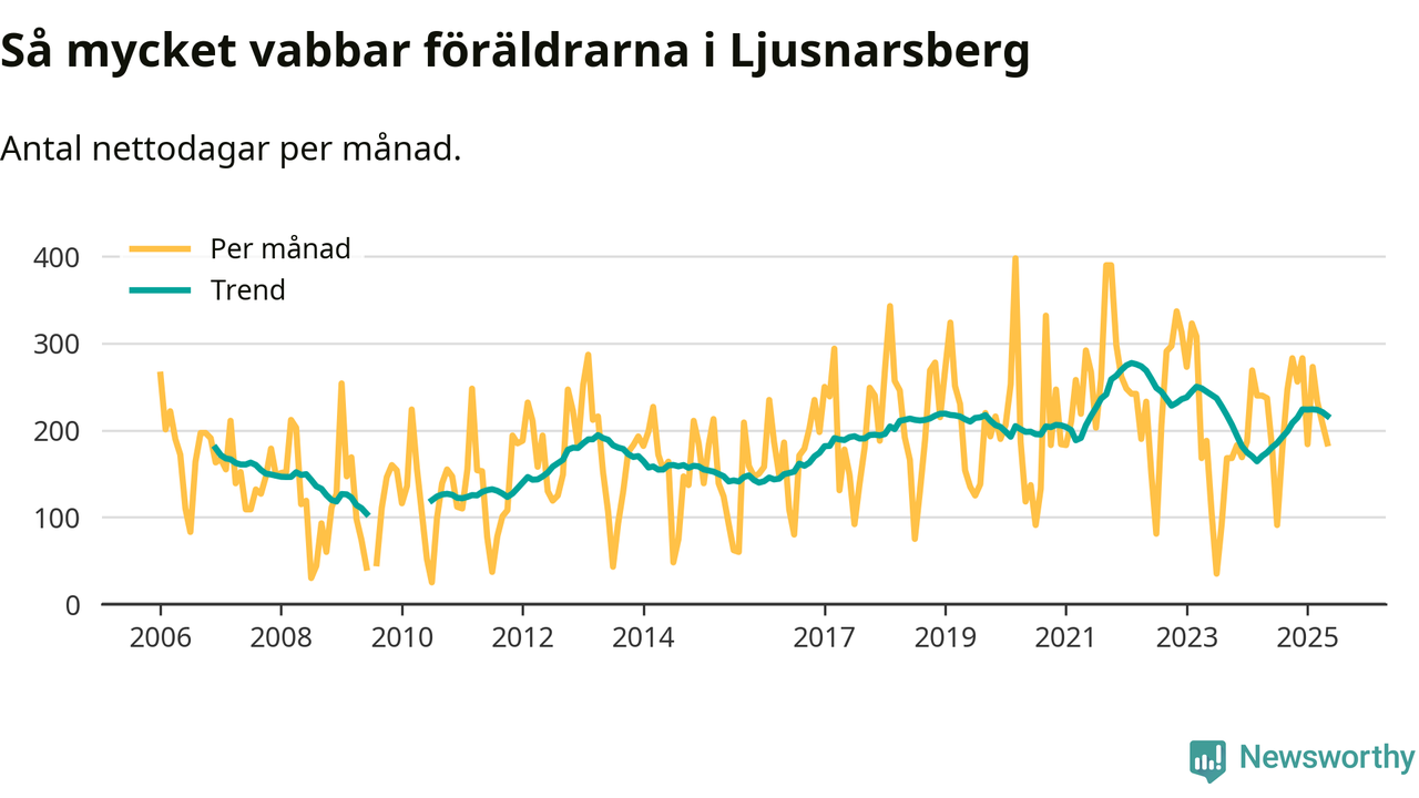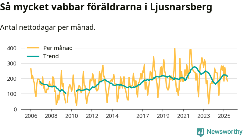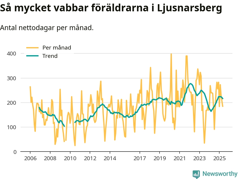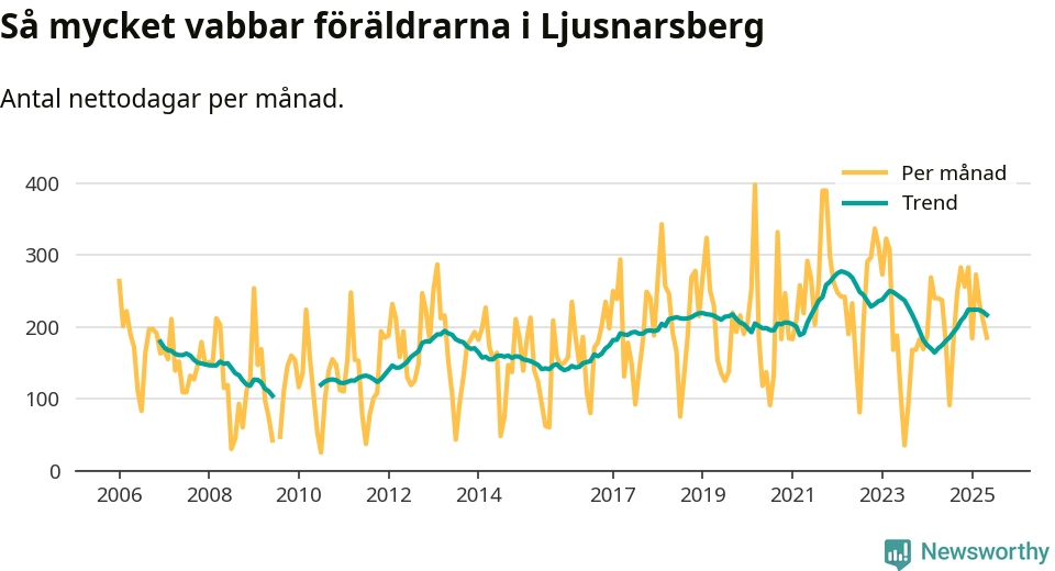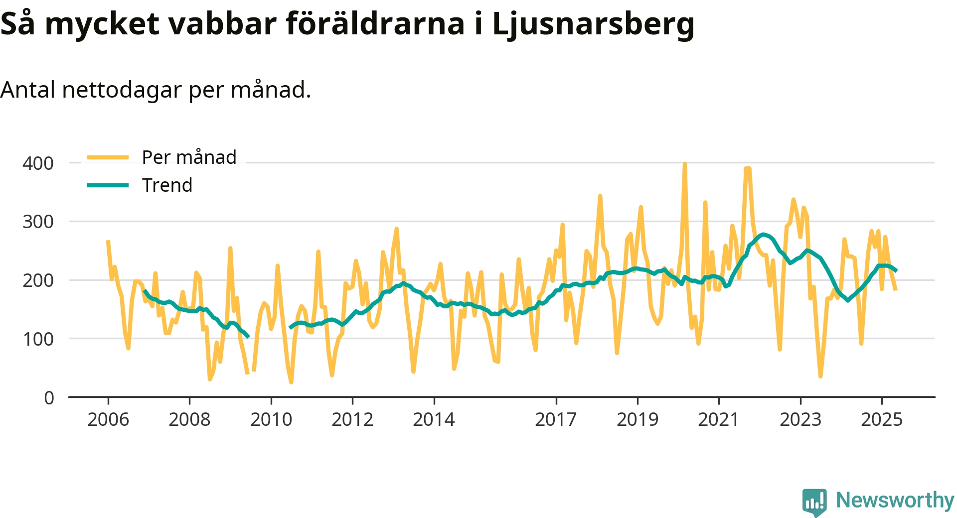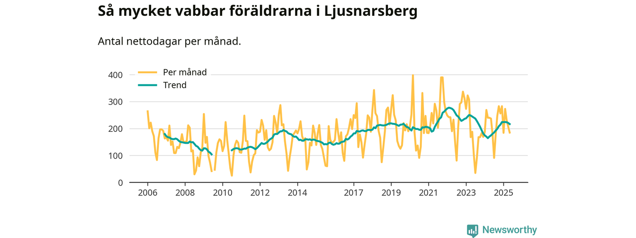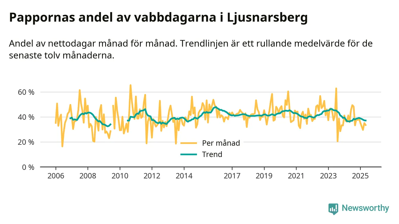 När coronapandemin drog in i mars 2020 peakade antalet vabbdagar både i Ljusnarsbergs kommun och i riket som helhet. Under de senaste två åren har vabbuttaget börjat minska igen.
