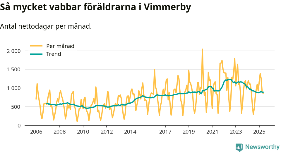 När coronapandemin drog in i mars 2020 peakade antalet vabbdagar både i Vimmerby kommun och i riket som helhet. Under de senaste två åren har vabbuttaget börjat minska igen.