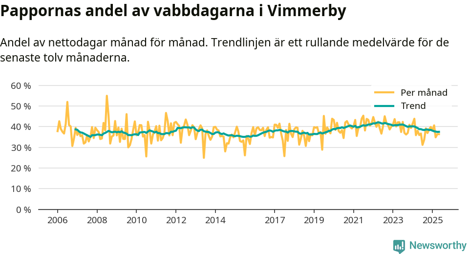Vimmerby ligger en bit från ett jämställt uttag. Under de senaste tolv månaderna har männen stått för 38 procent av all vabb i kommunen. I år har andelen varit lägre än på nästan sex år.
