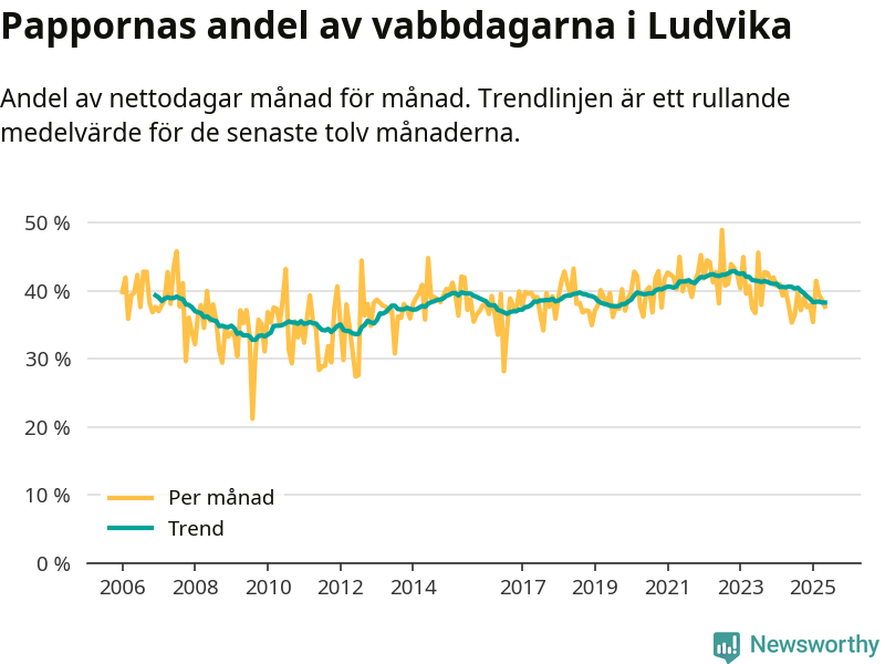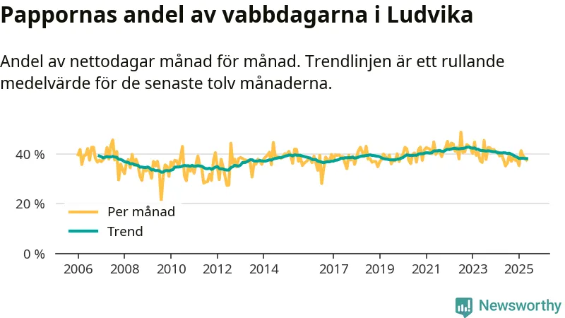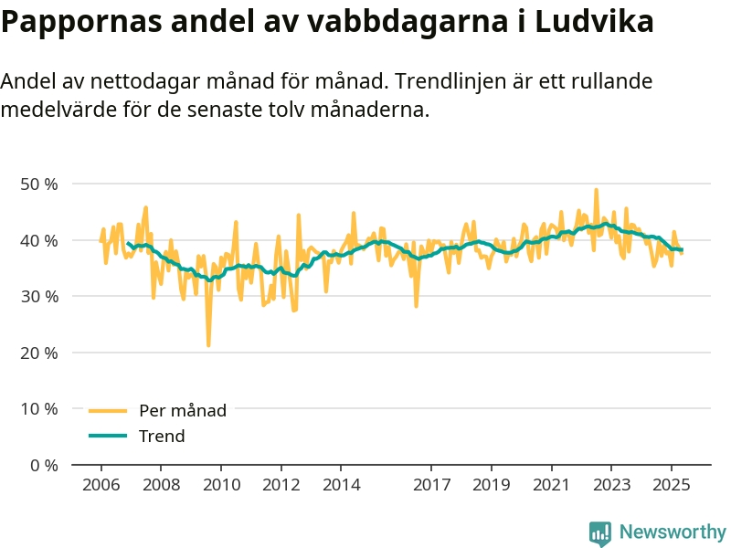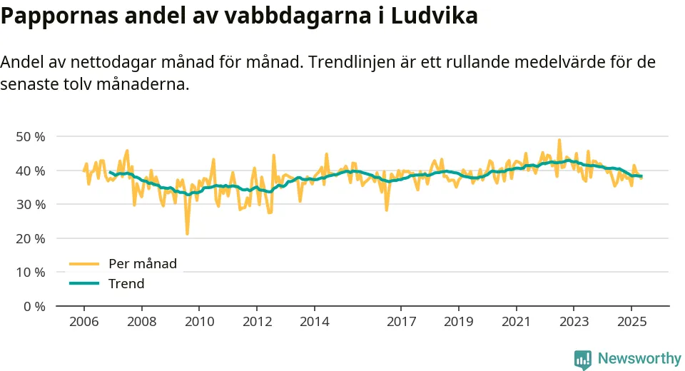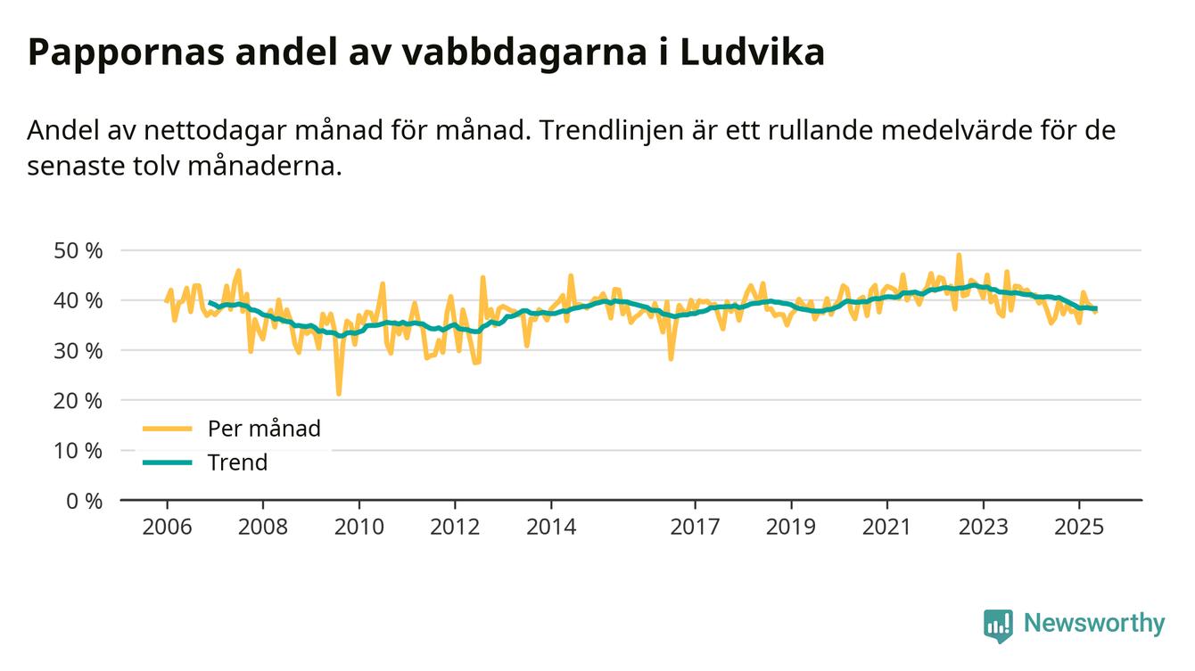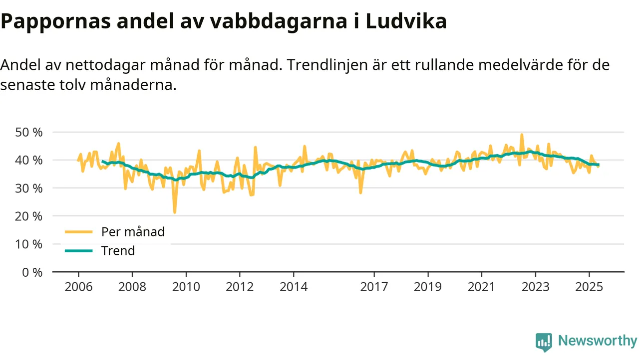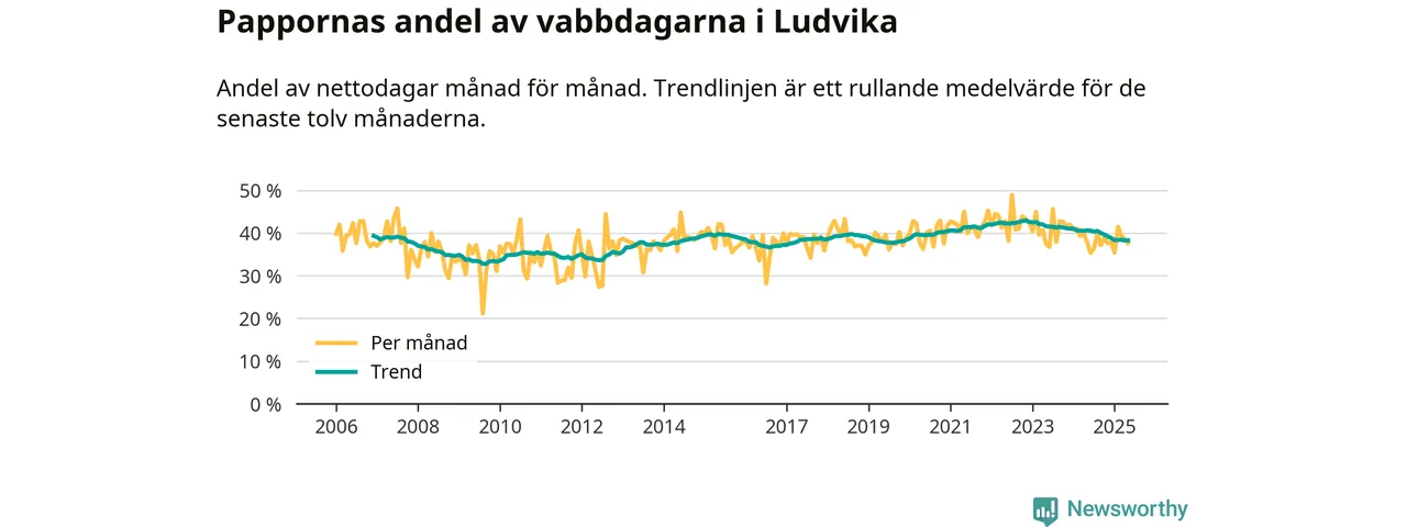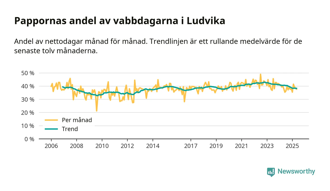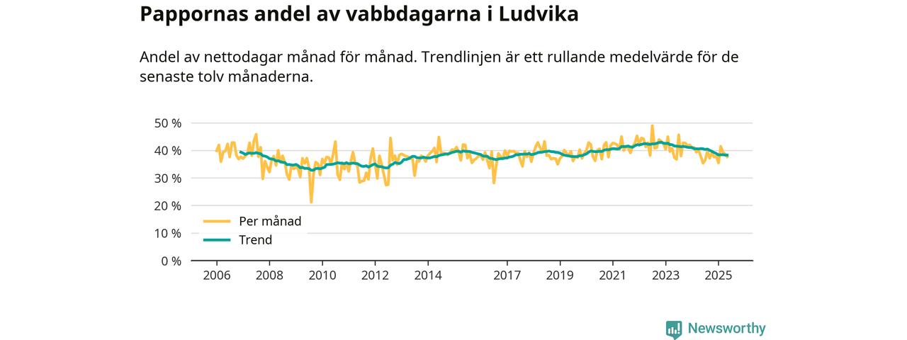 Ludvika ligger en bit från ett jämställt uttag. Under de senaste tolv månaderna har männen stått för 38 procent av all vabb i kommunen. Det är en lägre andel än på över fem år.