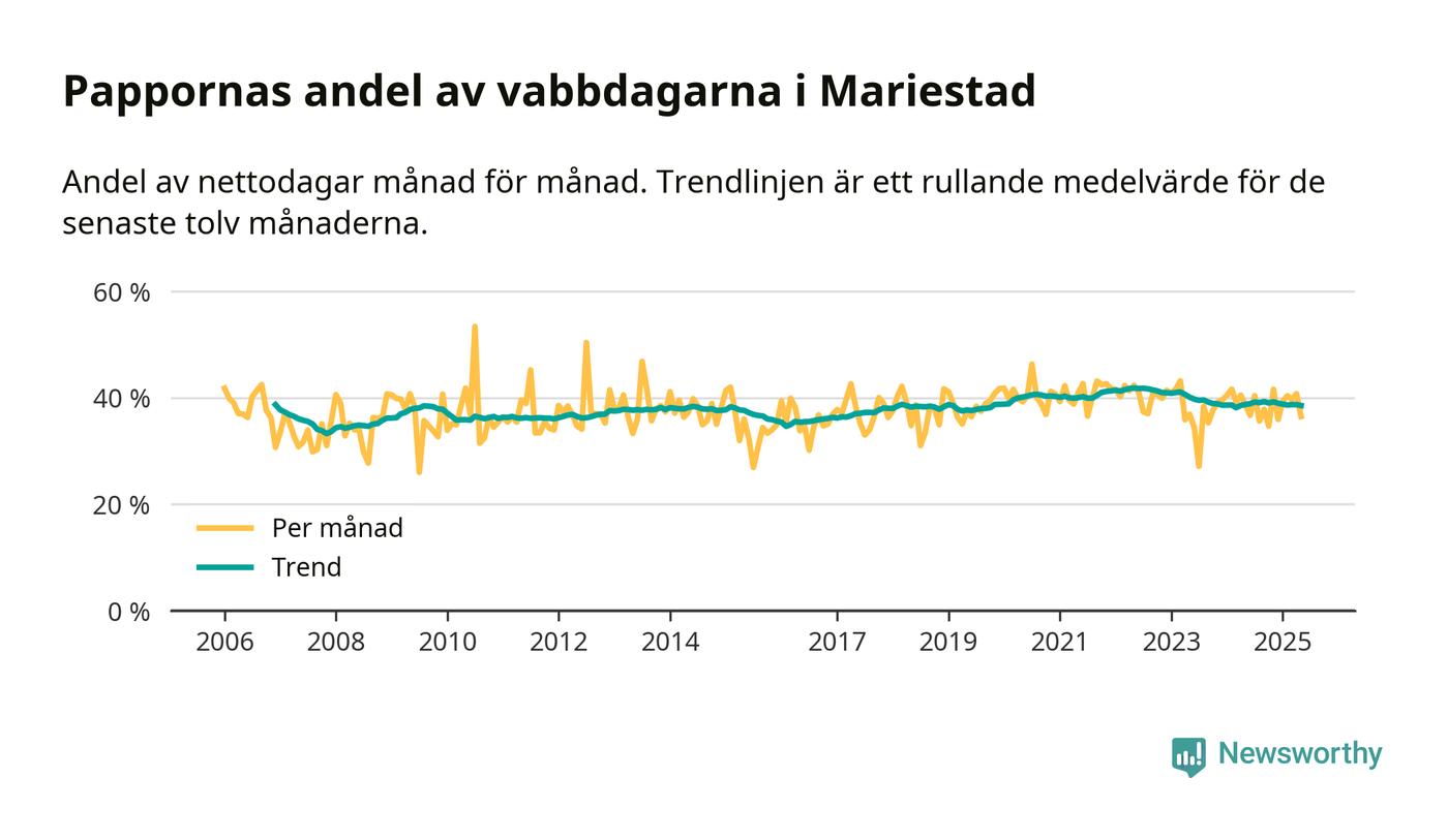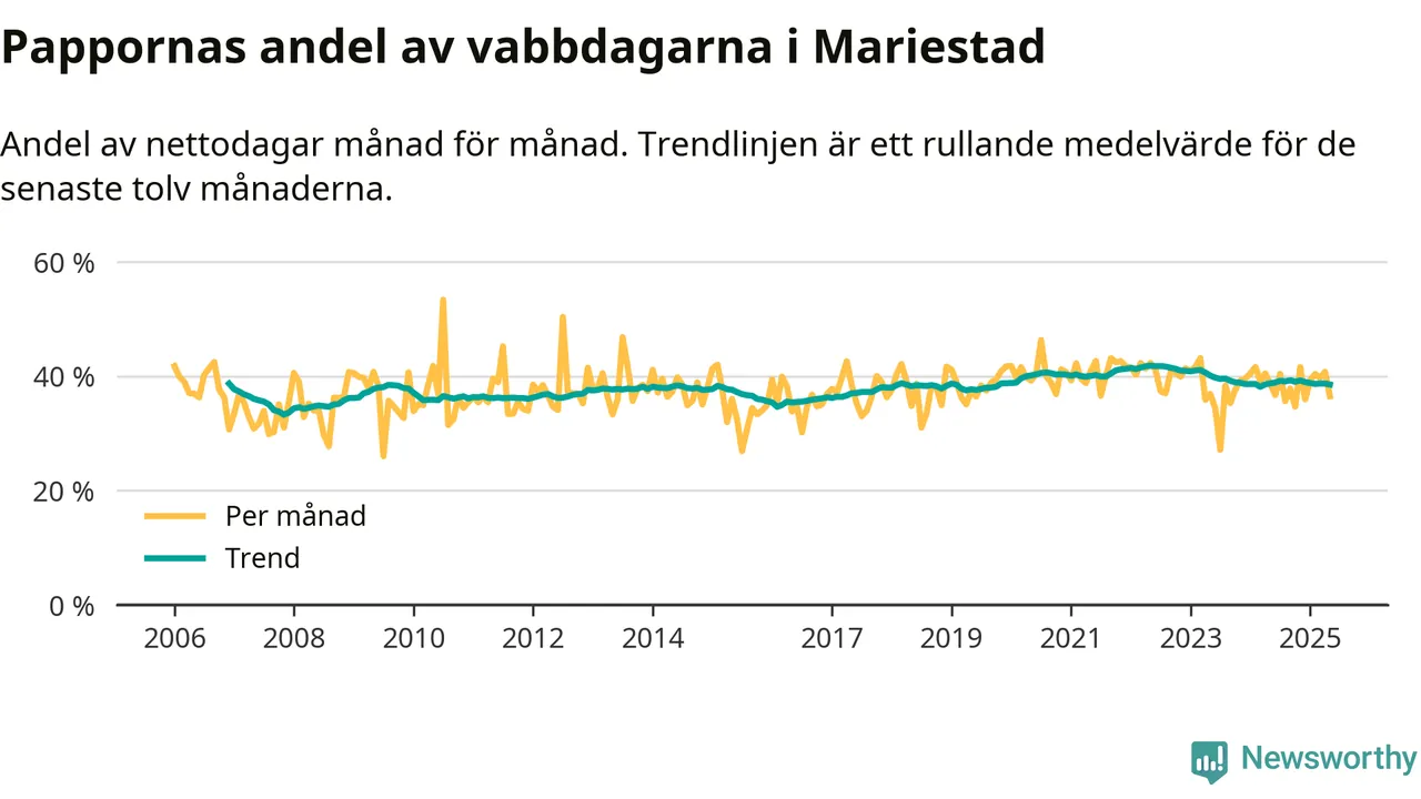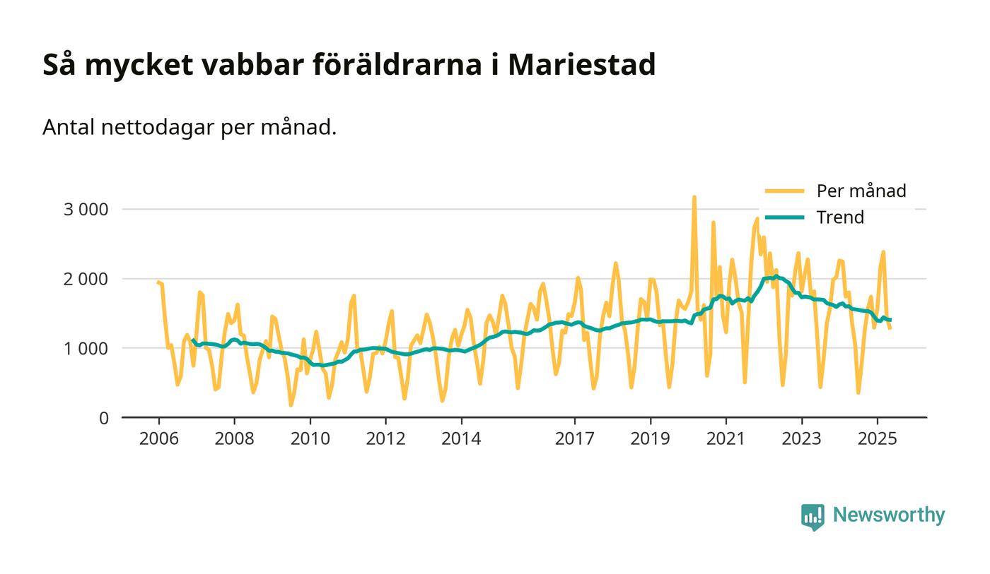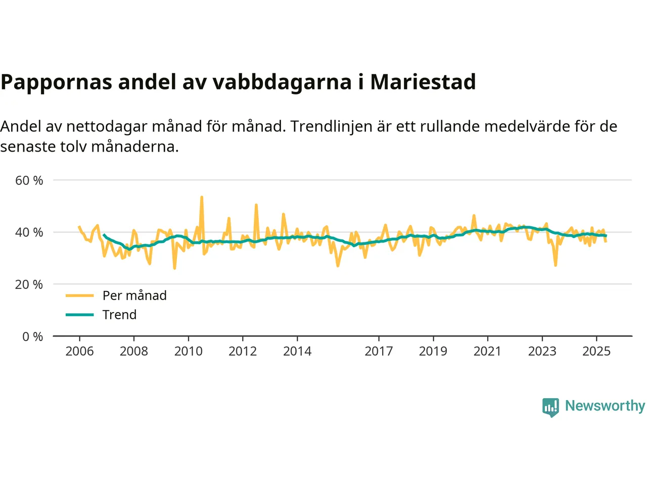 Mariestad ligger en bit från ett jämställt uttag. Under de senaste tolv månaderna har männen stått för 39 procent av all vabb i kommunen. Pappornas uttag peakade våren 2022 då kommunens fäder var uppe i 42 procent av vabbdagarna 1.