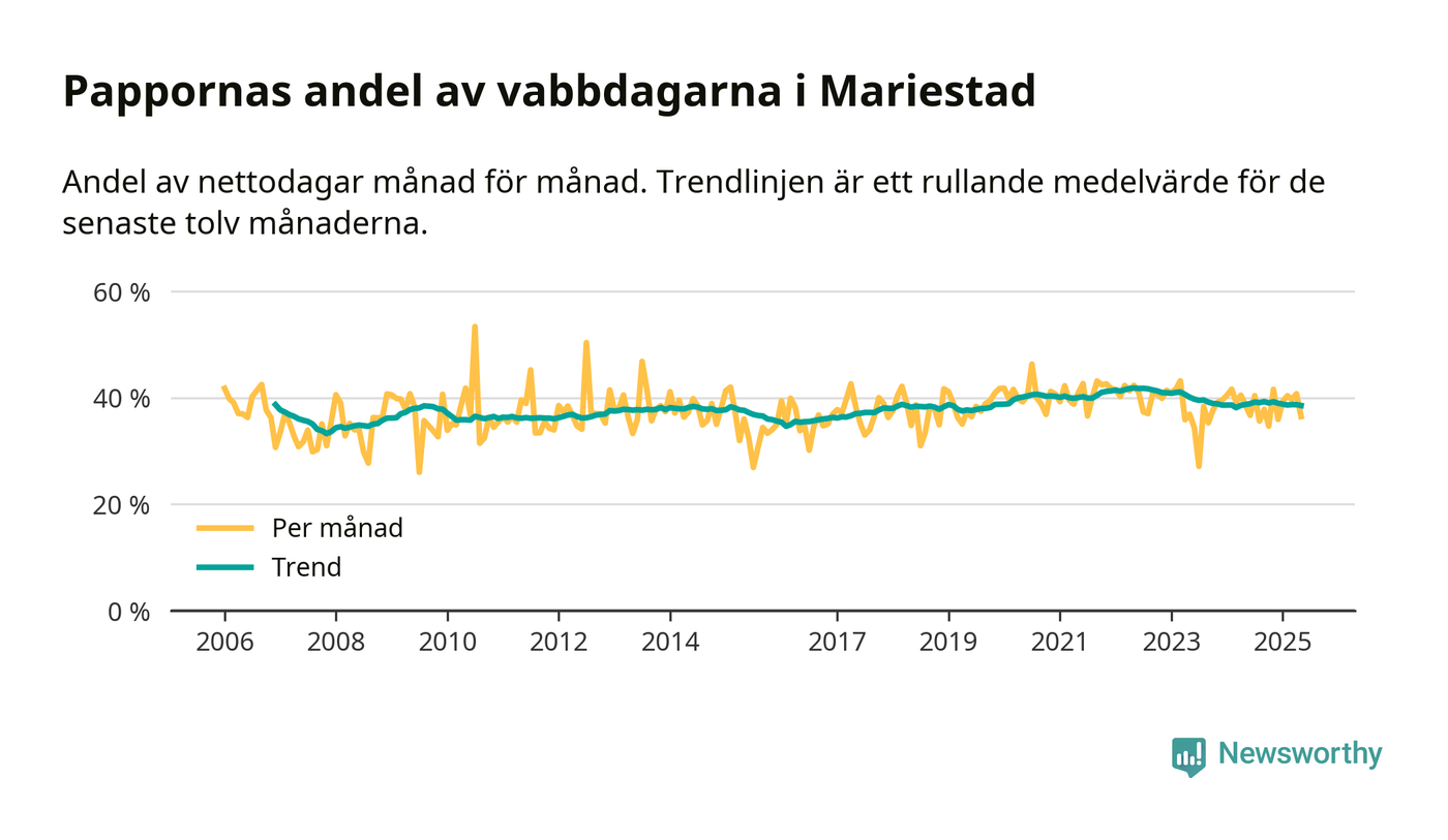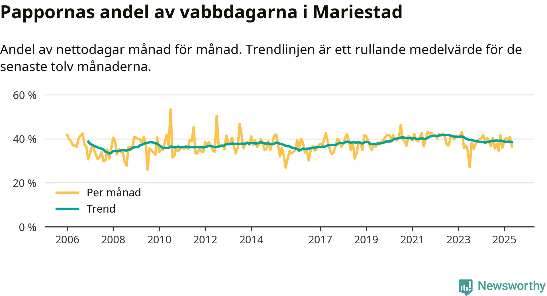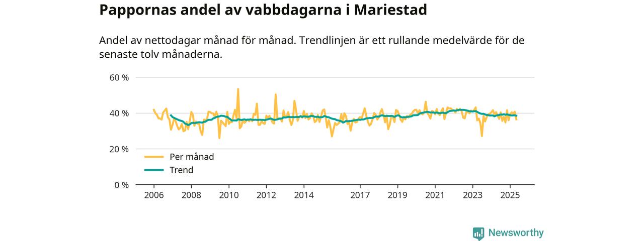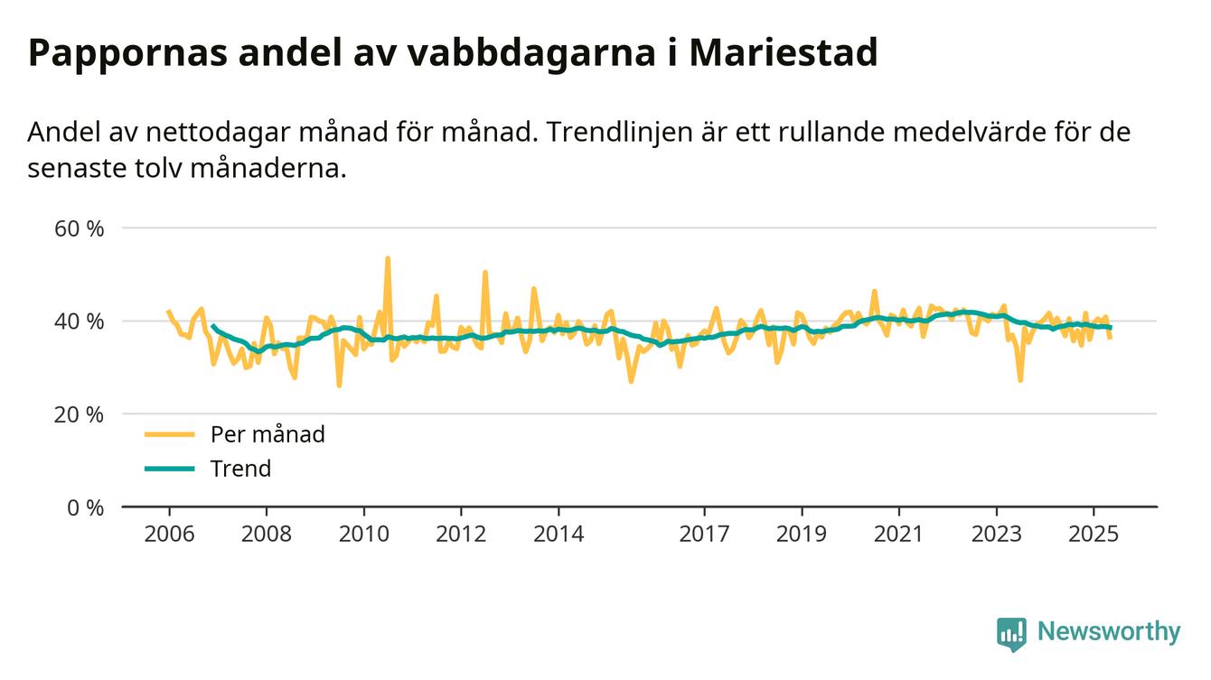 Mariestad ligger en bit från ett jämställt uttag. Under de senaste tolv månaderna har männen stått för 39 procent av all vabb i kommunen. Pappornas uttag peakade våren 2022 då kommunens fäder var uppe i 42 procent av vabbdagarna 1.