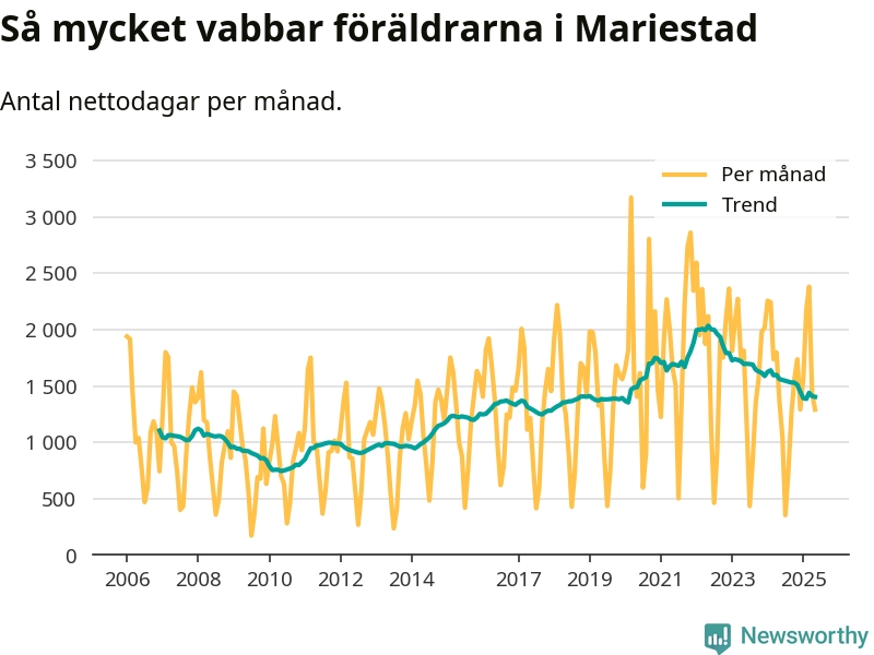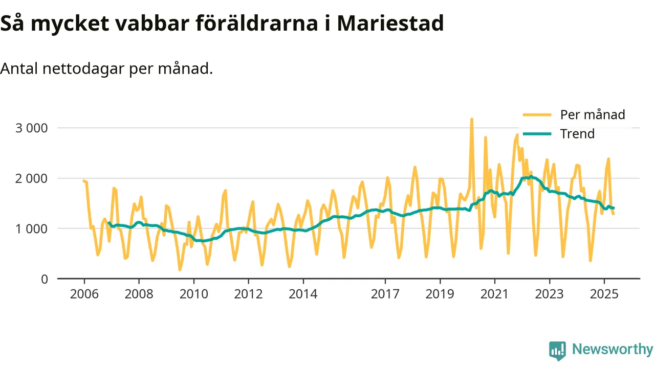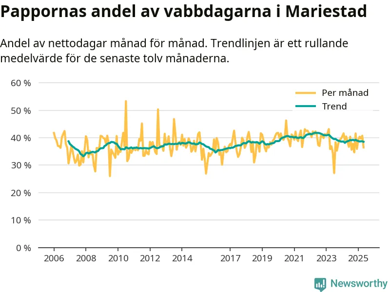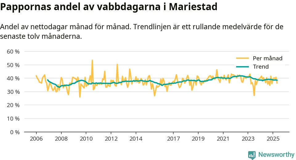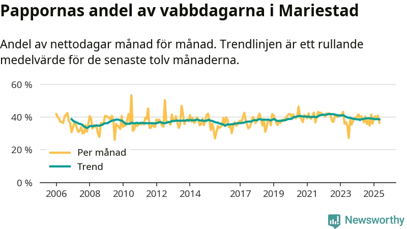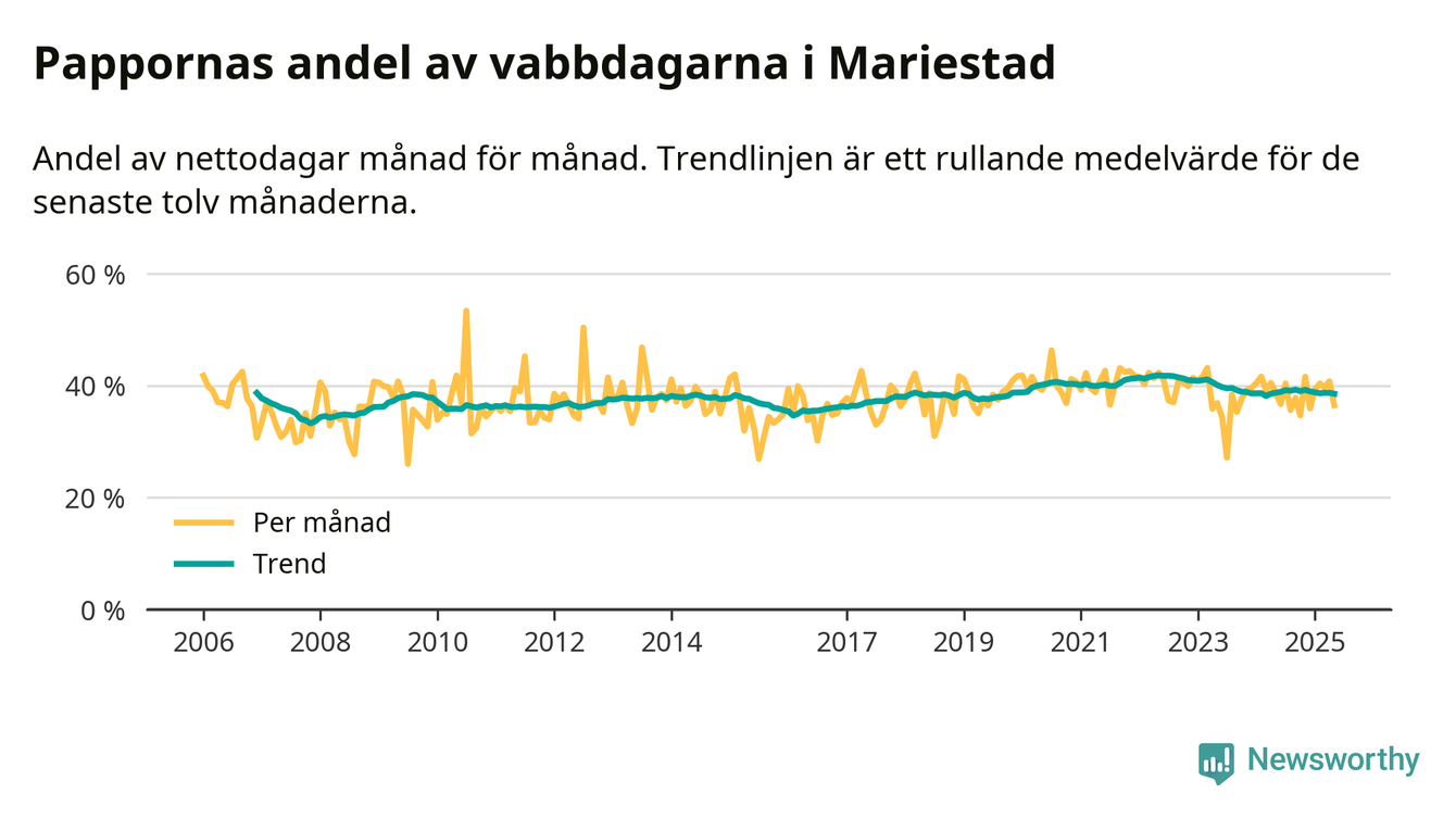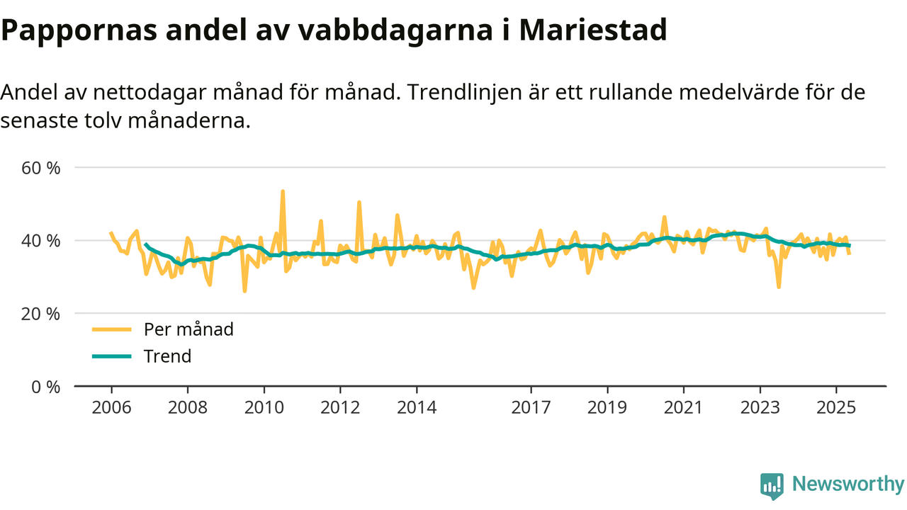 Mariestad ligger en bit från ett jämställt uttag. Under de senaste tolv månaderna har männen stått för 39 procent av all vabb i kommunen. Pappornas uttag peakade våren 2022 då kommunens fäder var uppe i 42 procent av vabbdagarna 1.