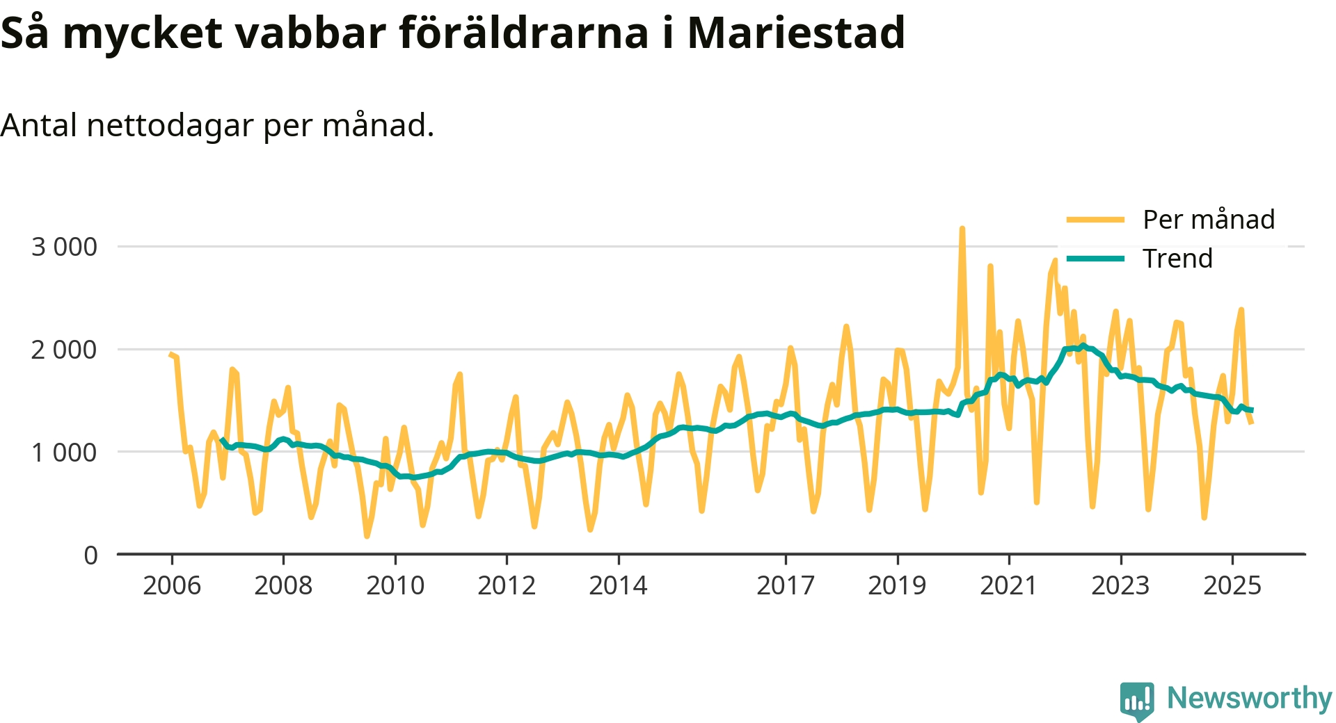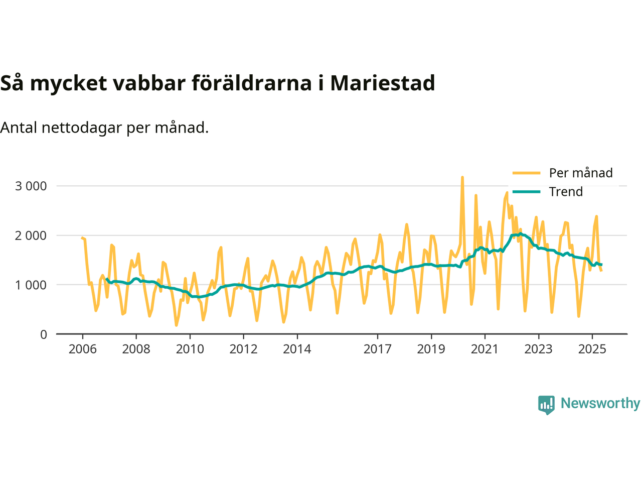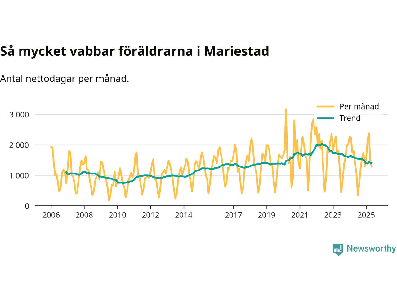 När coronapandemin drog in i mars 2020 peakade antalet vabbdagar både i Mariestads kommun och i riket som helhet. Under de senaste två åren har vabbuttaget börjat minska igen.