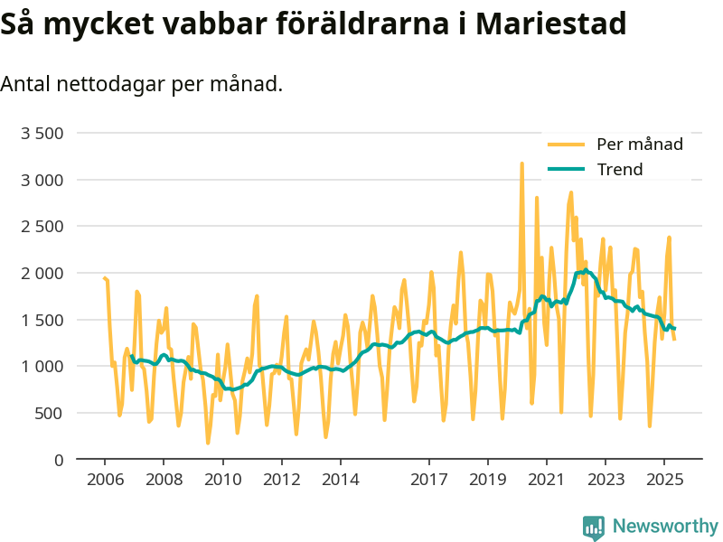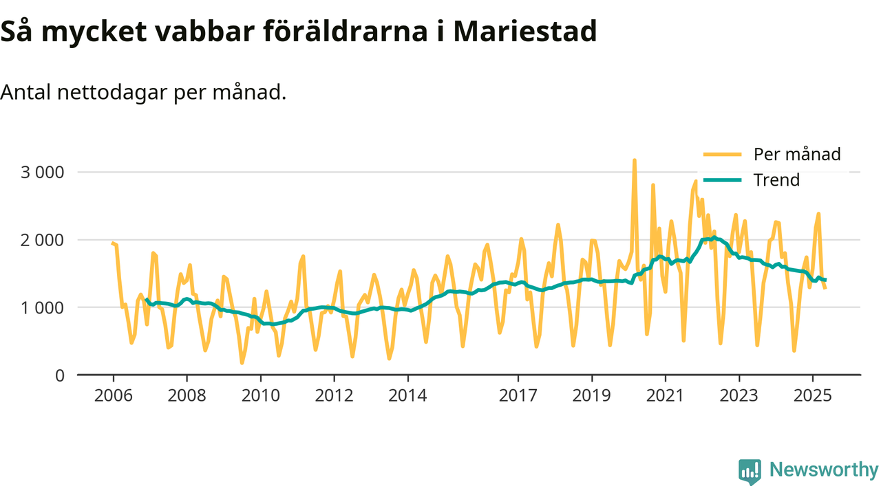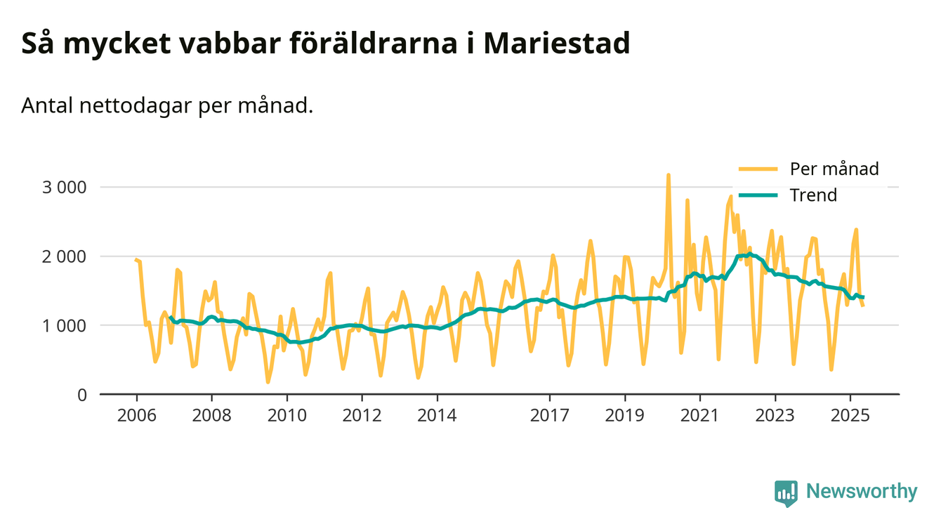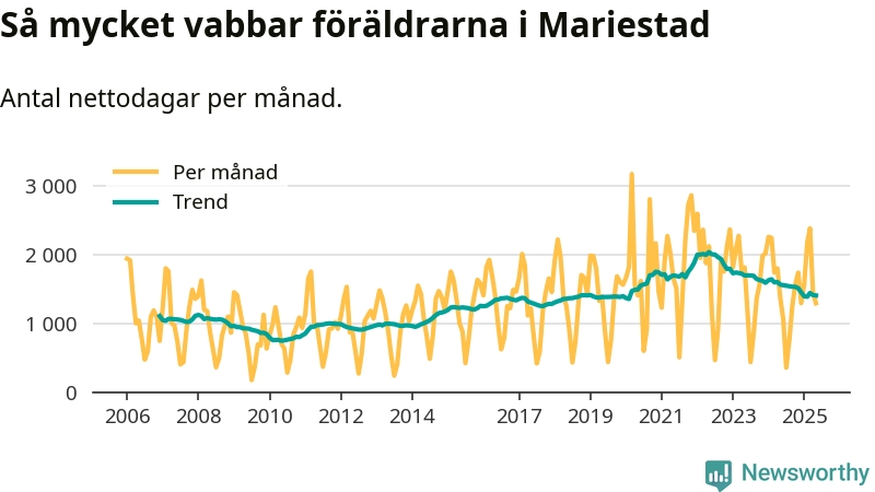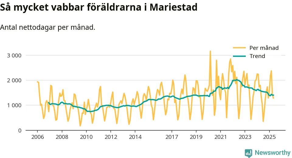 När coronapandemin drog in i mars 2020 peakade antalet vabbdagar både i Mariestads kommun och i riket som helhet. Under de senaste två åren har vabbuttaget börjat minska igen.