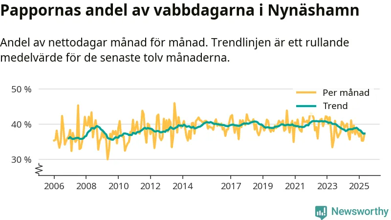 Nynäshamn ligger en bit från ett jämställt uttag. Under de senaste tolv månaderna har männen stått för 37 procent av all vabb i kommunen. I år har andelen varit lägre än på över 14 år.