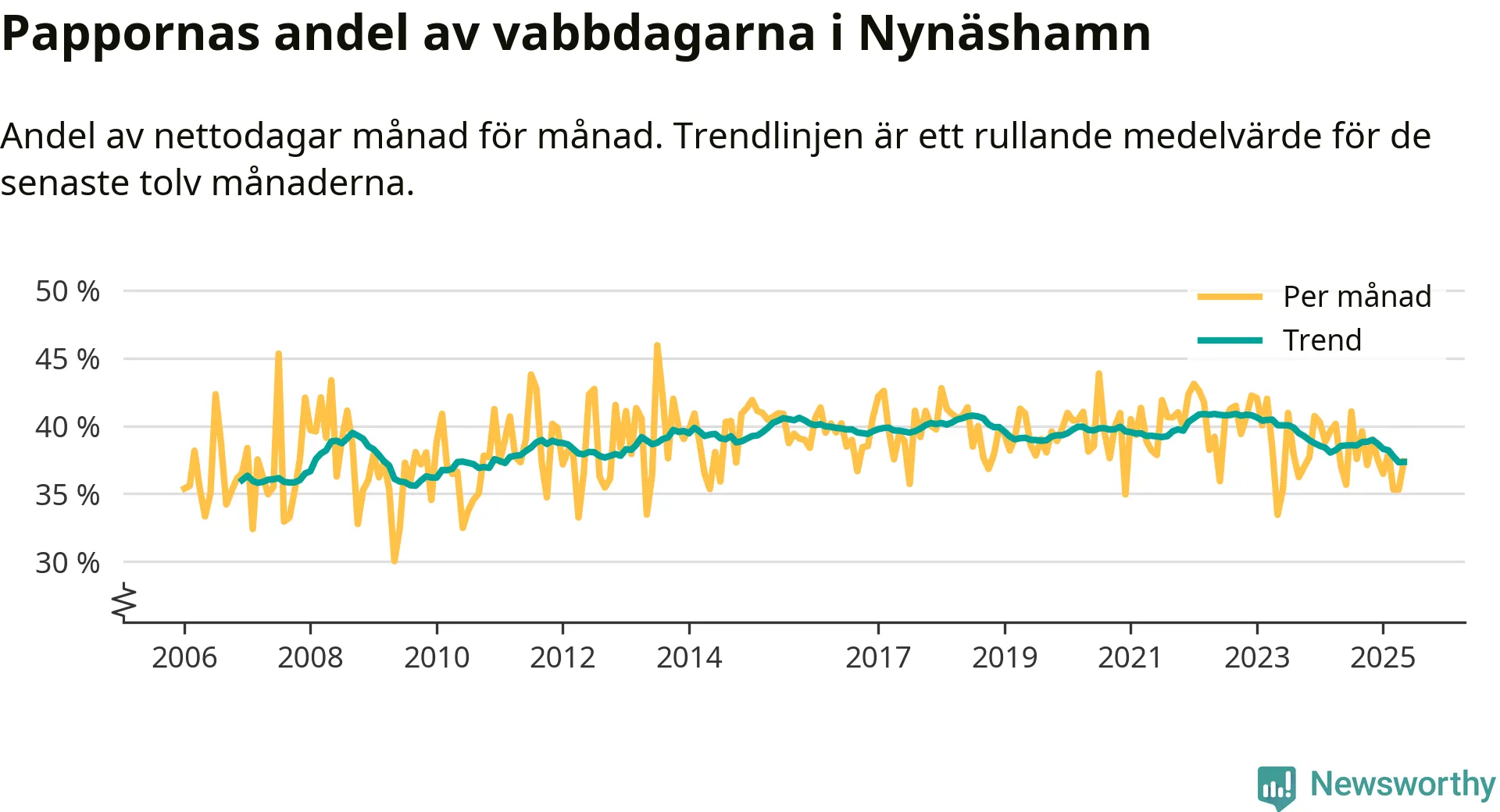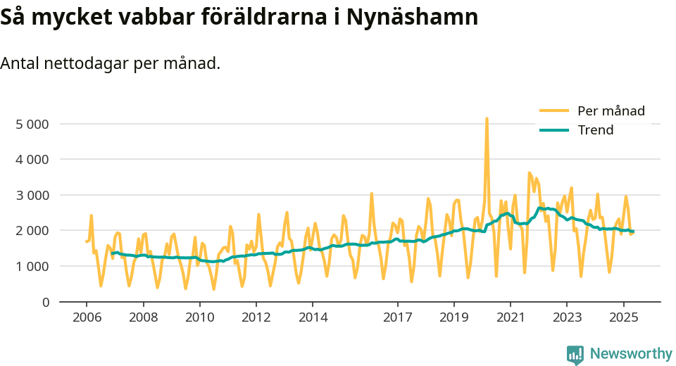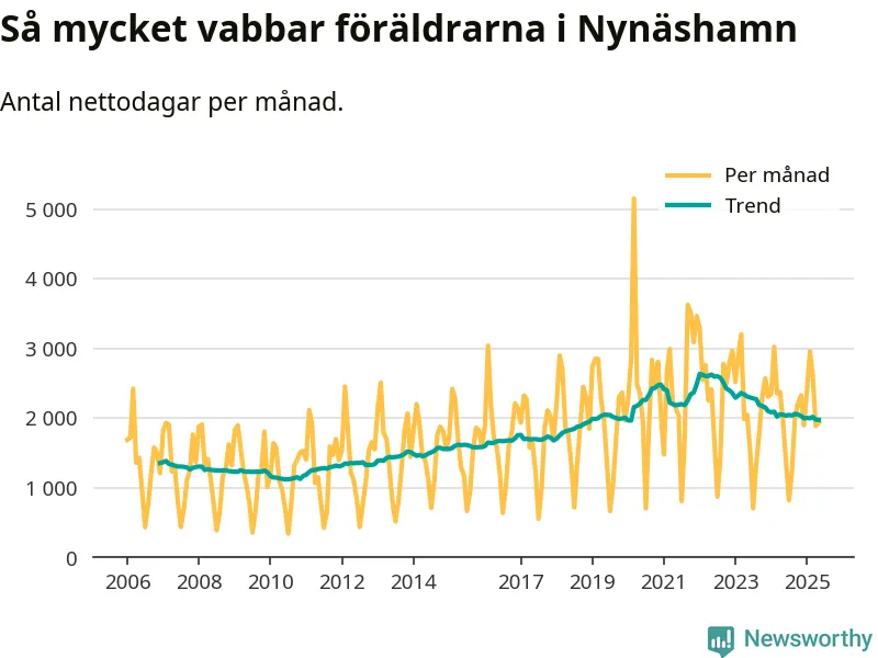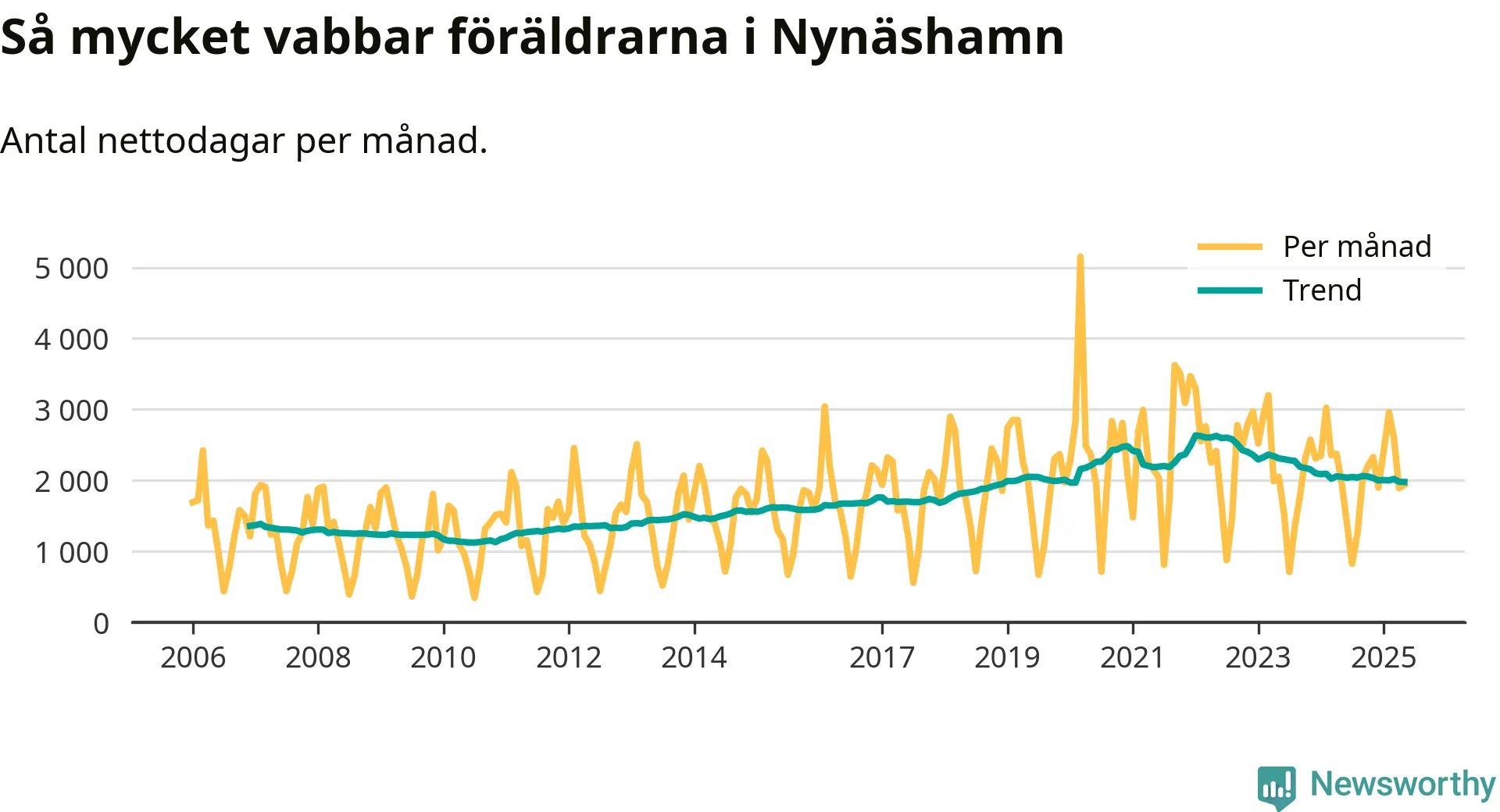 När coronapandemin drog in i mars 2020 peakade antalet vabbdagar både i Nynäshamns kommun och i riket som helhet. Under de senaste två åren har vabbuttaget börjat minska igen.