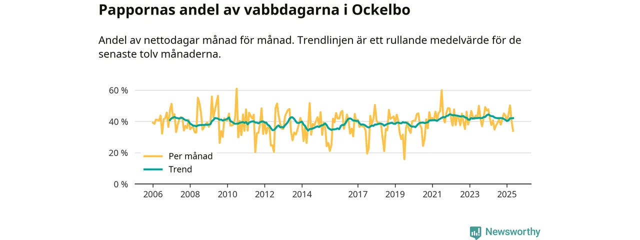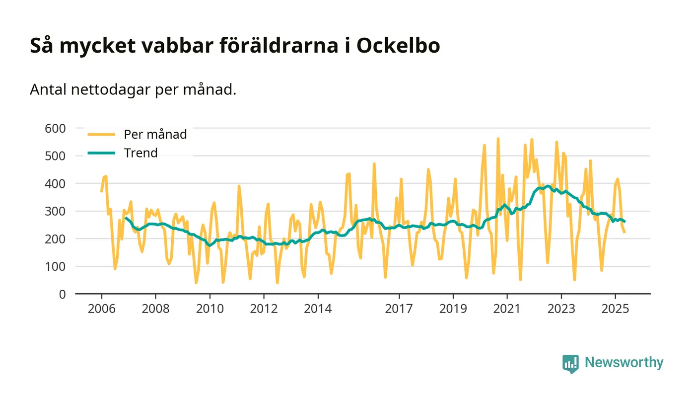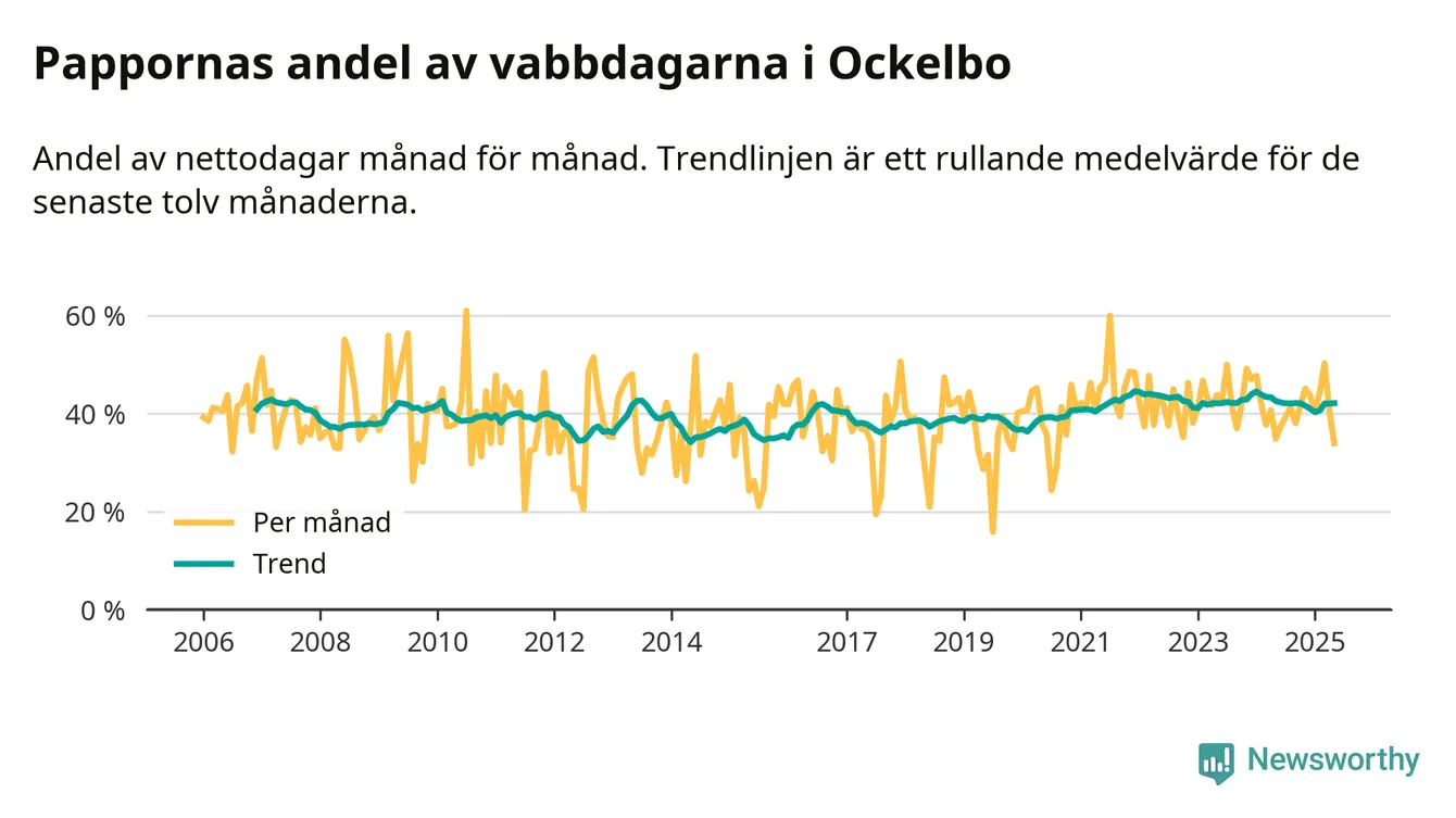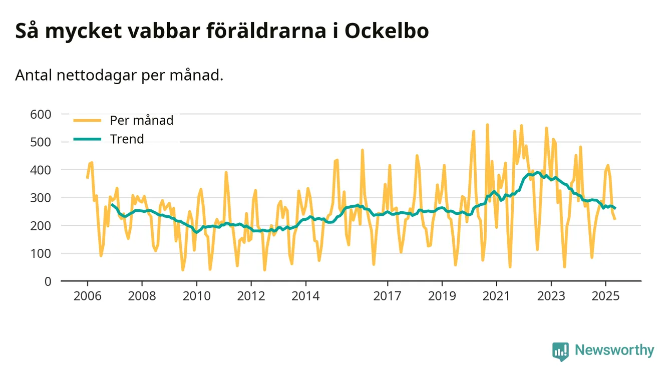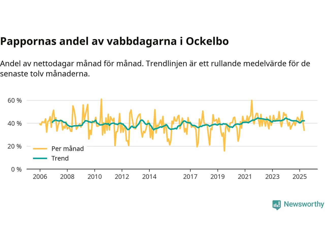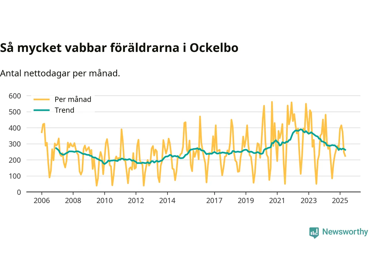 Ockelbo ligger en bit från ett jämställt uttag. Under de senaste tolv månaderna har männen stått för 42 procent av all vabb i kommunen. Pappornas uttag peakade vintern 2021 då kommunens fäder var uppe i 45 procent av vabbdagarna 1.