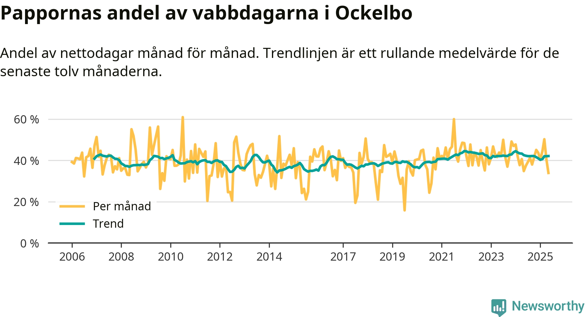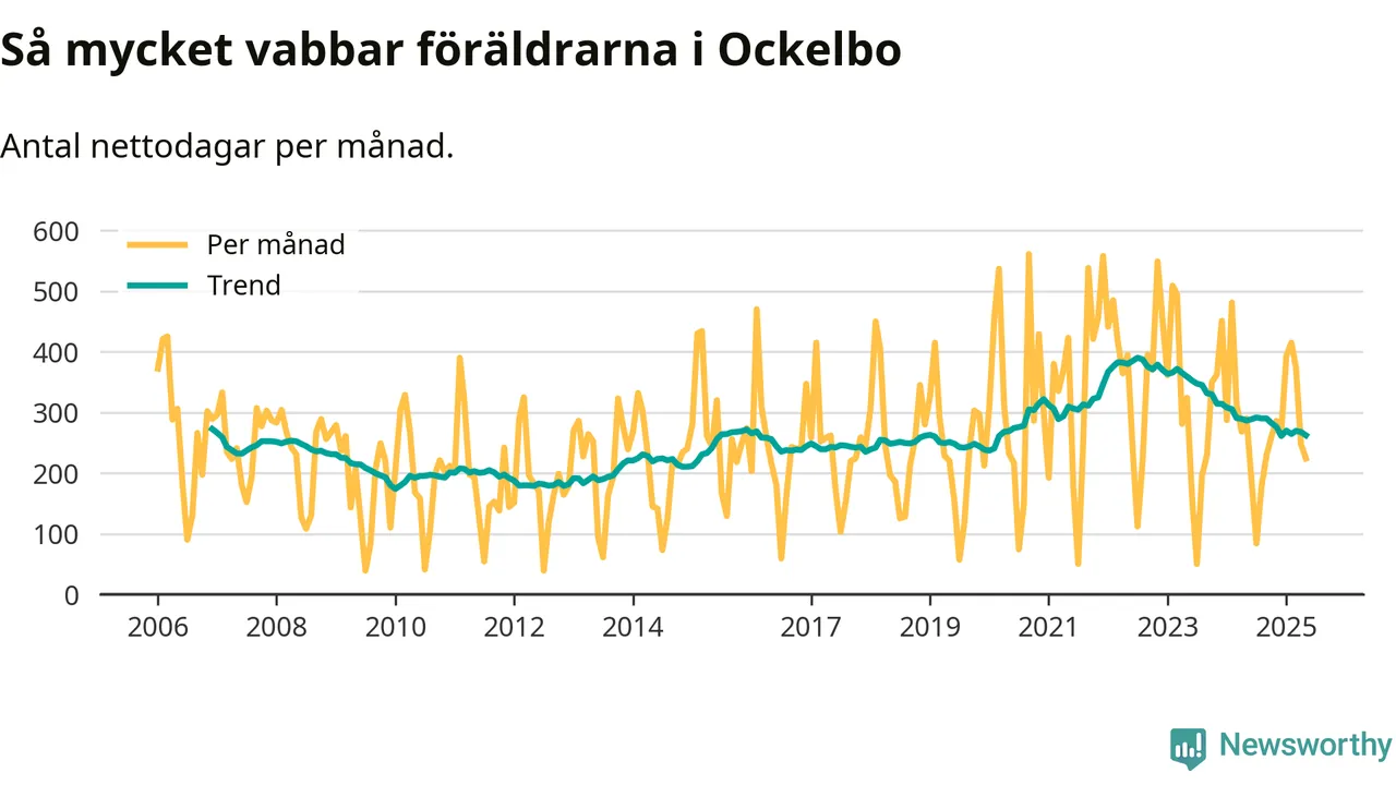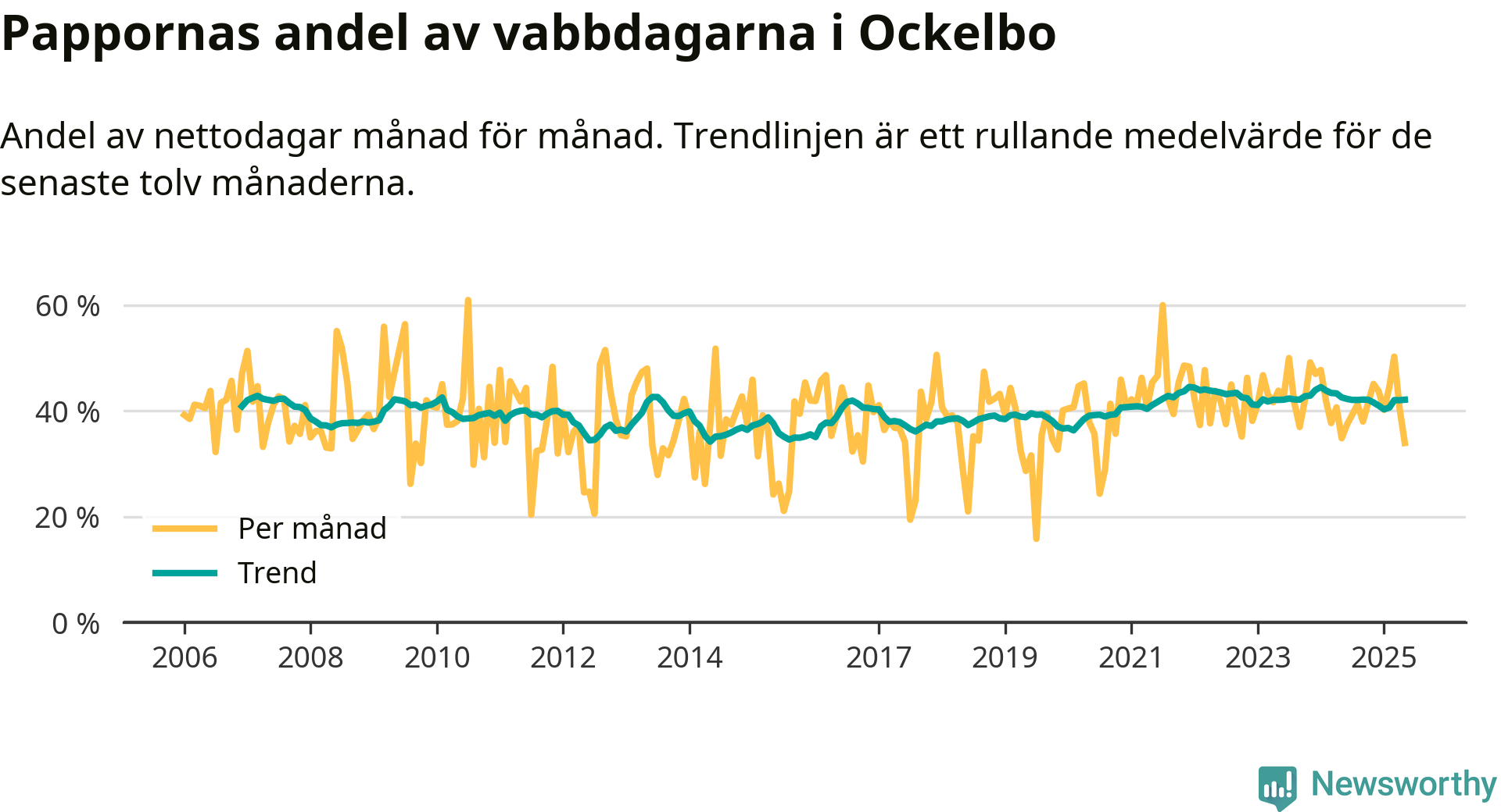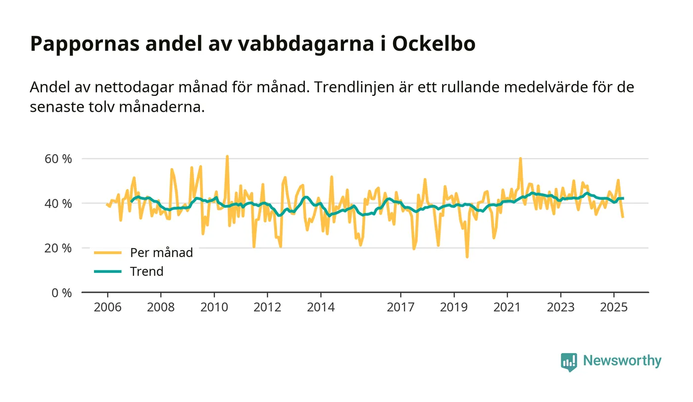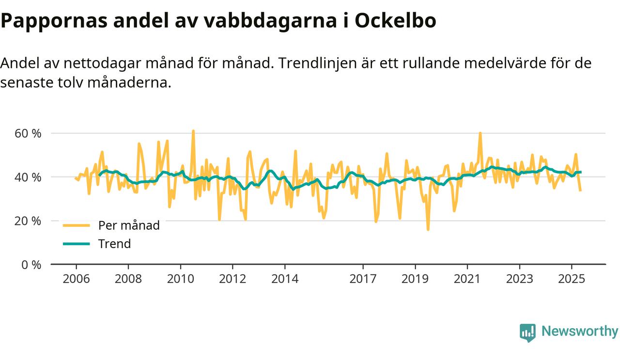Ockelbo ligger en bit från ett jämställt uttag. Under de senaste tolv månaderna har männen stått för 42 procent av all vabb i kommunen. Pappornas uttag peakade vintern 2021 då kommunens fäder var uppe i 45 procent av vabbdagarna 1.