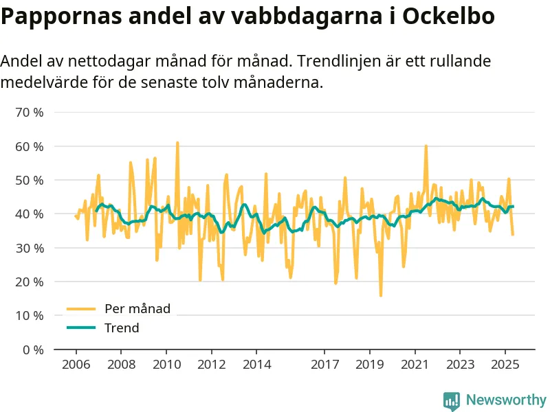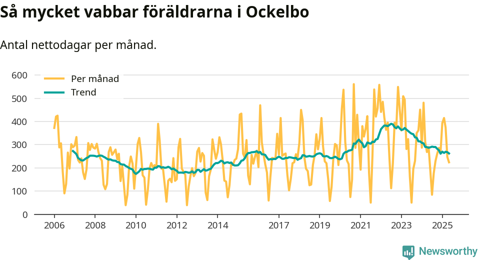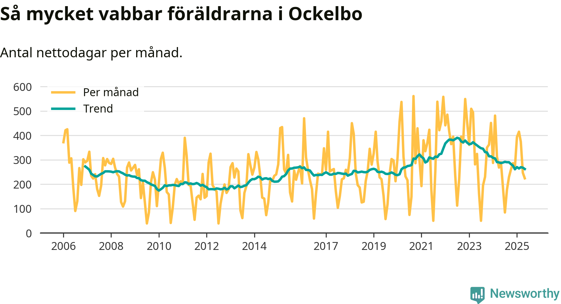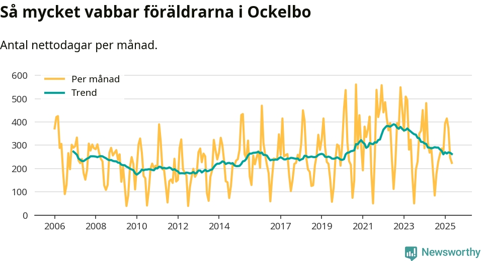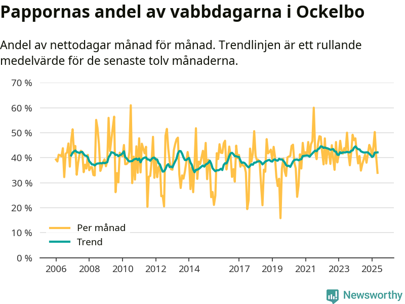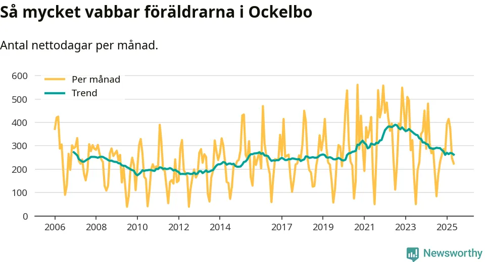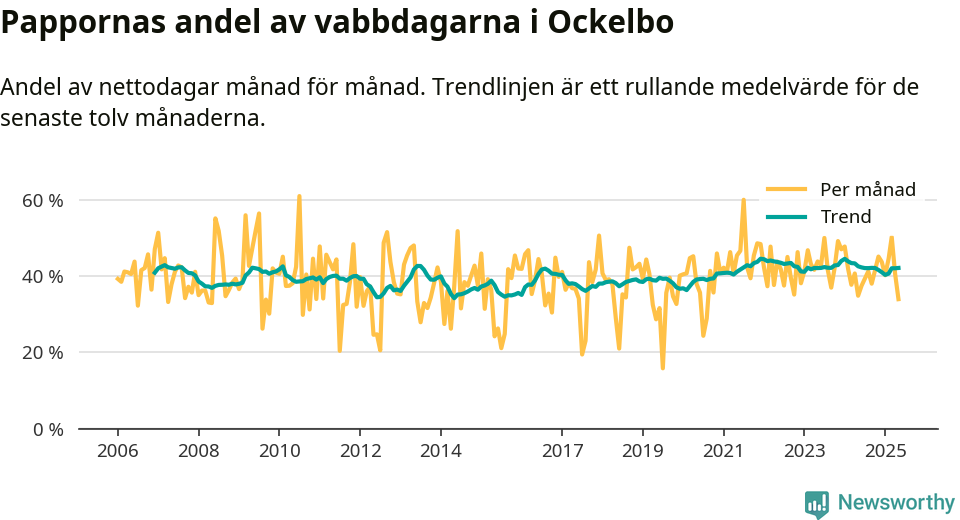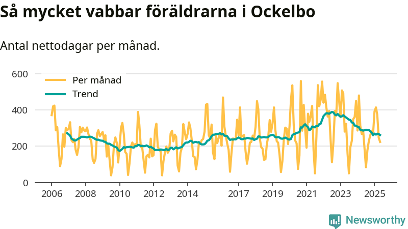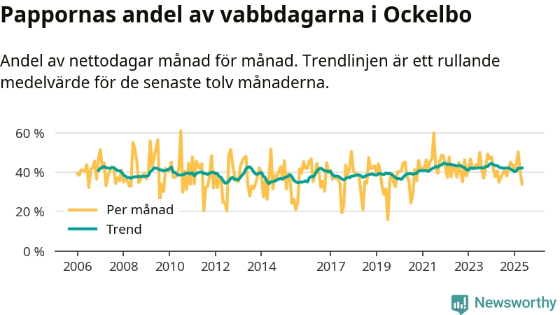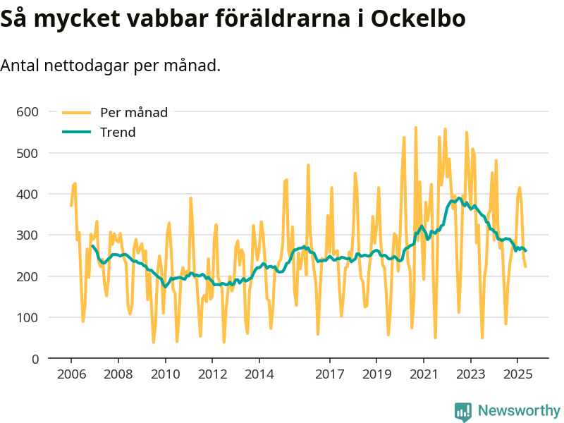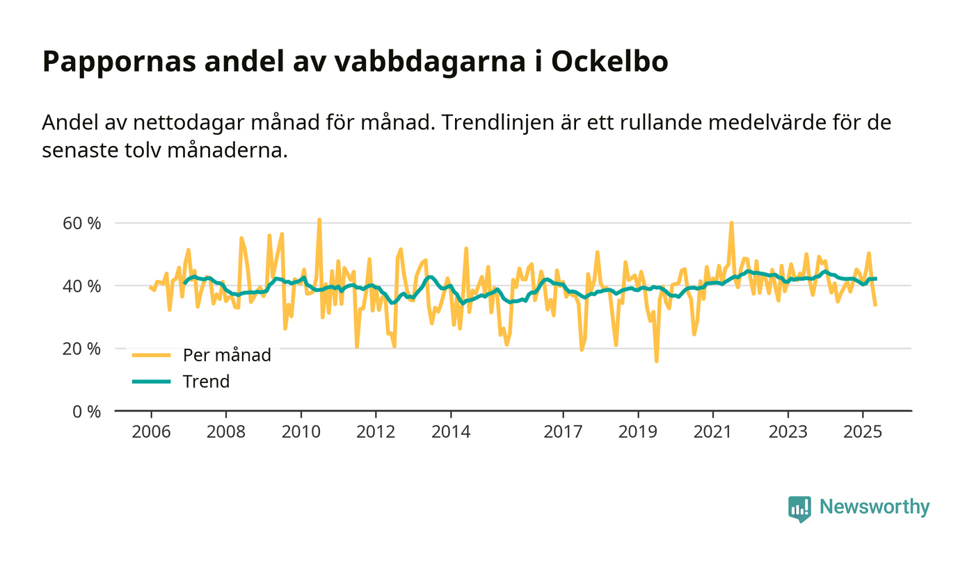 Ockelbo ligger en bit från ett jämställt uttag. Under de senaste tolv månaderna har männen stått för 42 procent av all vabb i kommunen. Pappornas uttag peakade vintern 2021 då kommunens fäder var uppe i 45 procent av vabbdagarna 1.