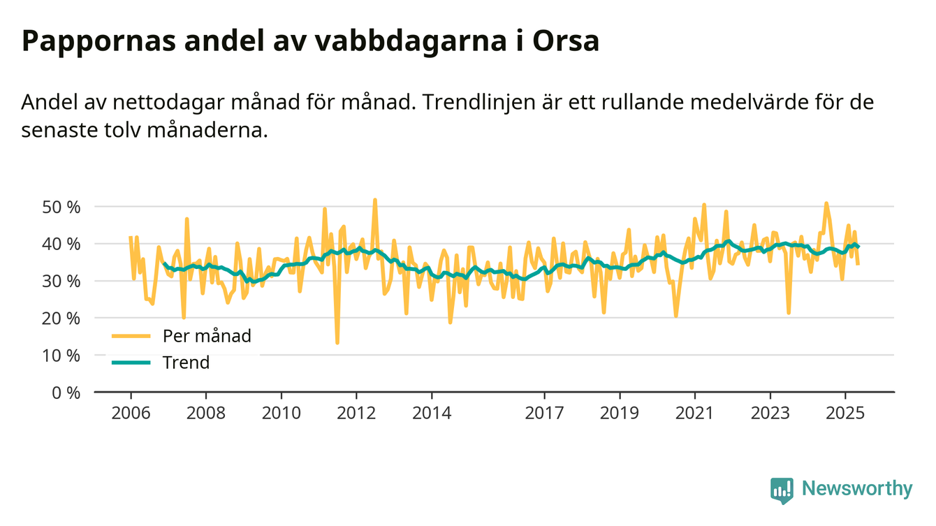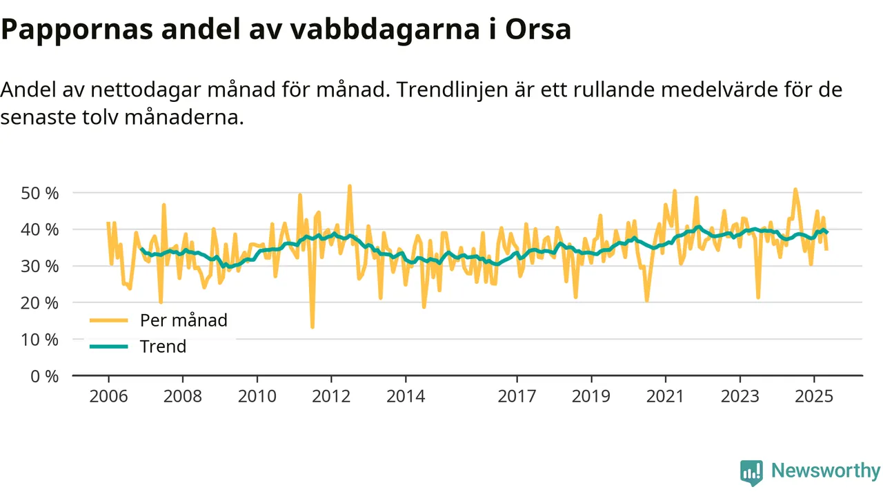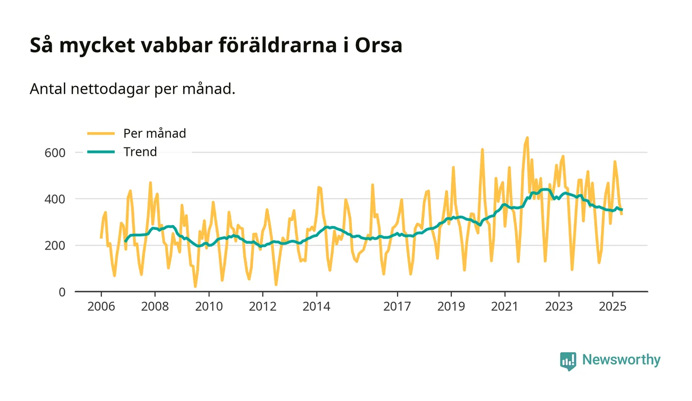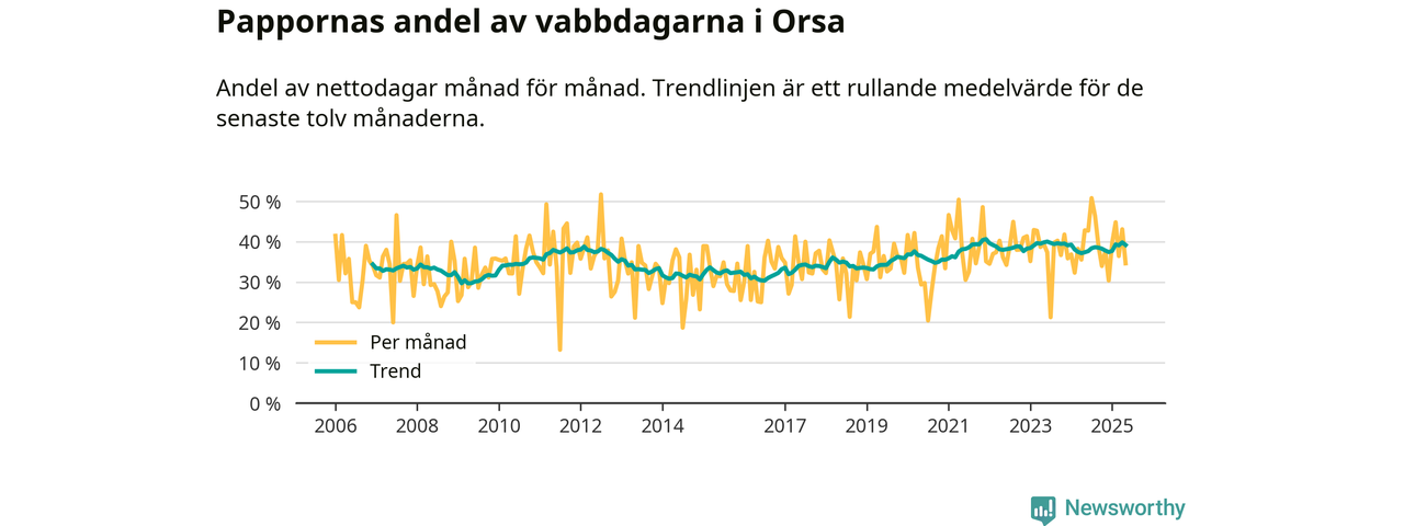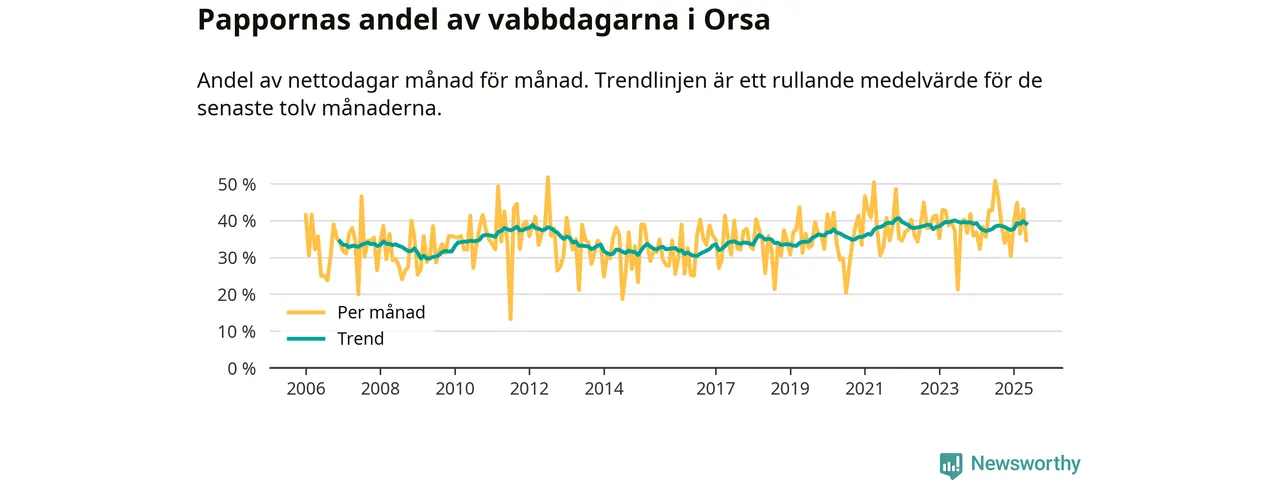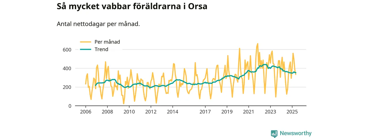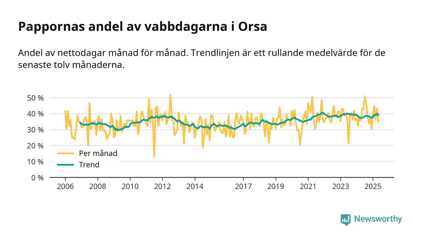 Orsa ligger en bit från ett jämställt uttag. Under de senaste tolv månaderna har männen stått för 39 procent av all vabb i kommunen.