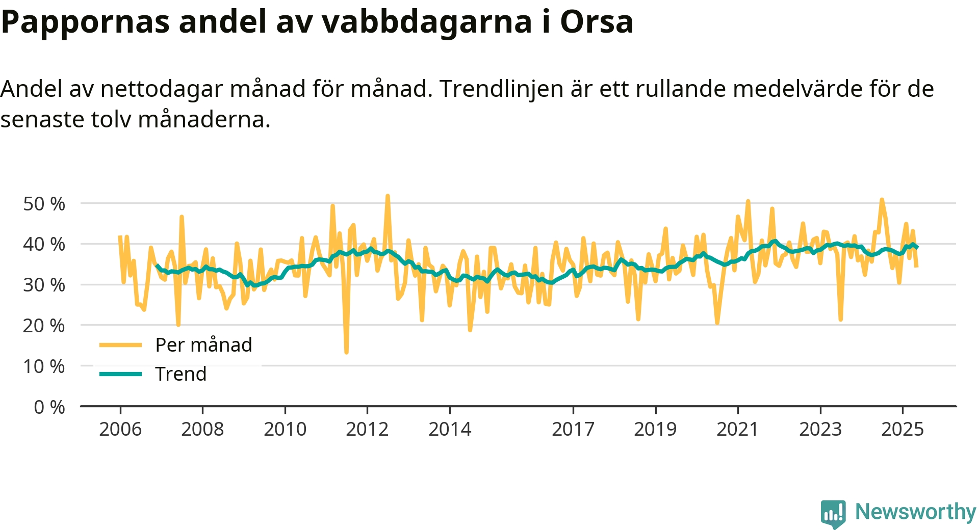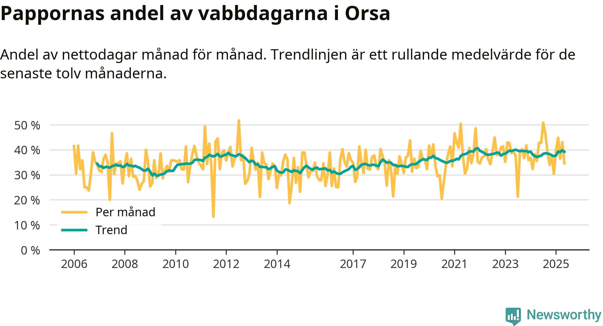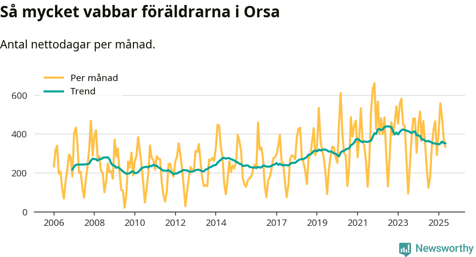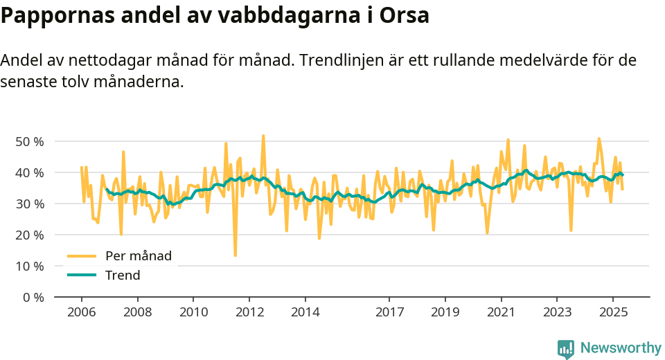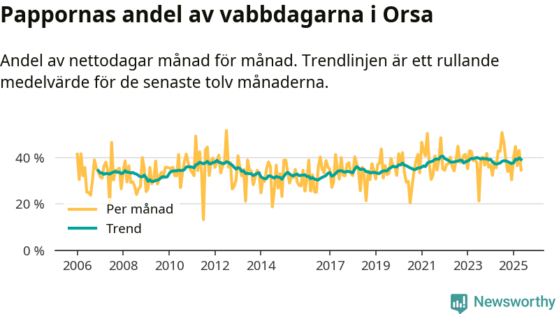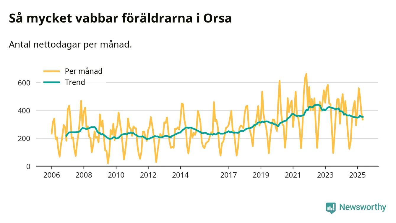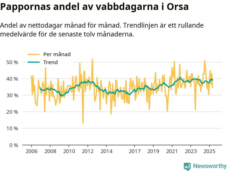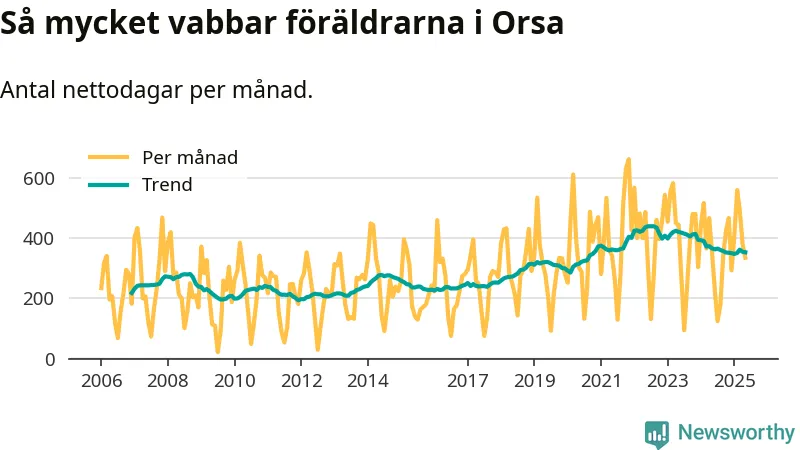 Orsa ligger en bit från ett jämställt uttag. Under de senaste tolv månaderna har männen stått för 39 procent av all vabb i kommunen.