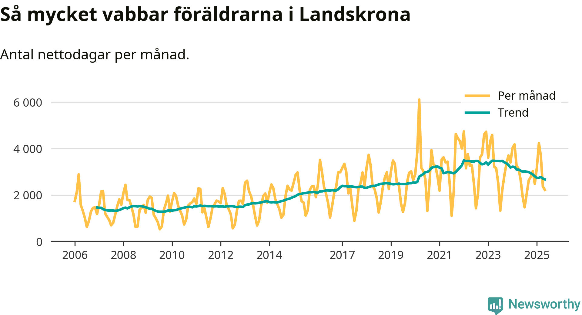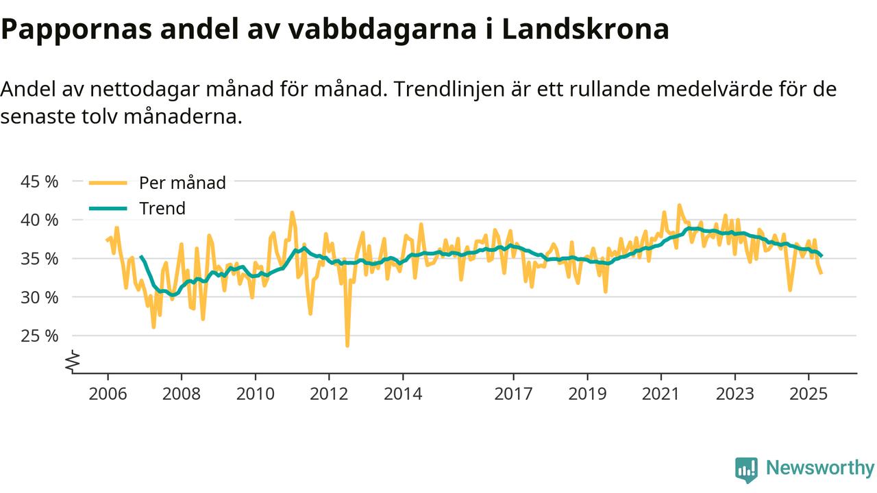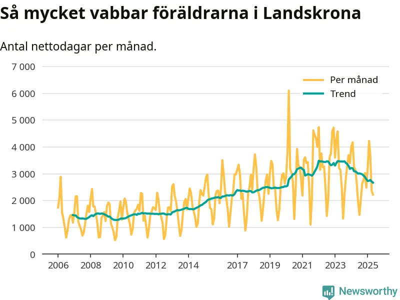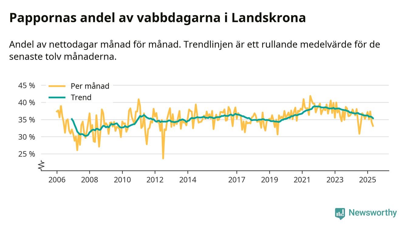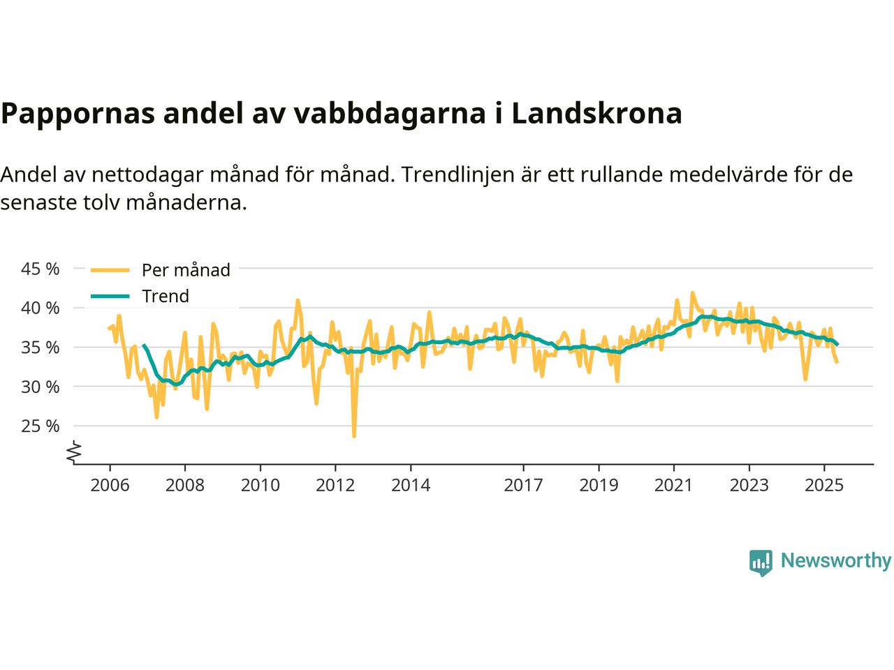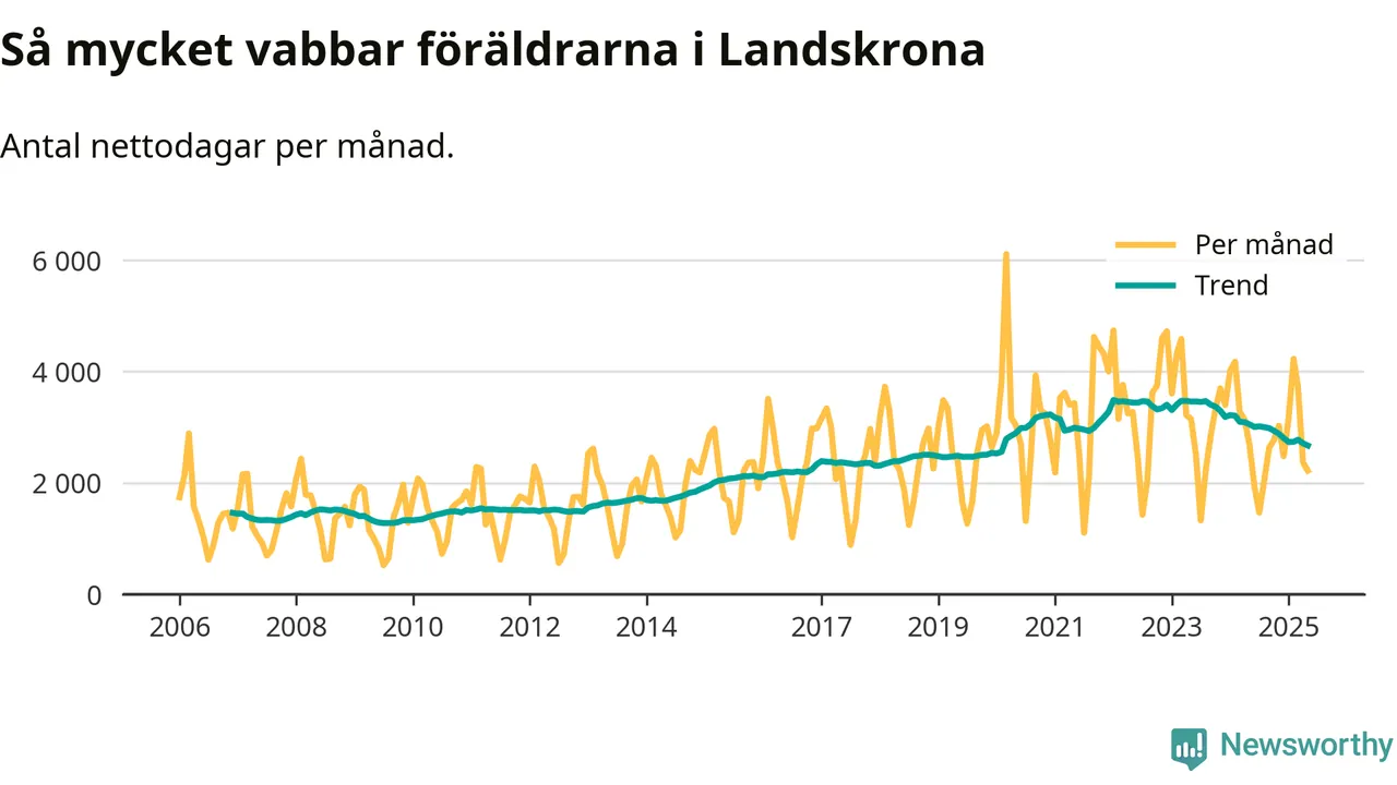 När coronapandemin drog in i mars 2020 peakade antalet vabbdagar både i Landskrona kommun och i riket som helhet. Under de senaste två åren har vabbuttaget börjat minska igen.