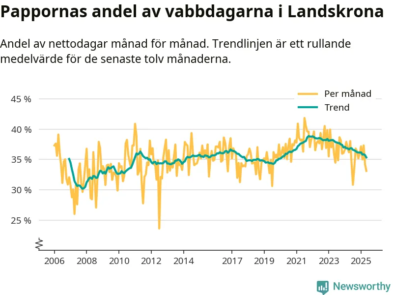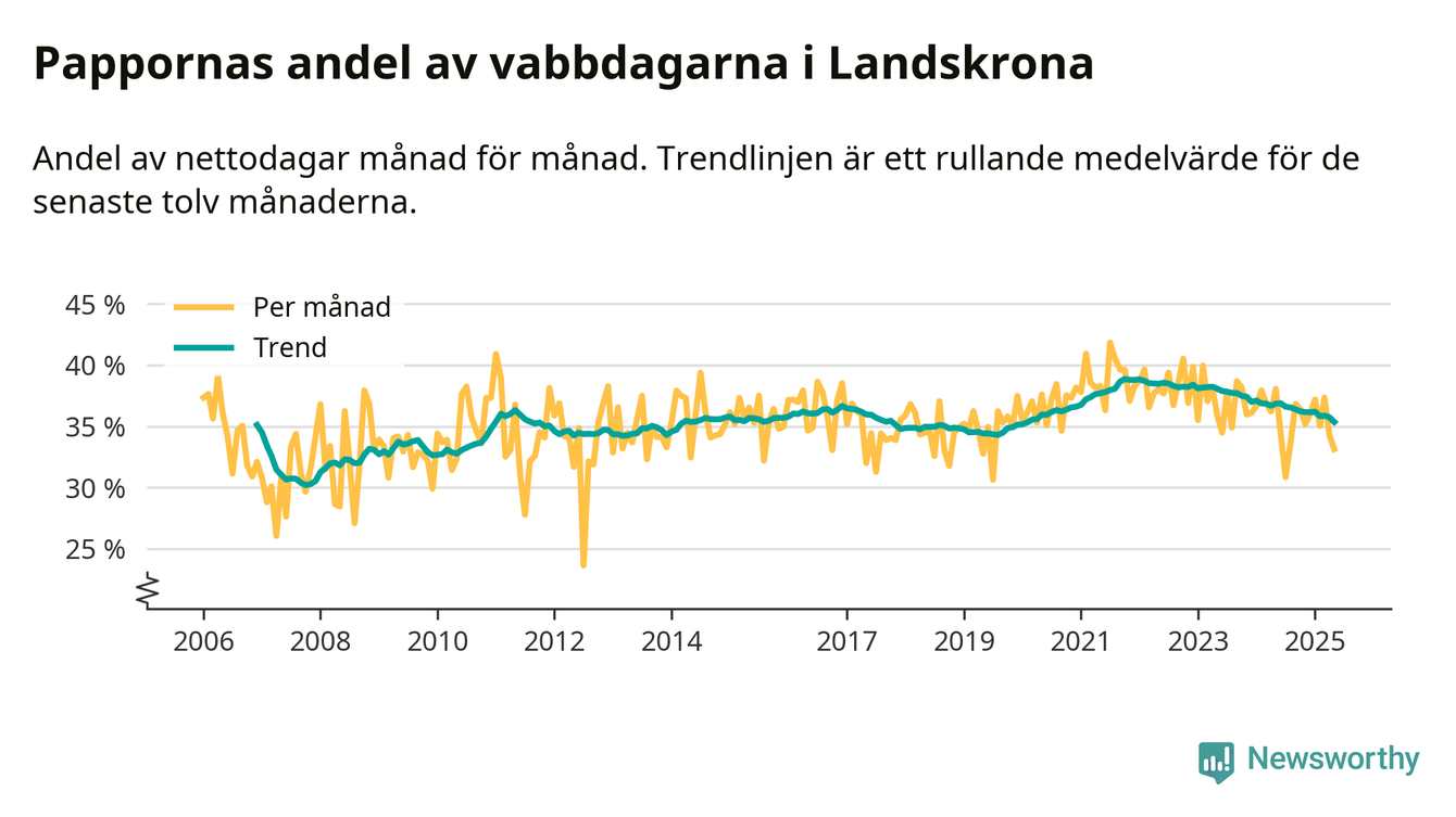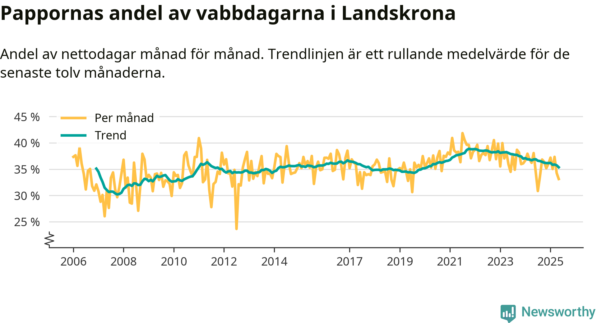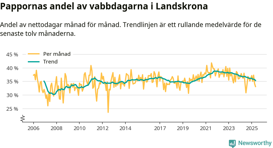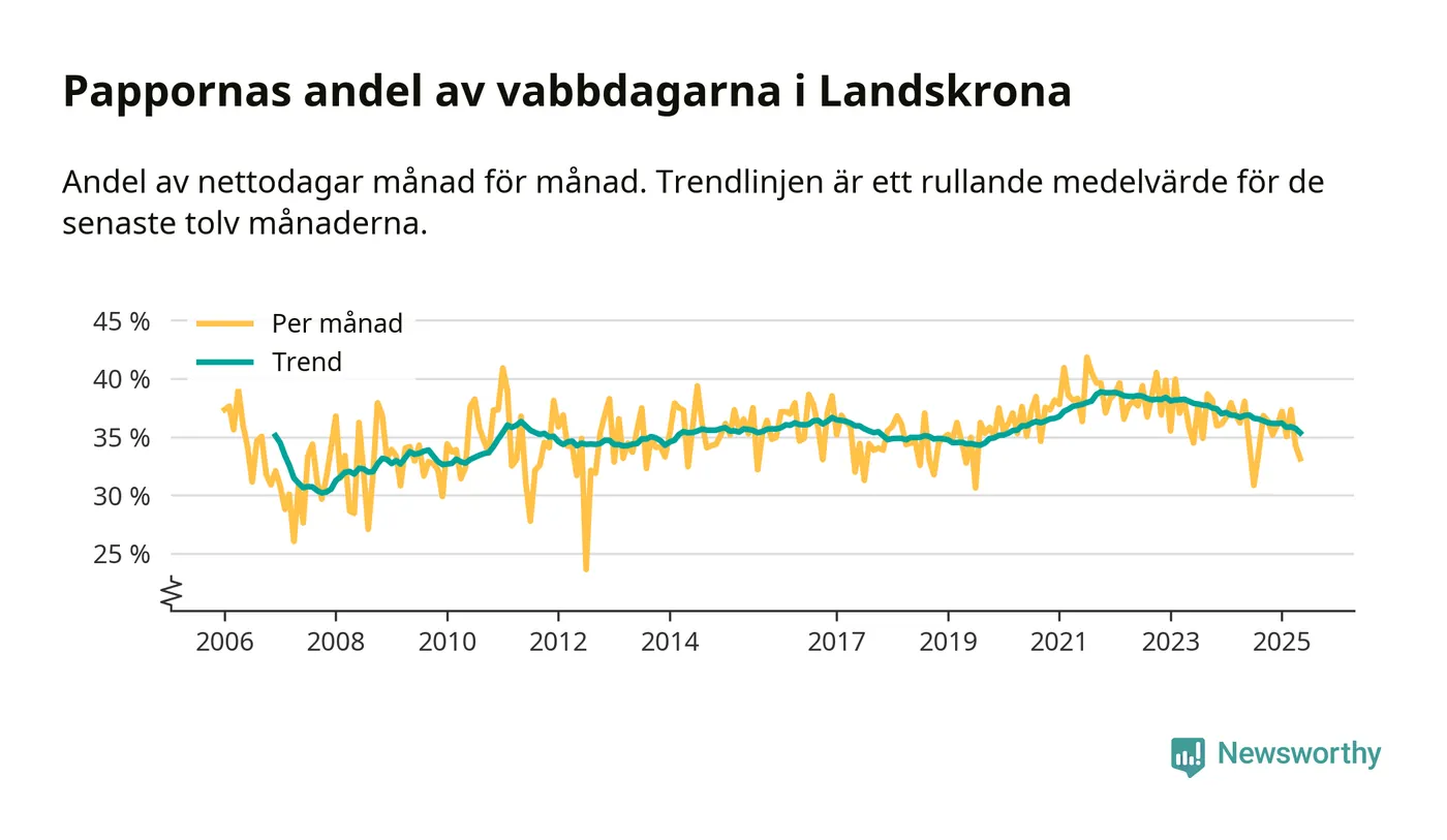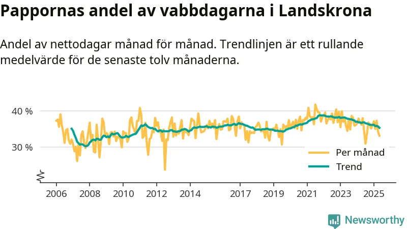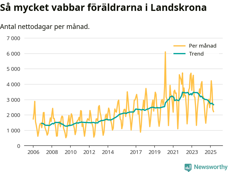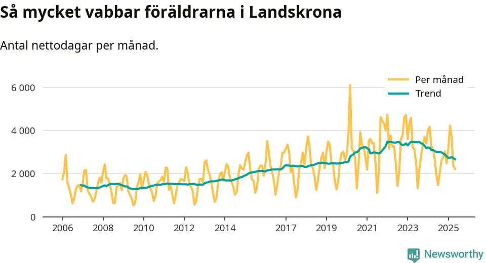 När coronapandemin drog in i mars 2020 peakade antalet vabbdagar både i Landskrona kommun och i riket som helhet. Under de senaste två åren har vabbuttaget börjat minska igen.