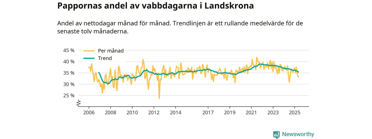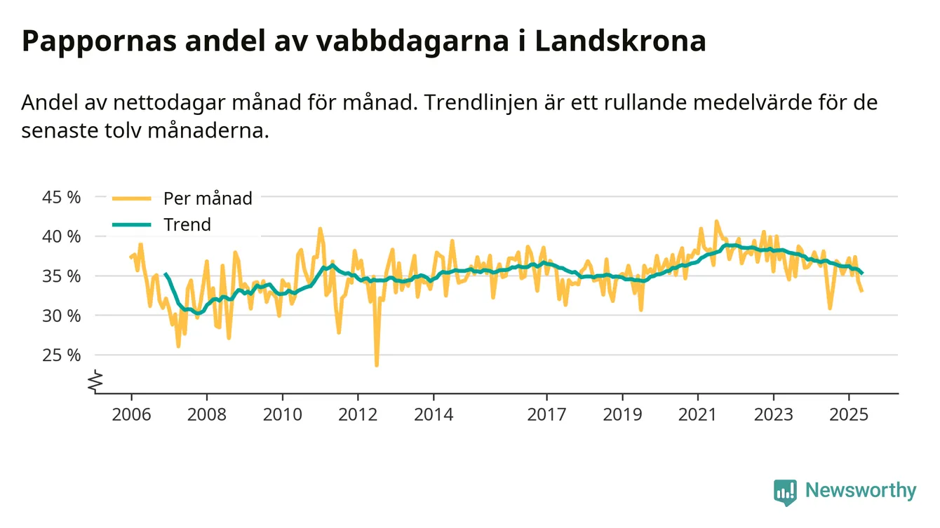 Landskrona ligger en bit från ett jämställt uttag. Under de senaste tolv månaderna har männen stått för 35 procent av all vabb i kommunen. Det är en lägre andel än på över fem år.