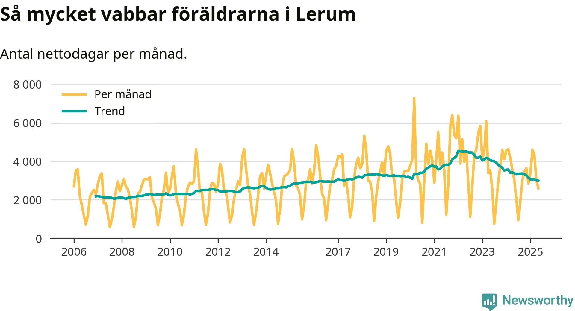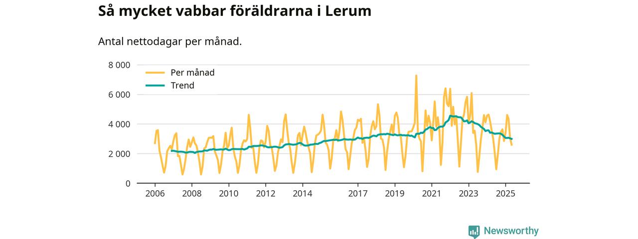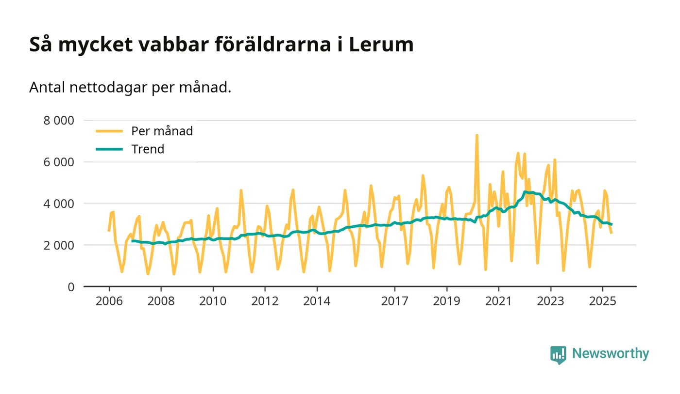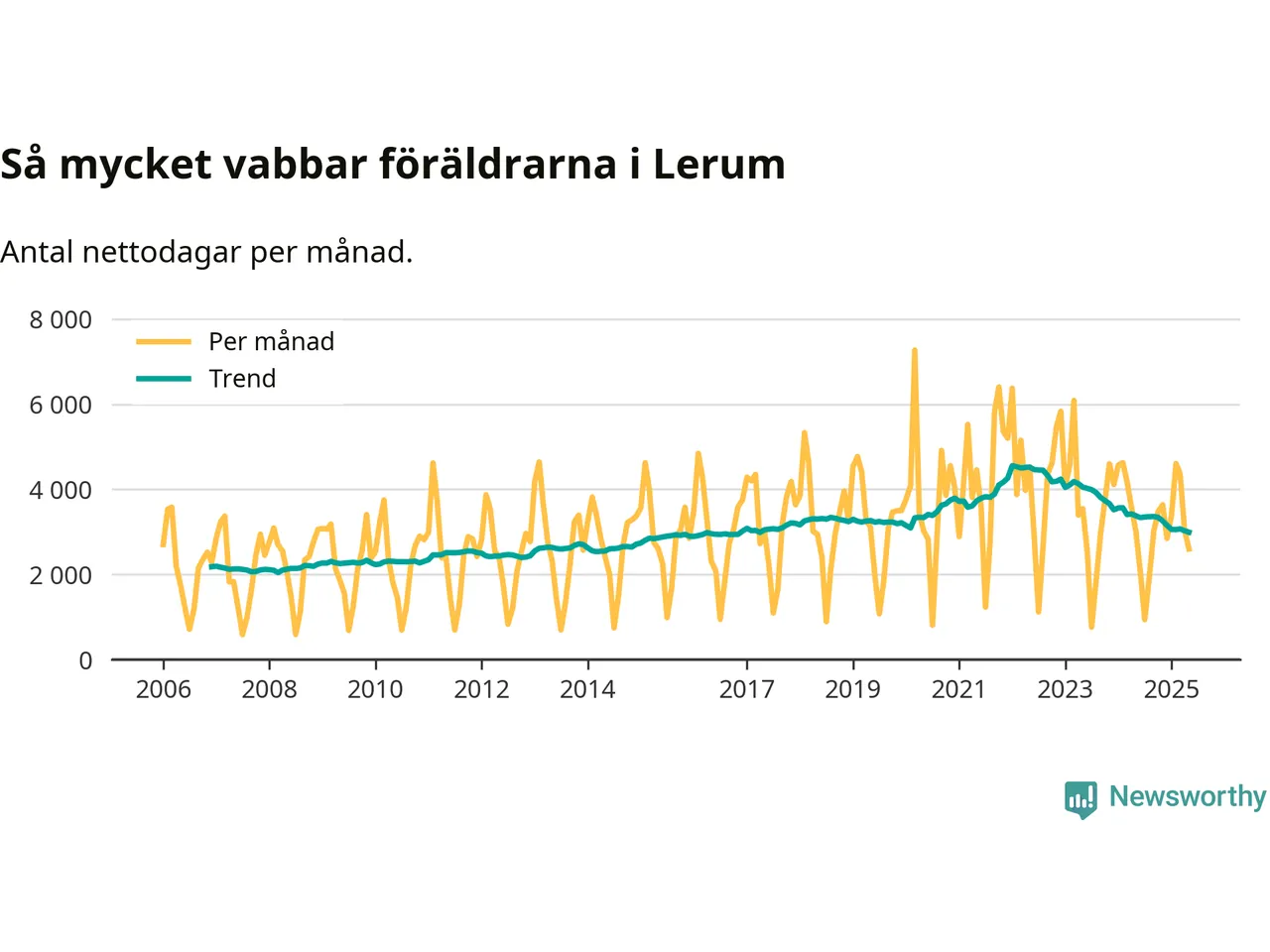 När coronapandemin drog in i mars 2020 peakade antalet vabbdagar både i Lerums kommun och i riket som helhet. Under de senaste två åren har vabbuttaget börjat minska igen.