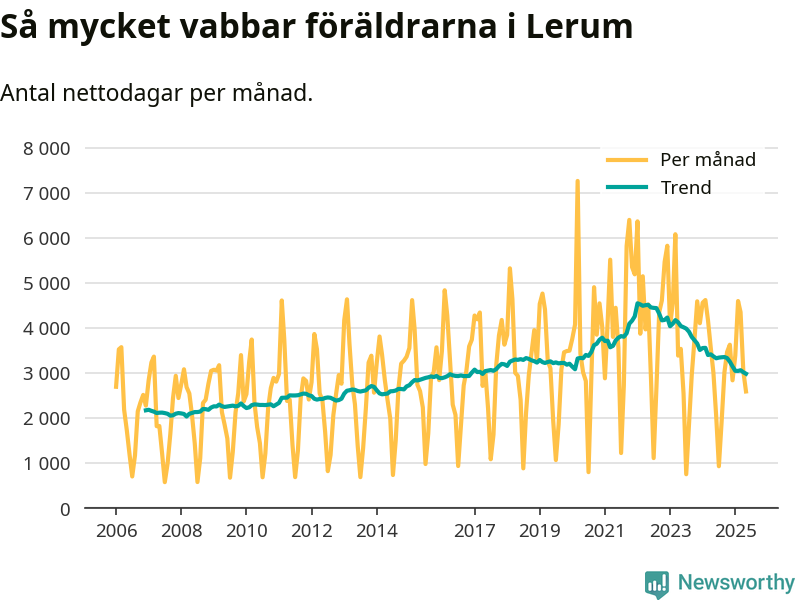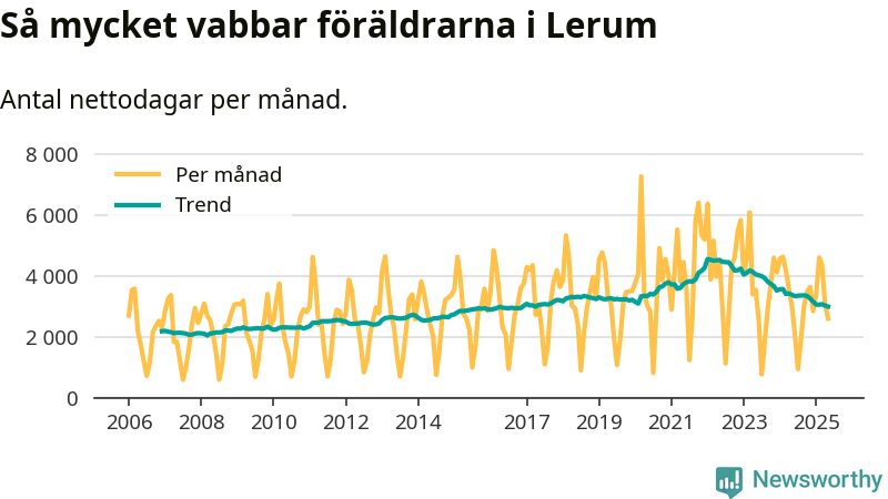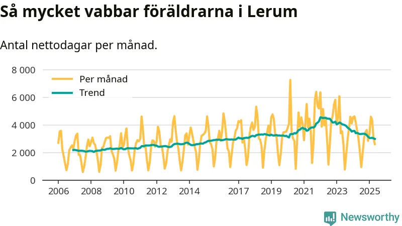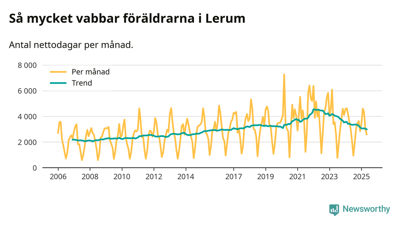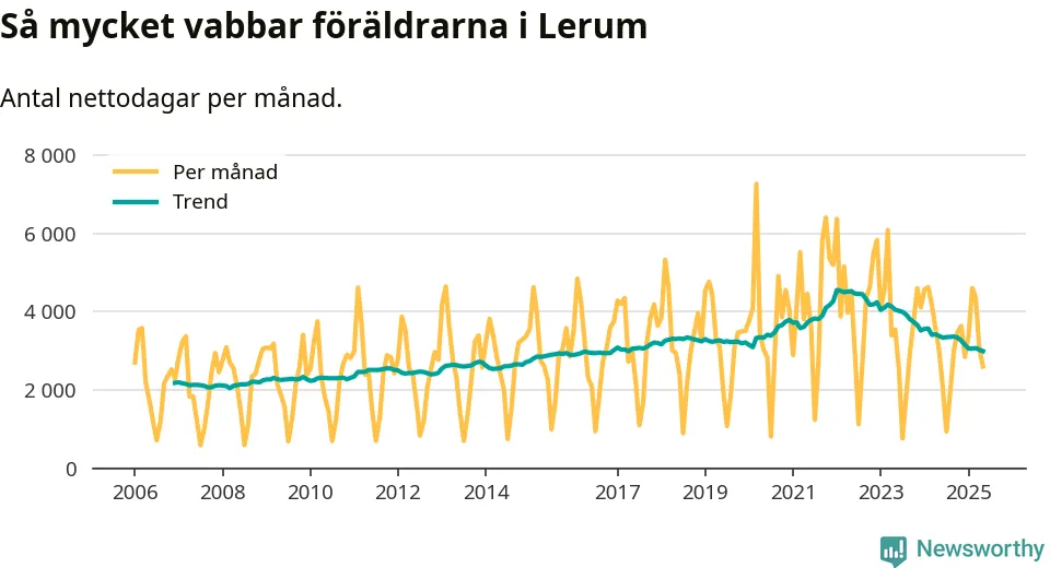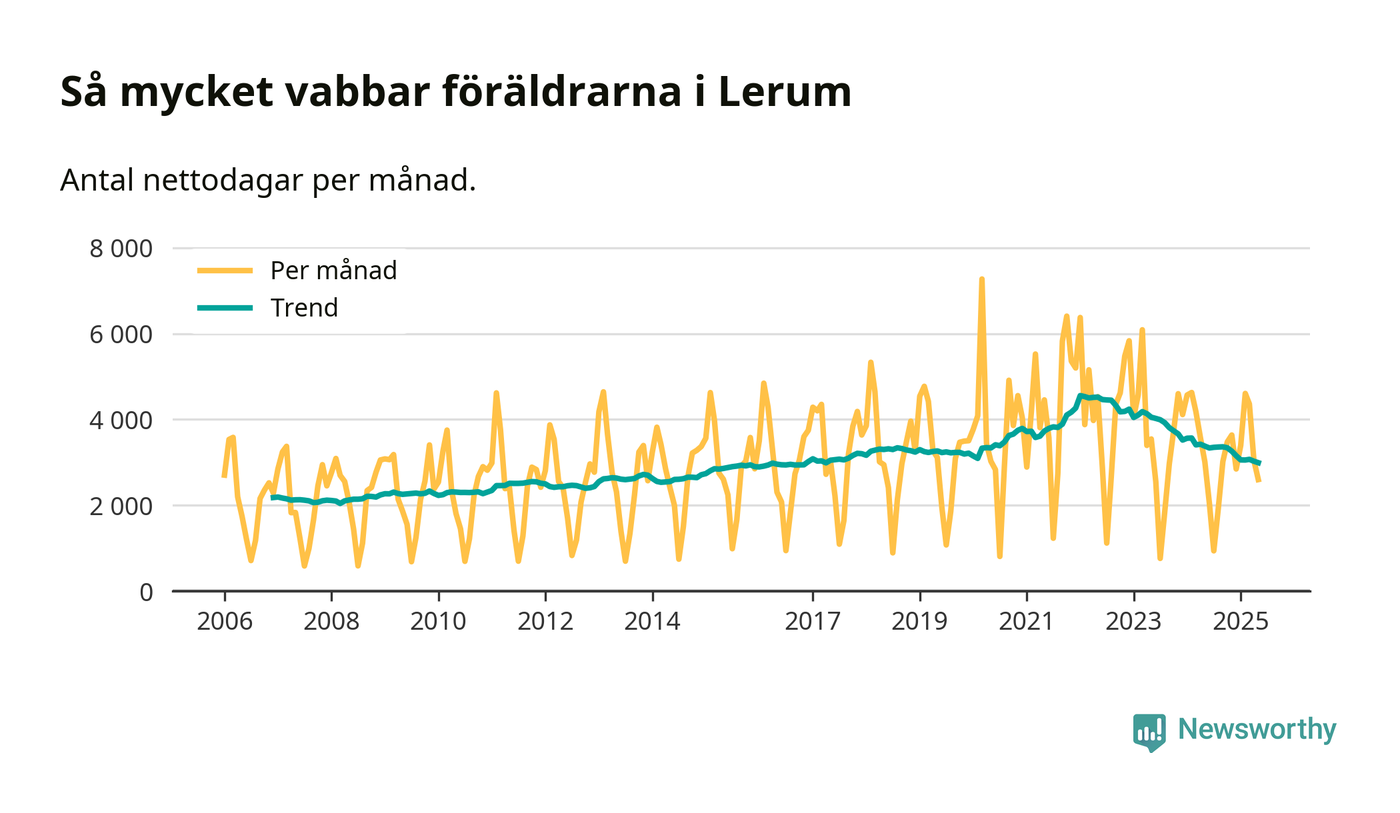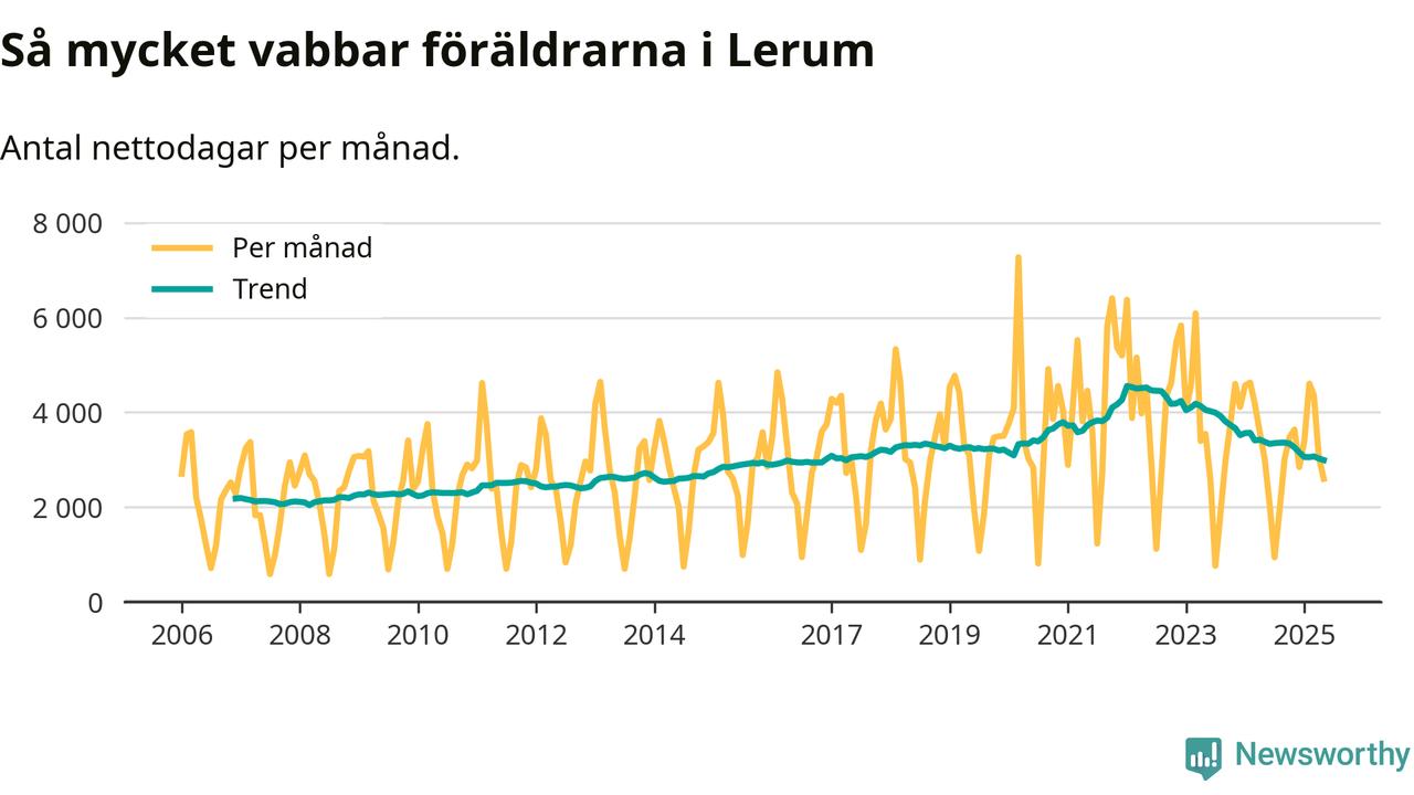 När coronapandemin drog in i mars 2020 peakade antalet vabbdagar både i Lerums kommun och i riket som helhet. Under de senaste två åren har vabbuttaget börjat minska igen.