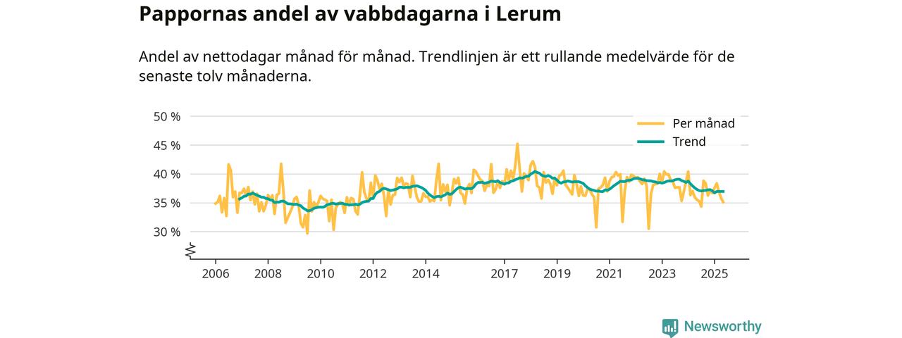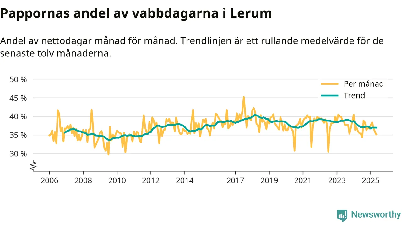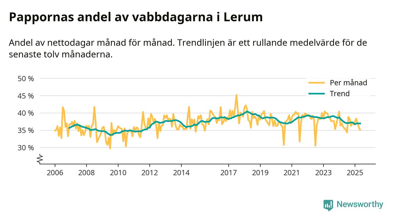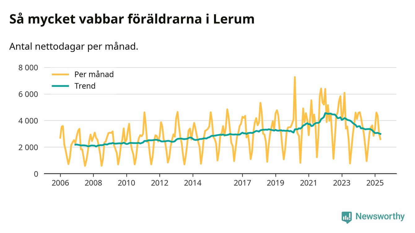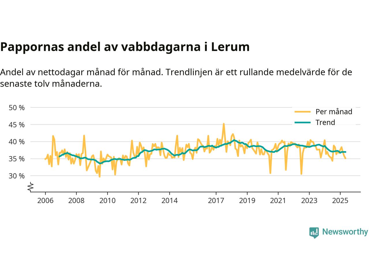 Lerum ligger en bit från ett jämställt uttag. Under de senaste tolv månaderna har männen stått för 37 procent av all vabb i kommunen. I år har andelen varit lägre än på nästan fem år.
