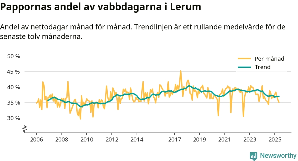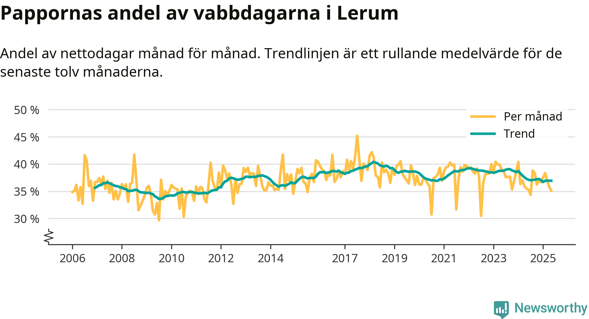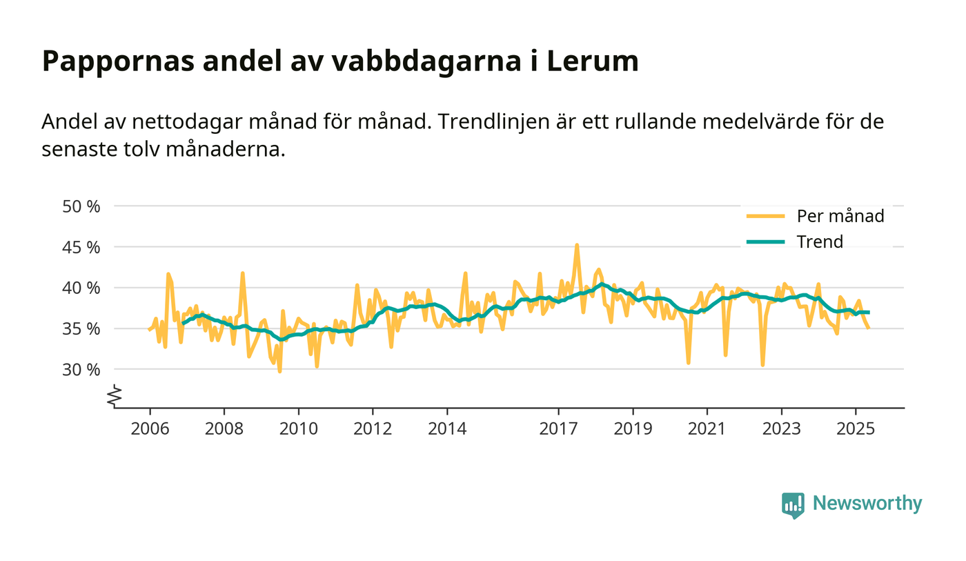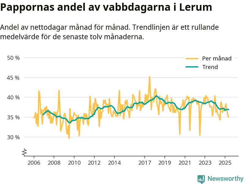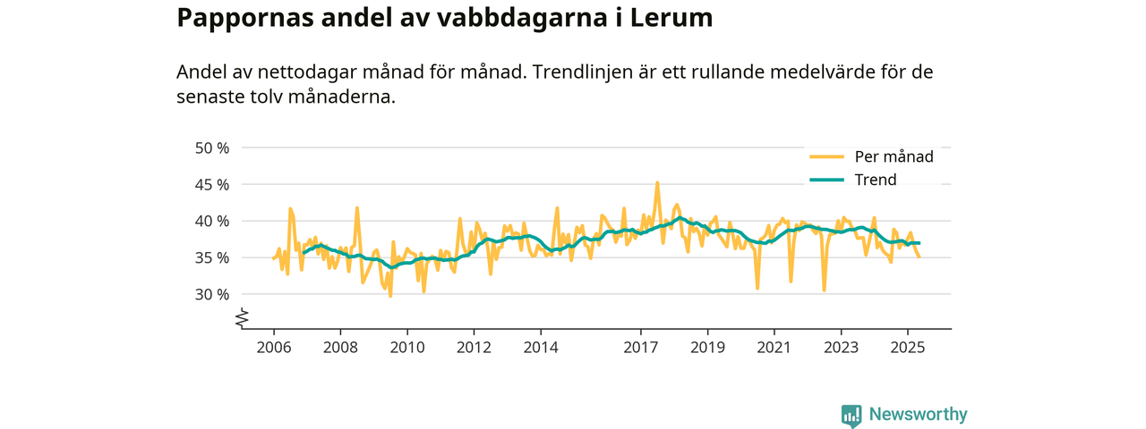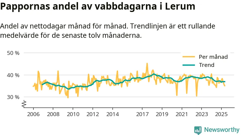 Lerum ligger en bit från ett jämställt uttag. Under de senaste tolv månaderna har männen stått för 37 procent av all vabb i kommunen. I år har andelen varit lägre än på nästan fem år.