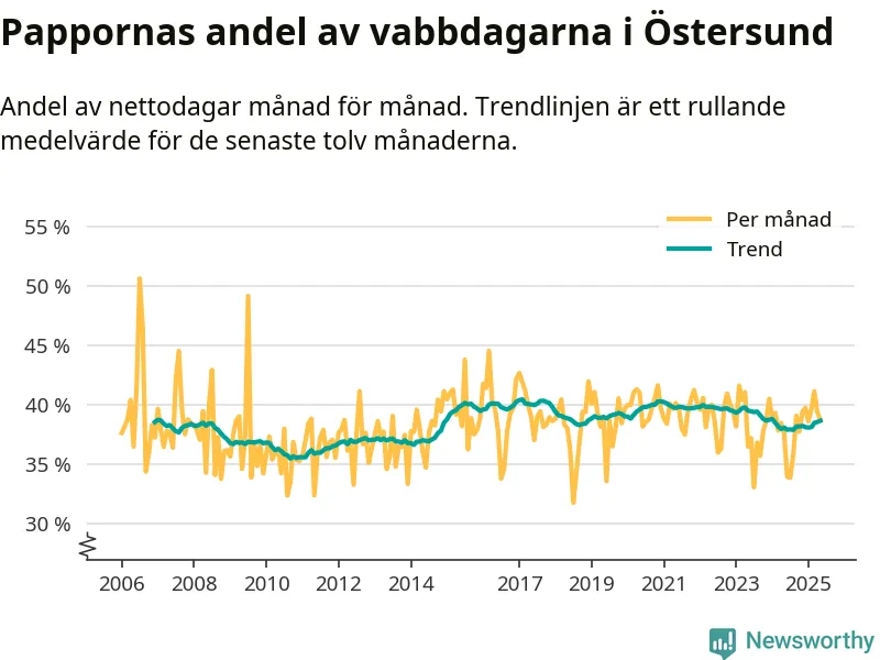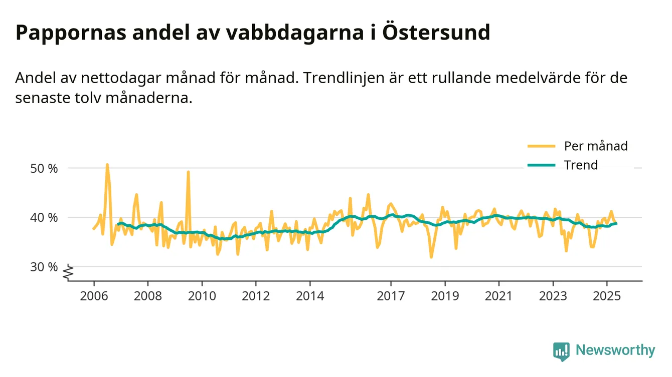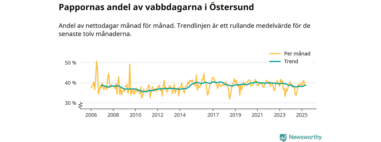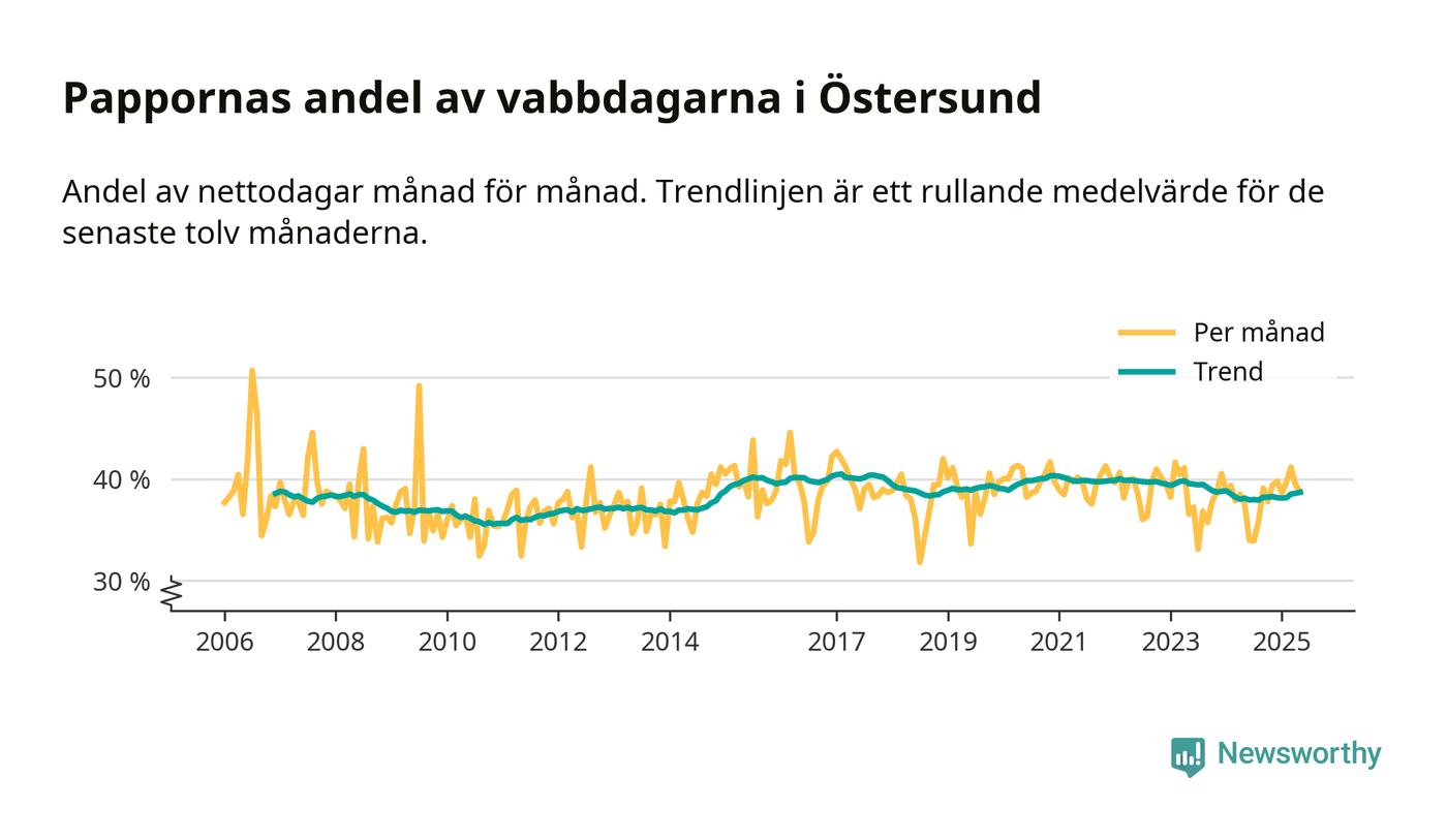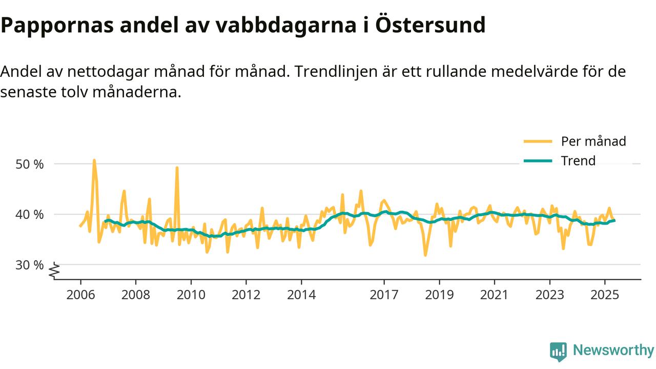 Östersund ligger en bit från ett jämställt uttag. Under de senaste tolv månaderna har männen stått för 39 procent av all vabb i kommunen.