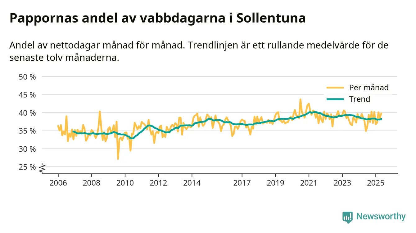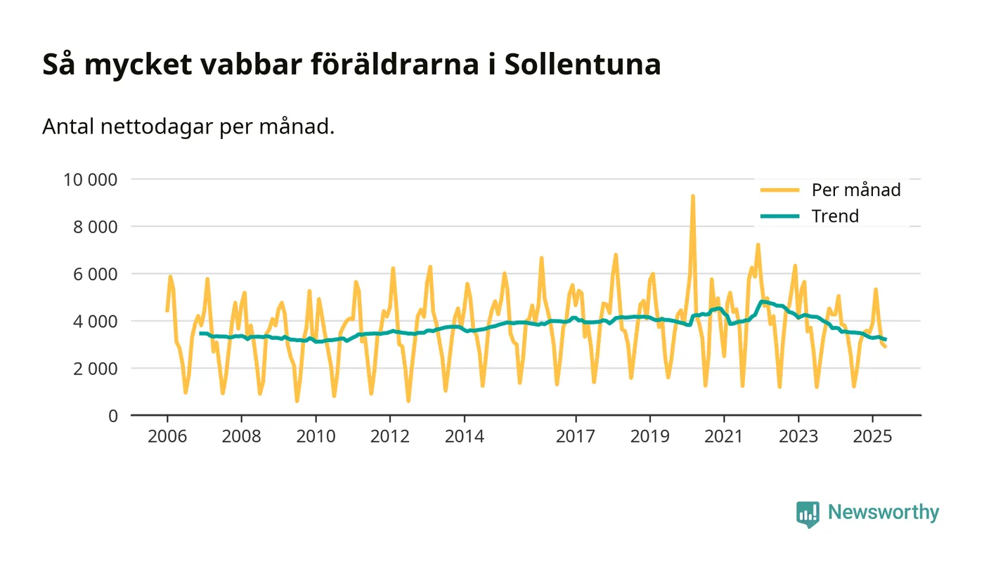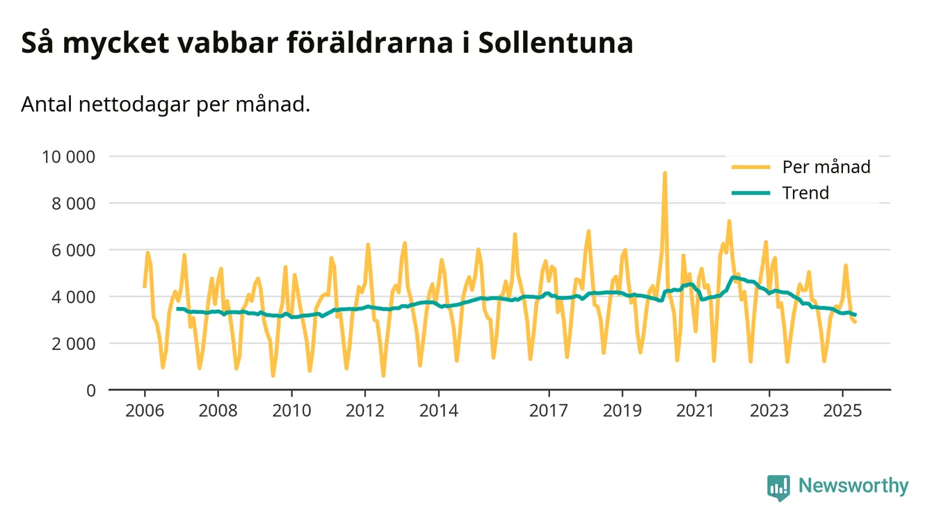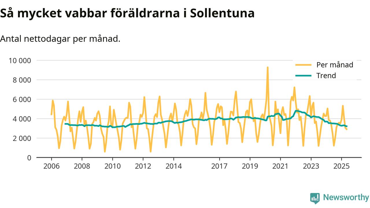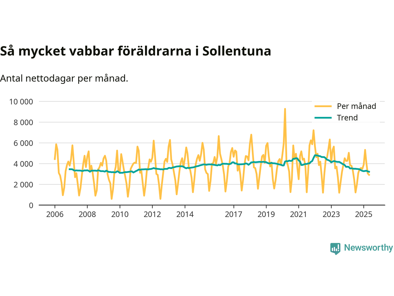 När coronapandemin drog in i mars 2020 peakade antalet vabbdagar både i Sollentuna kommun och i riket som helhet. Under de senaste två åren har vabbuttaget börjat minska igen.
