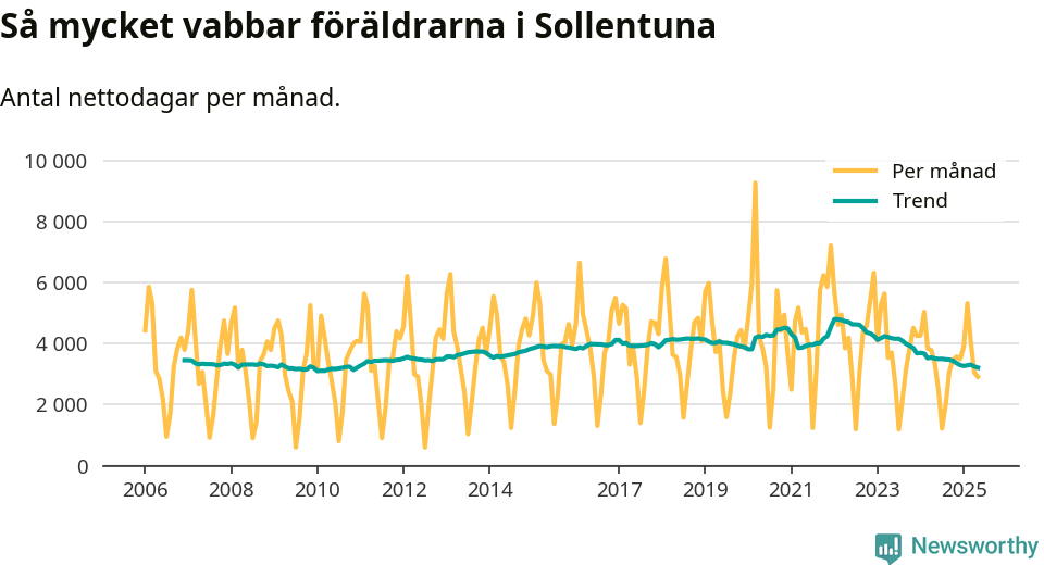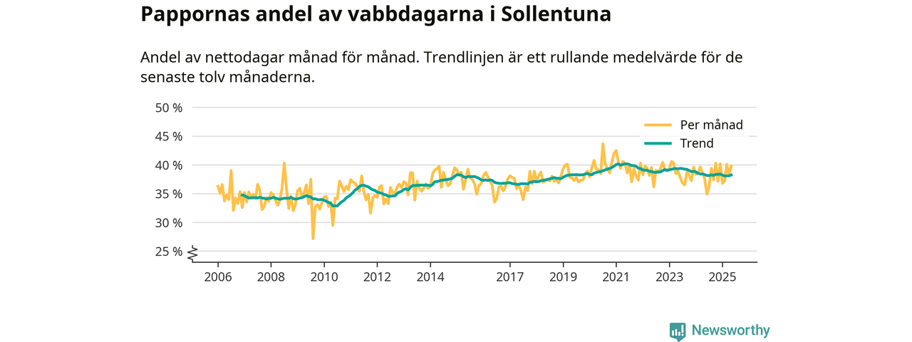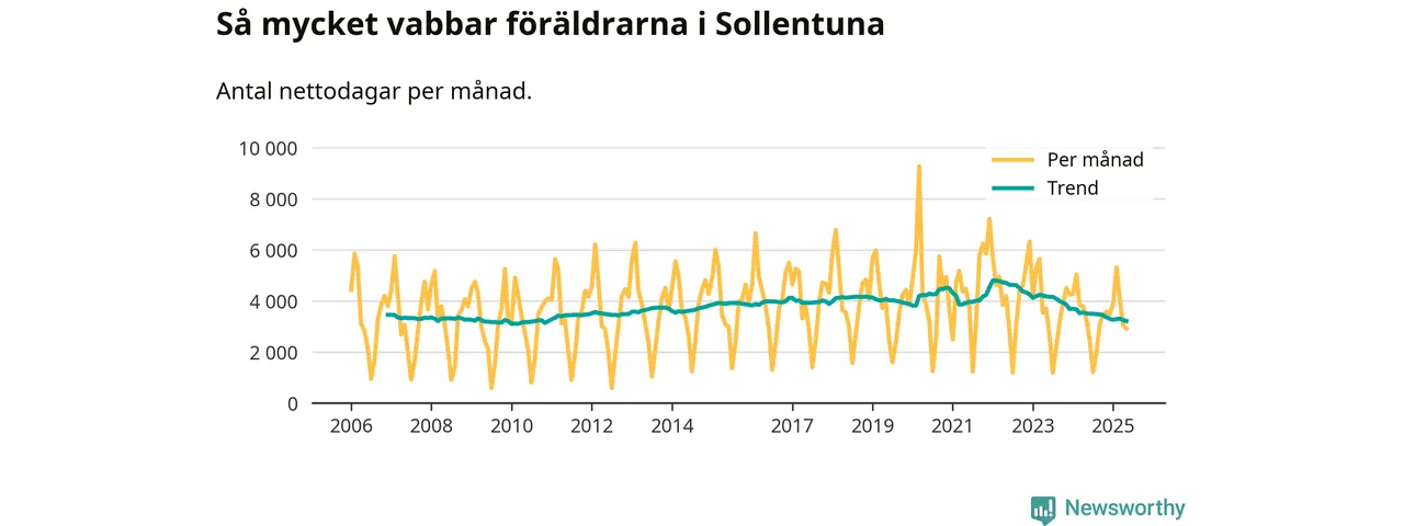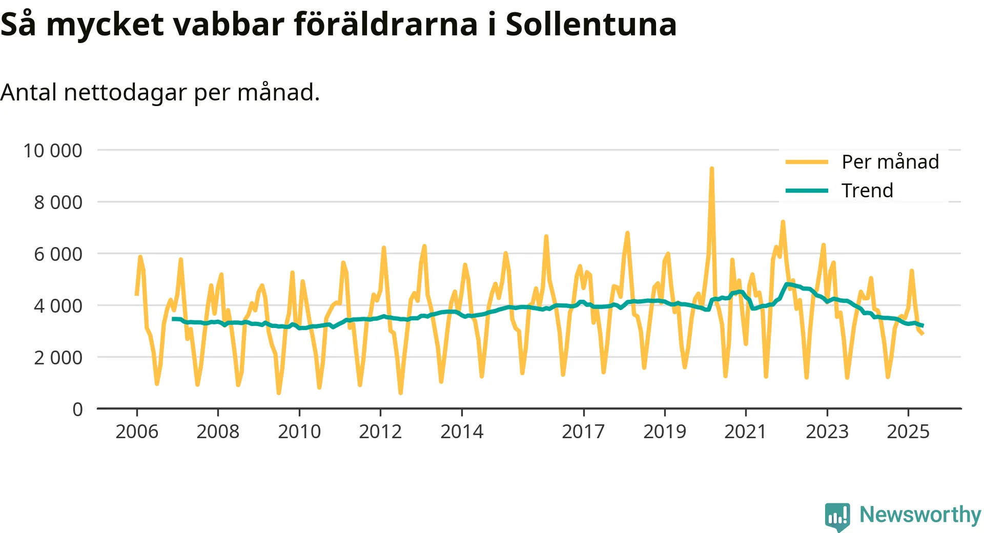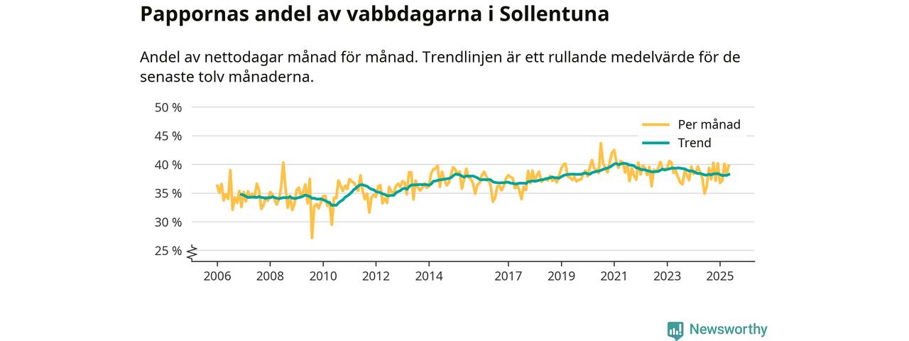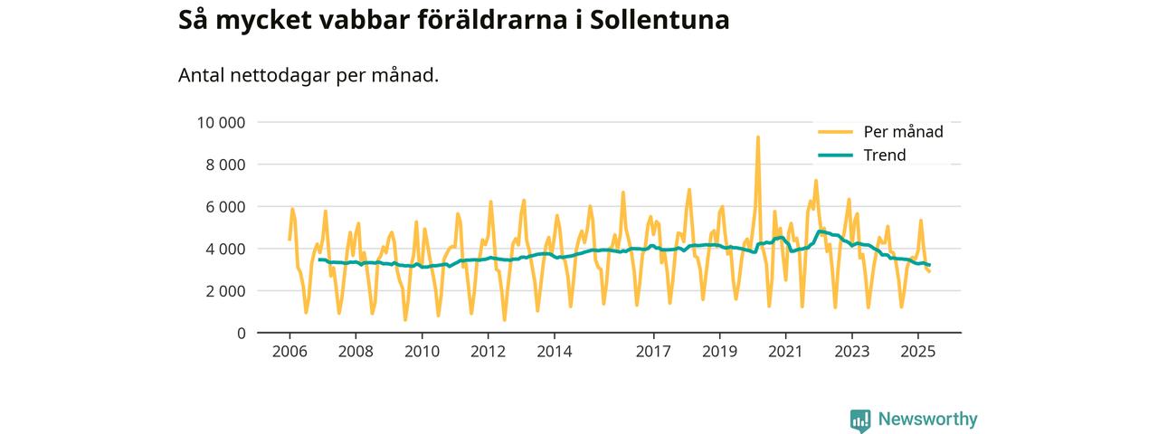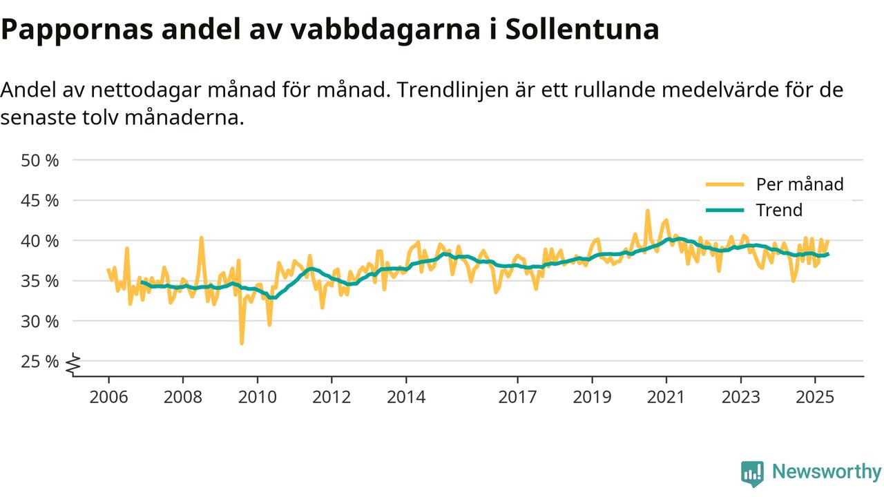 När coronapandemin drog in i mars 2020 peakade antalet vabbdagar både i Sollentuna kommun och i riket som helhet. Under de senaste två åren har vabbuttaget börjat minska igen.