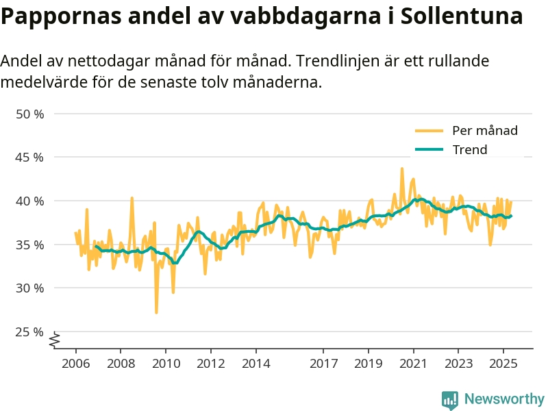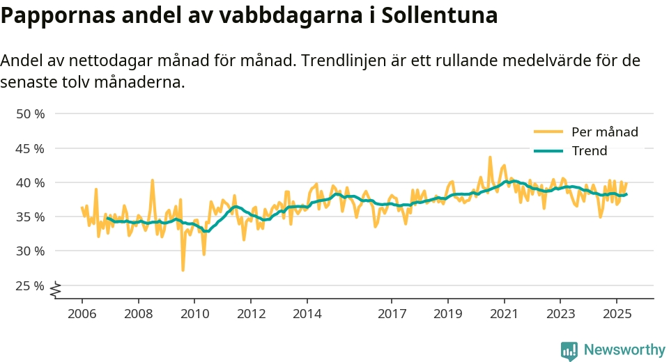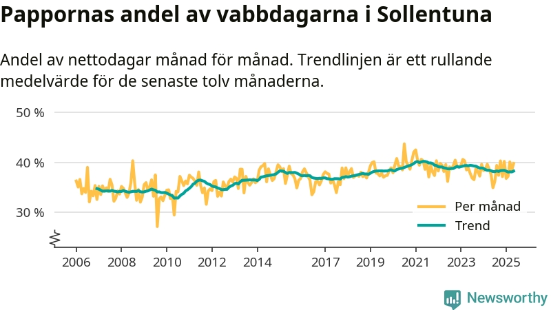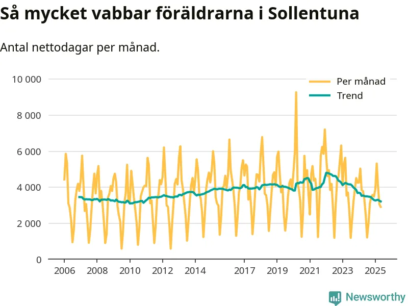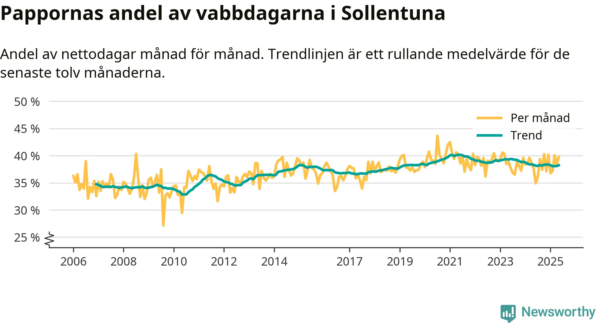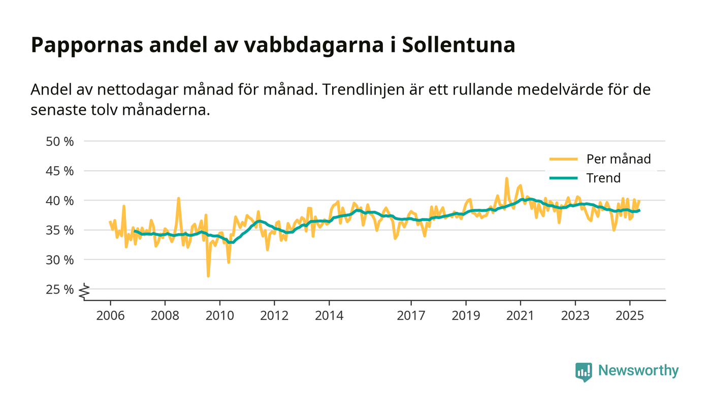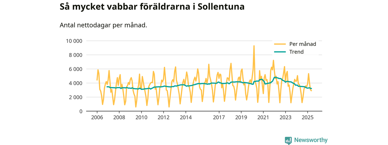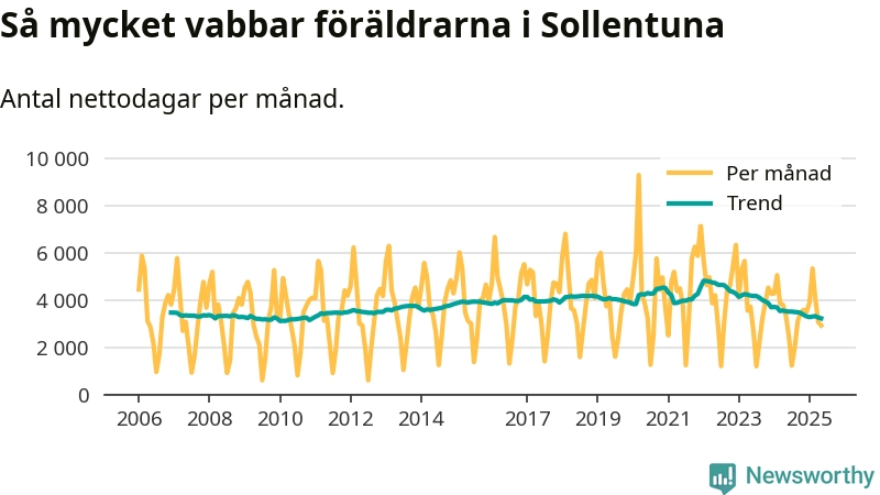 När coronapandemin drog in i mars 2020 peakade antalet vabbdagar både i Sollentuna kommun och i riket som helhet. Under de senaste två åren har vabbuttaget börjat minska igen.
