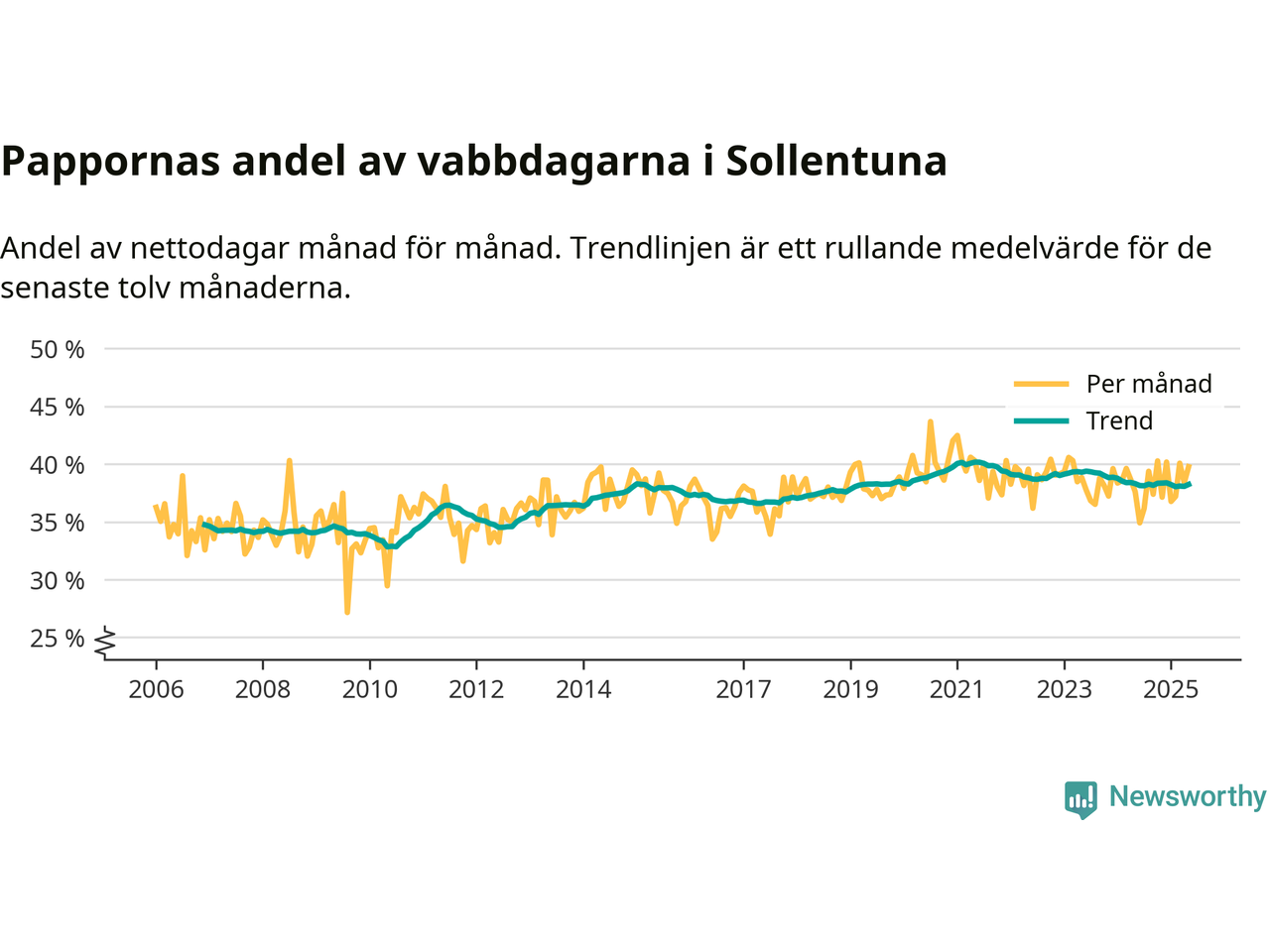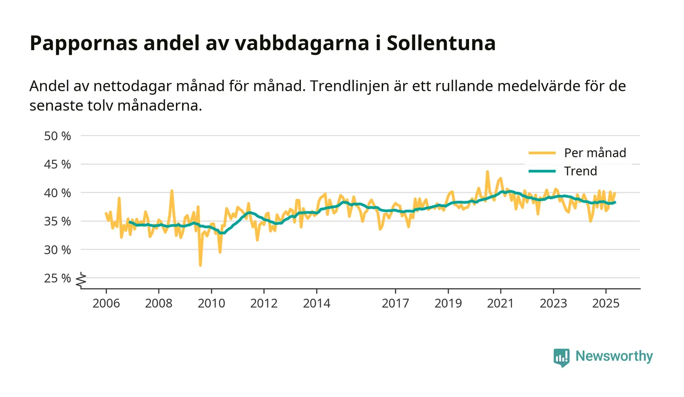 Sollentuna ligger en bit från ett jämställt uttag. Under de senaste tolv månaderna har männen stått för 38 procent av all vabb i kommunen.
