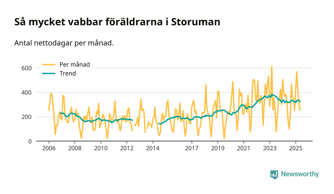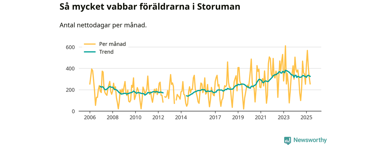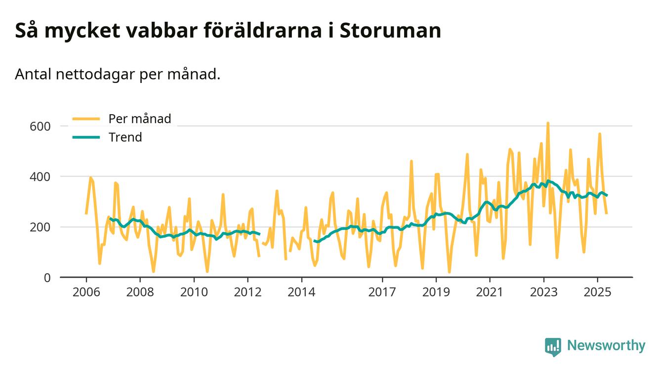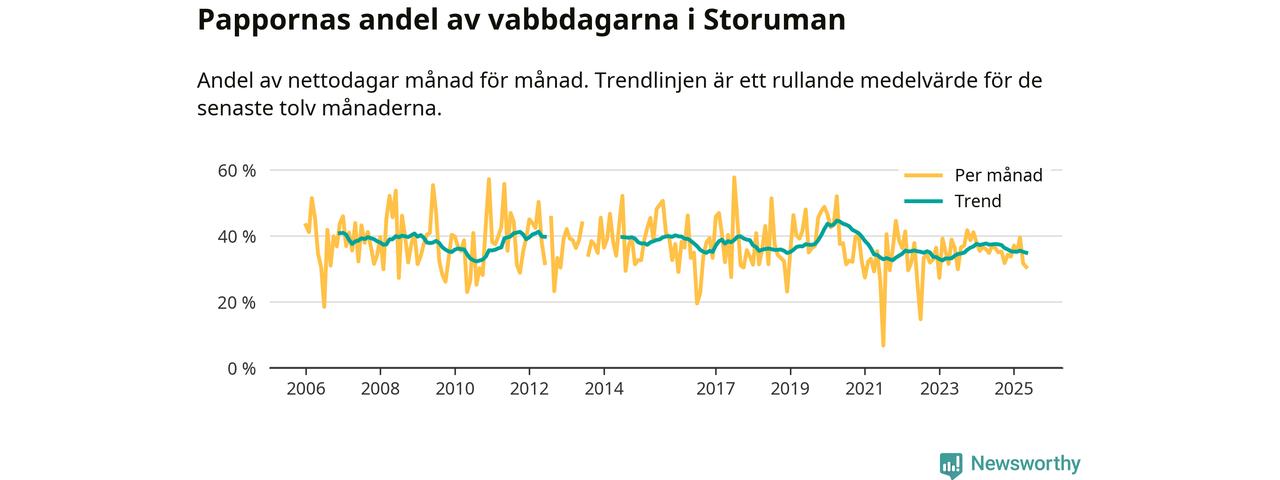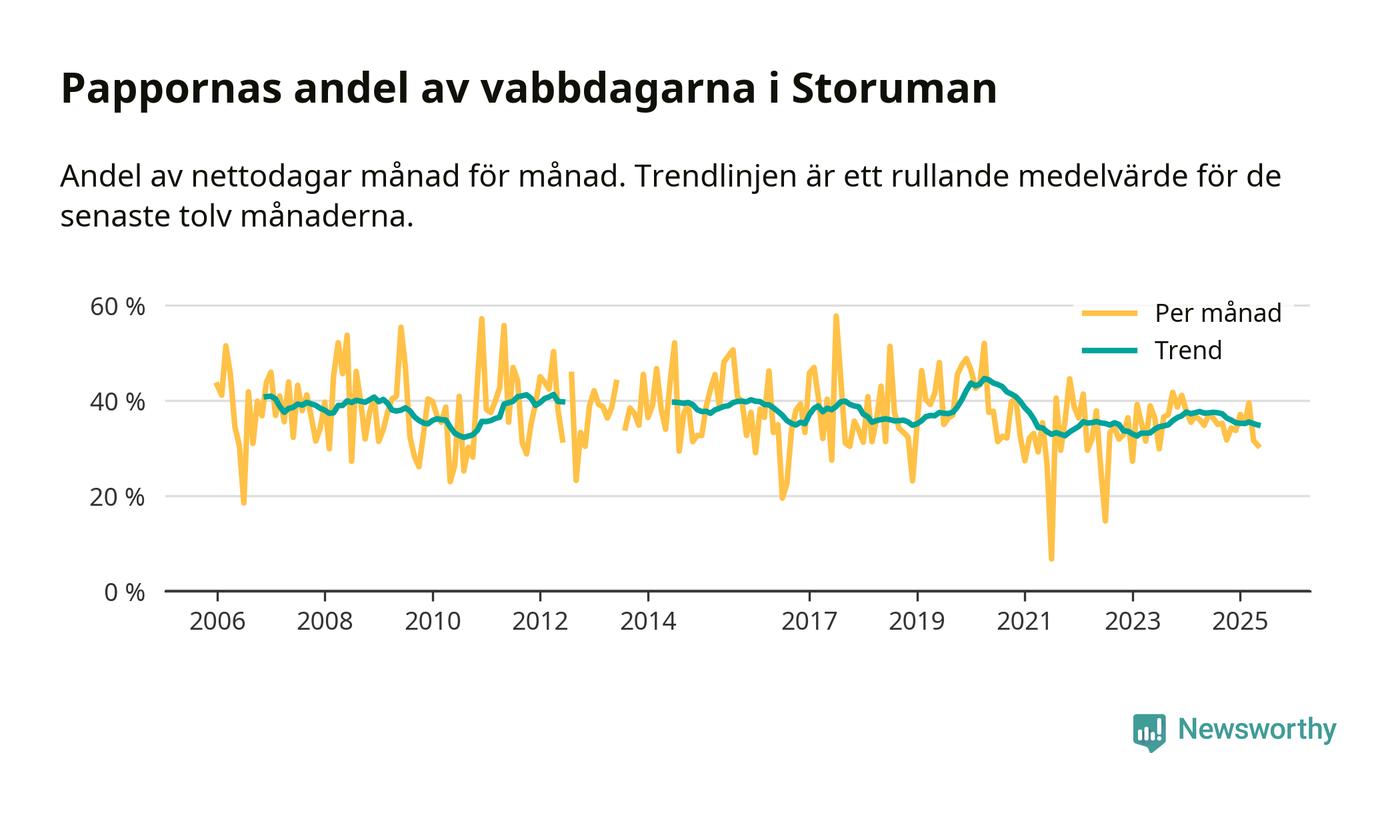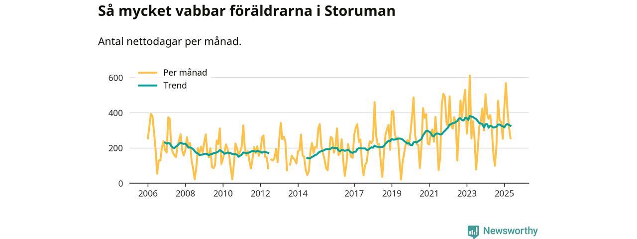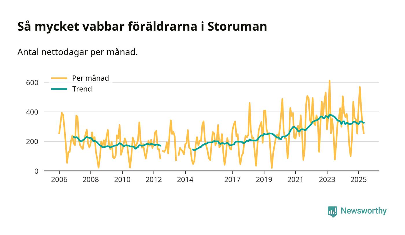 Storuman ligger en bra bit från ett jämställt uttag. Under de senaste tolv månaderna har männen stått för 35 procent av all vabb i kommunen. Pappornas uttag peakade våren 2020 då kommunens fäder var uppe i 45 procent av vabbdagarna 1.