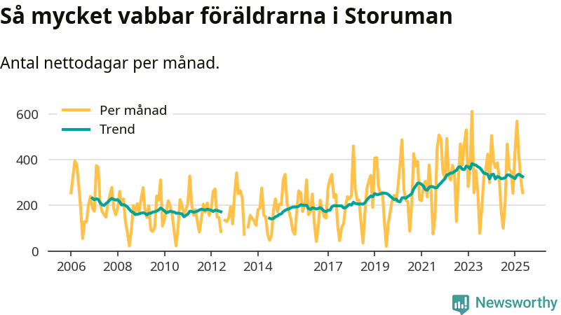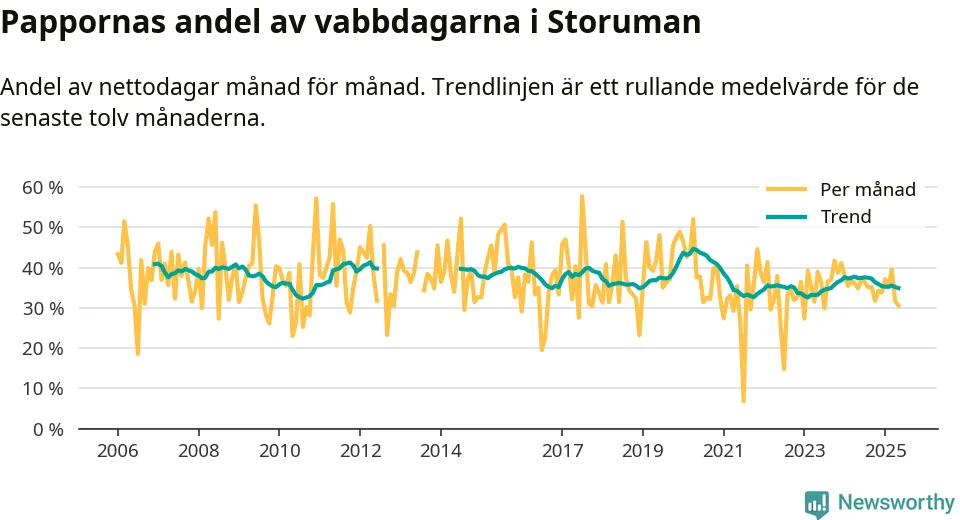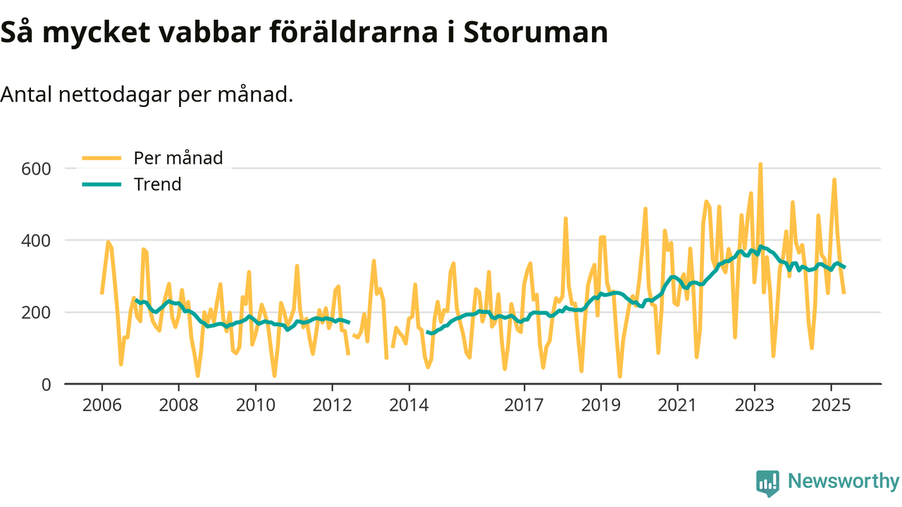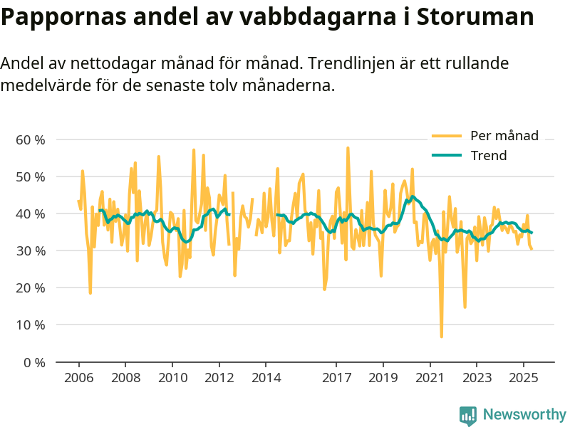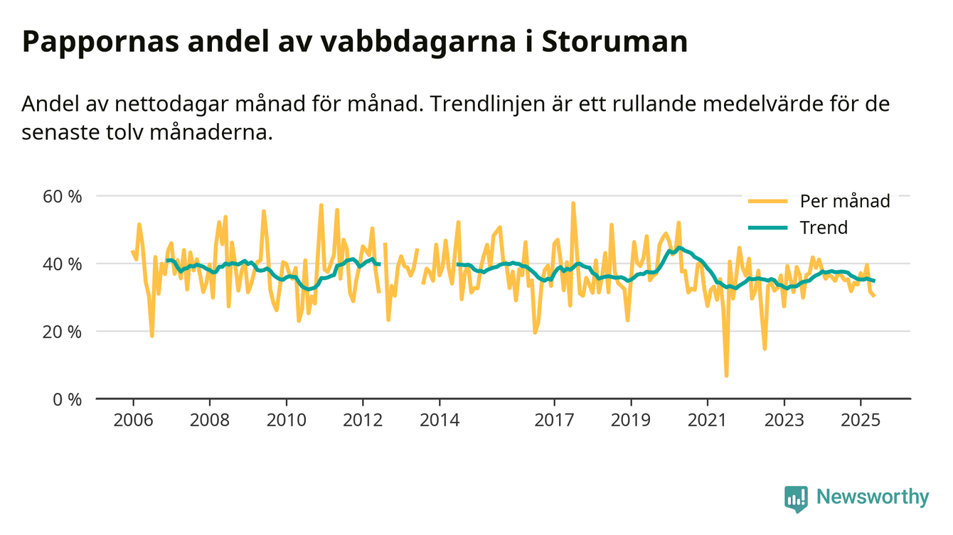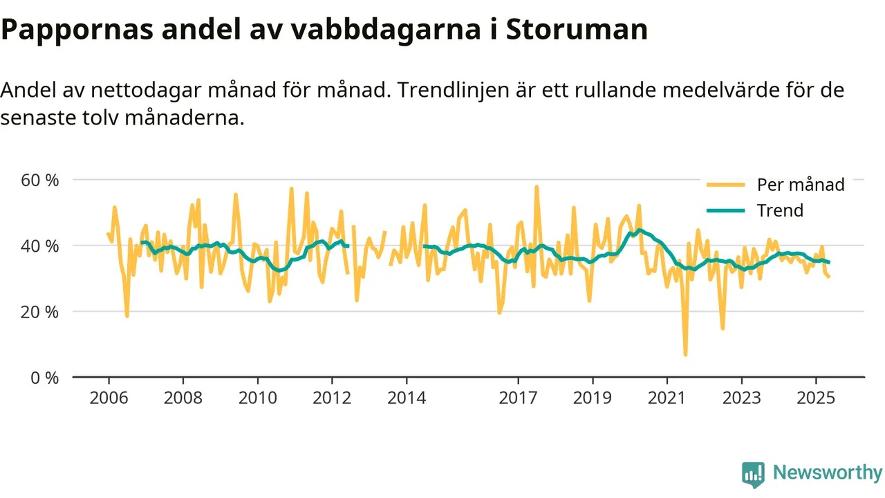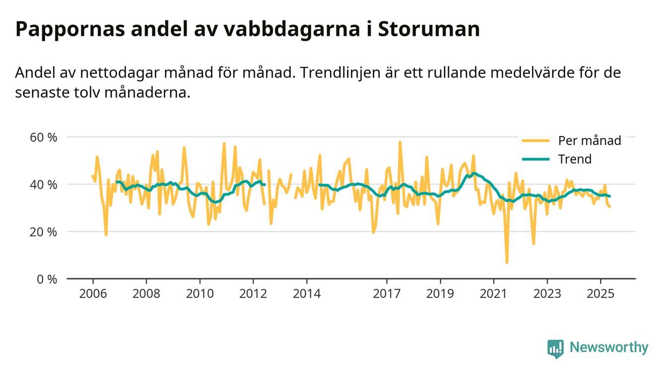 Storuman ligger en bra bit från ett jämställt uttag. Under de senaste tolv månaderna har männen stått för 35 procent av all vabb i kommunen. Pappornas uttag peakade våren 2020 då kommunens fäder var uppe i 45 procent av vabbdagarna 1.