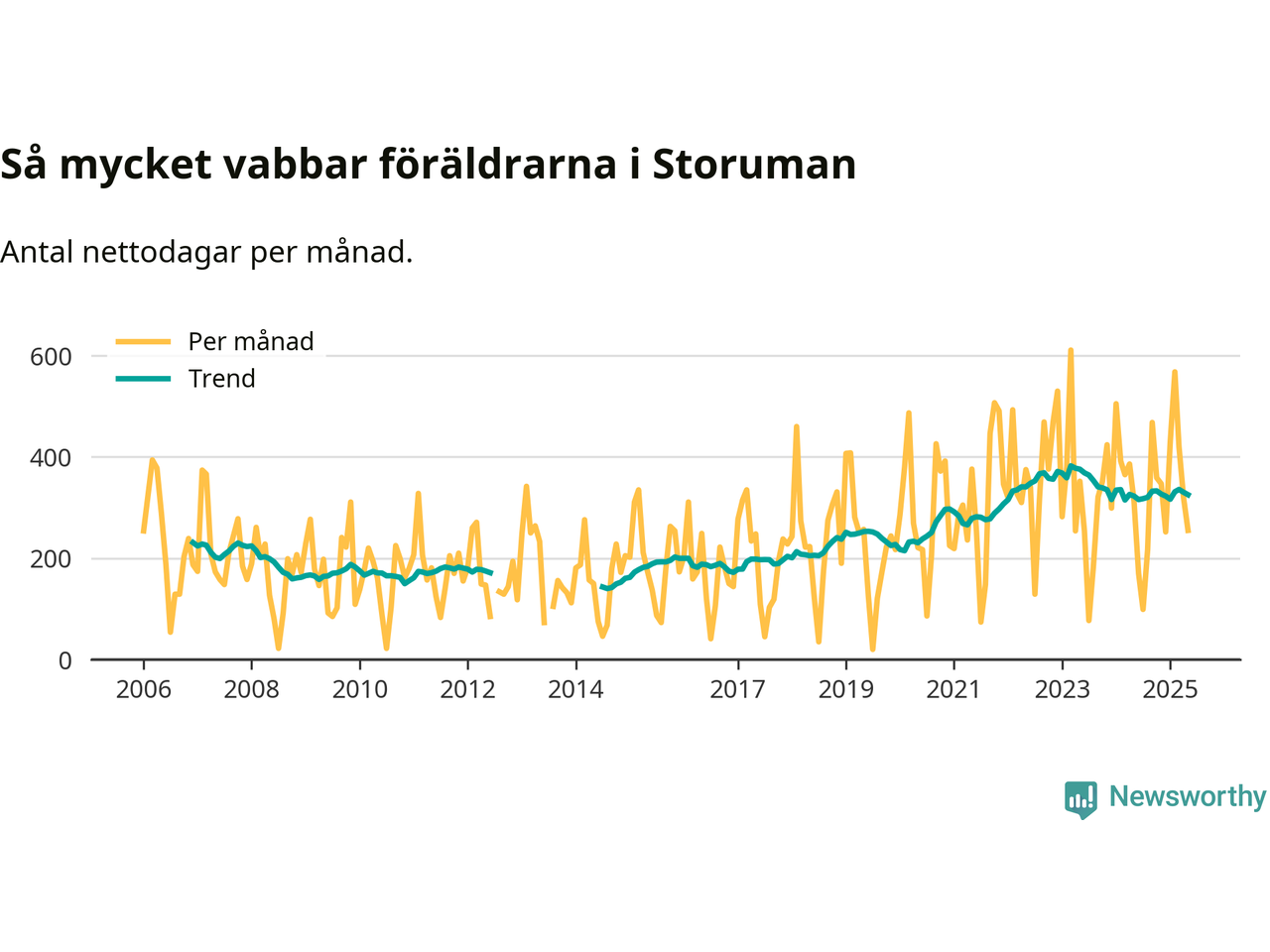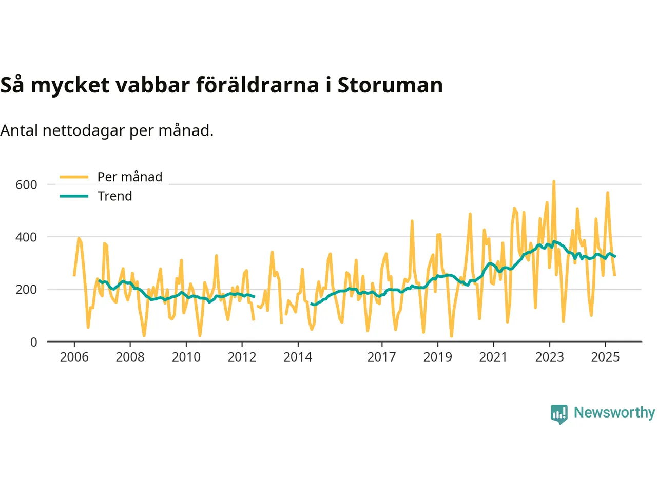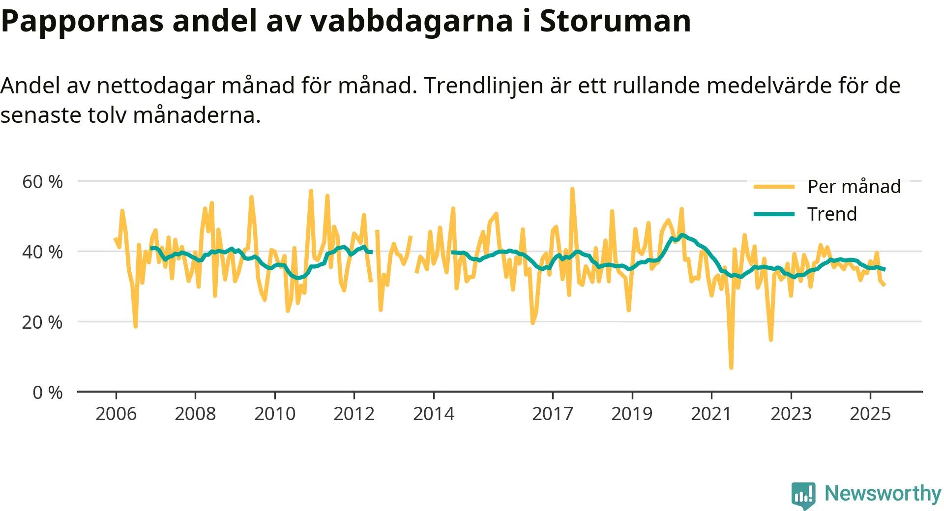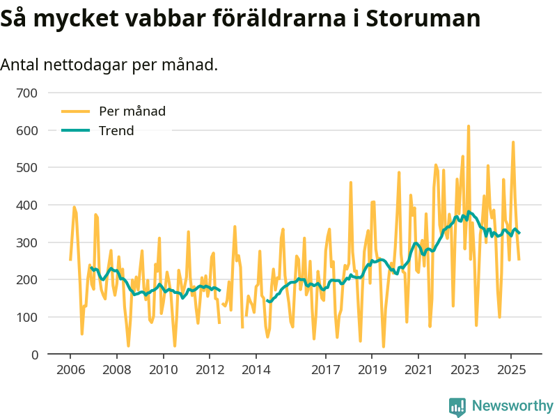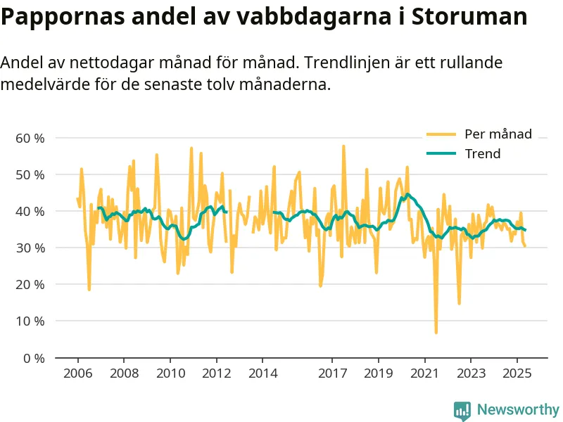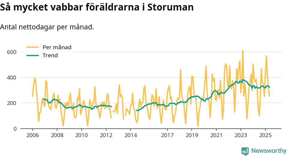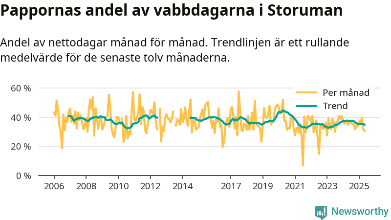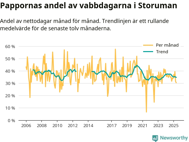 Storuman ligger en bra bit från ett jämställt uttag. Under de senaste tolv månaderna har männen stått för 35 procent av all vabb i kommunen. Pappornas uttag peakade våren 2020 då kommunens fäder var uppe i 45 procent av vabbdagarna 1.
