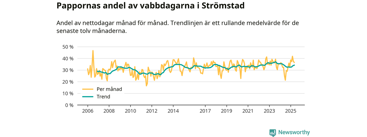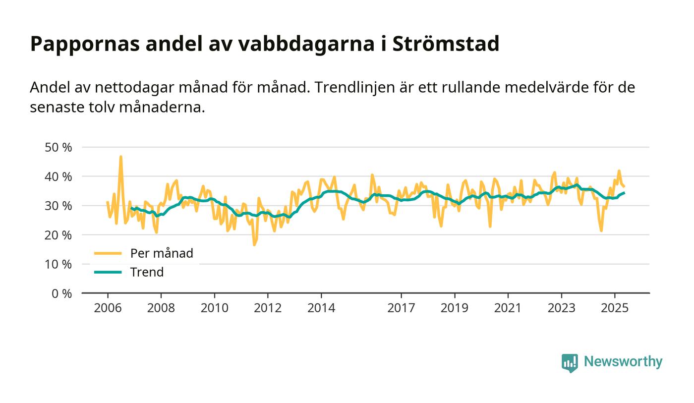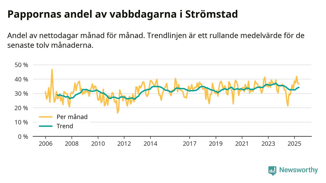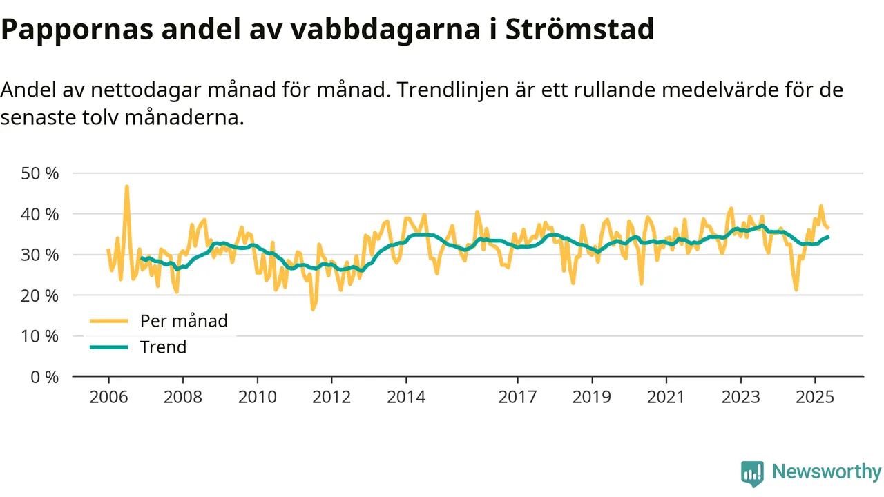 Strömstad ligger en bra bit från ett jämställt uttag. Under de senaste tolv månaderna har männen stått för 34 procent av all vabb i kommunen. Pappornas uttag peakade sommaren 2023 då kommunens fäder var uppe i 37 procent av vabbdagarna 1.