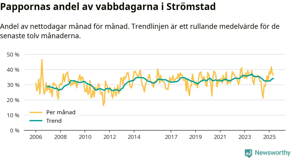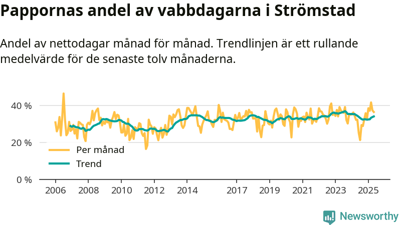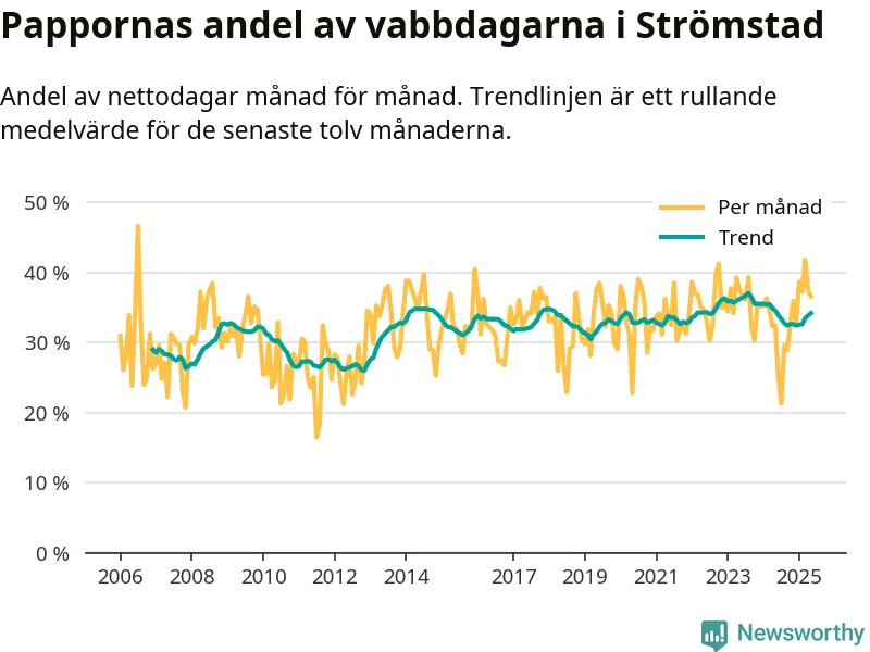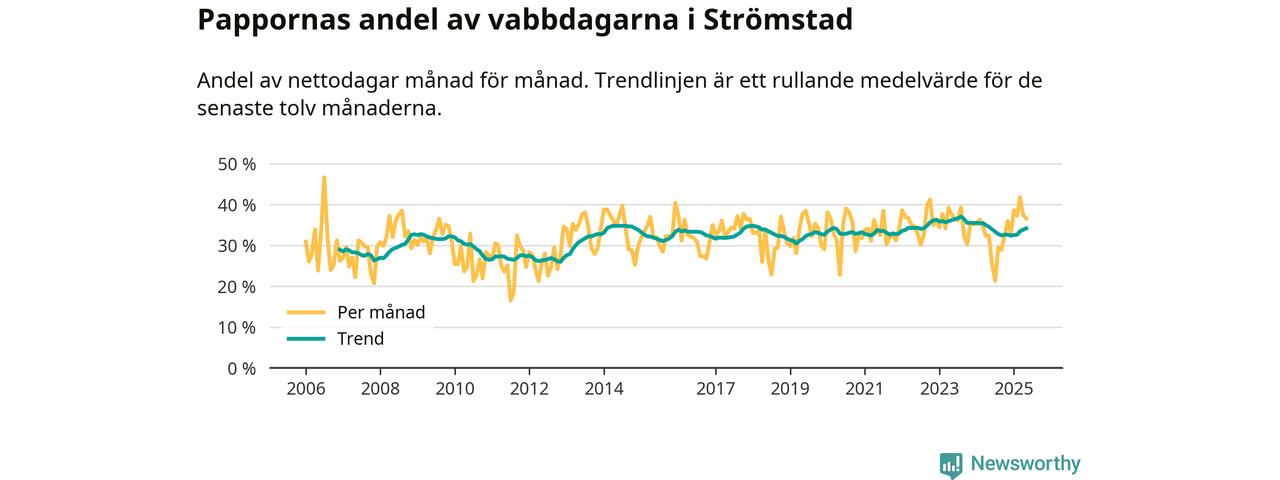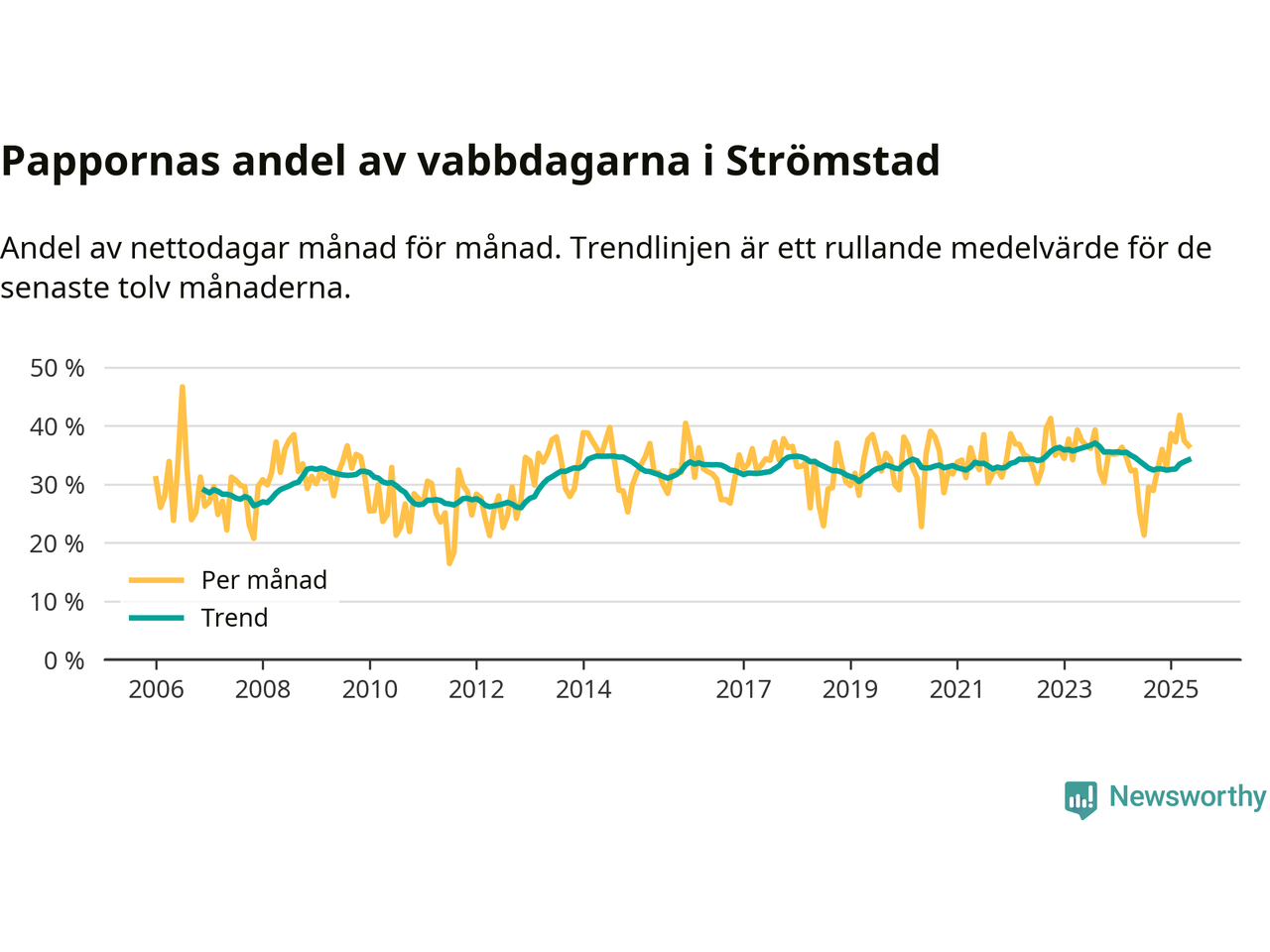 Strömstad ligger en bra bit från ett jämställt uttag. Under de senaste tolv månaderna har männen stått för 34 procent av all vabb i kommunen. Pappornas uttag peakade sommaren 2023 då kommunens fäder var uppe i 37 procent av vabbdagarna 1.