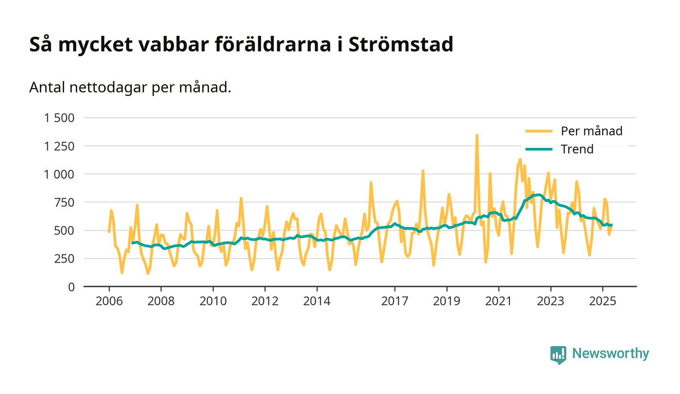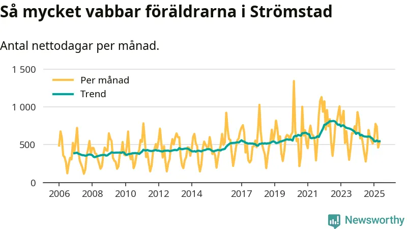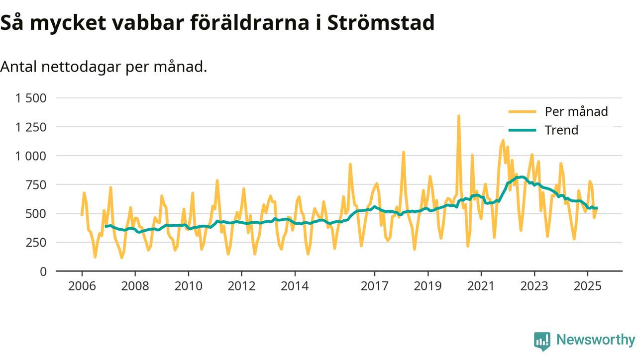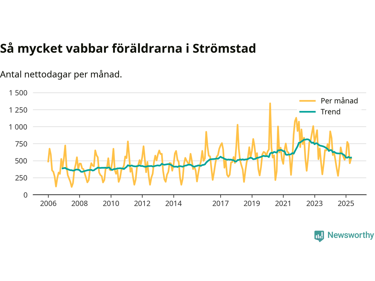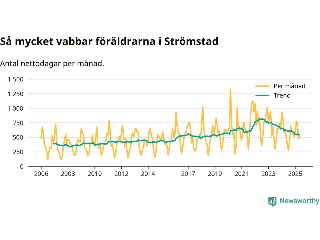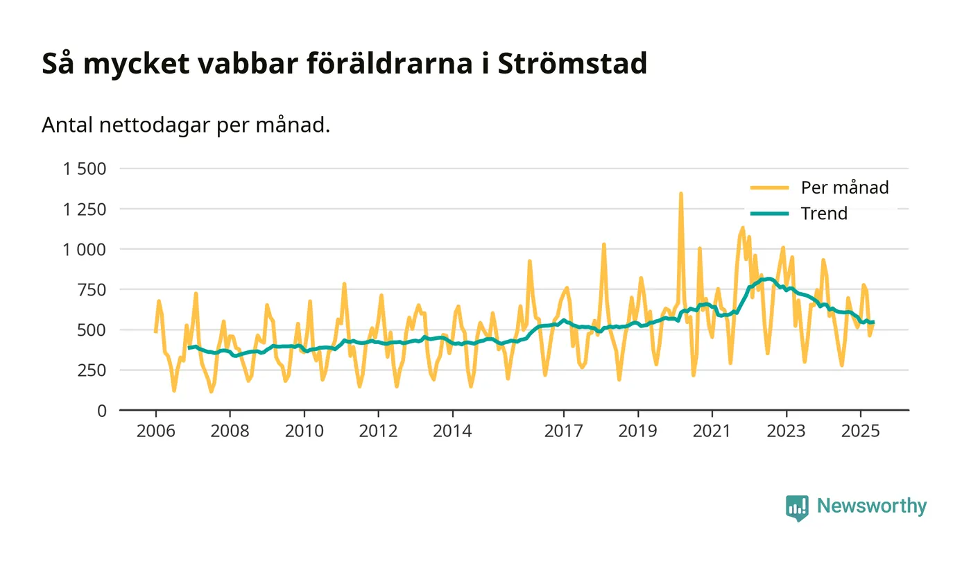 När coronapandemin drog in i mars 2020 peakade antalet vabbdagar både i Strömstads kommun och i riket som helhet. Under de senaste två åren har vabbuttaget börjat minska igen.