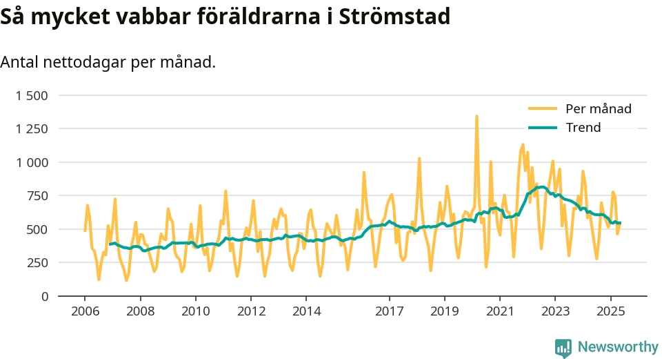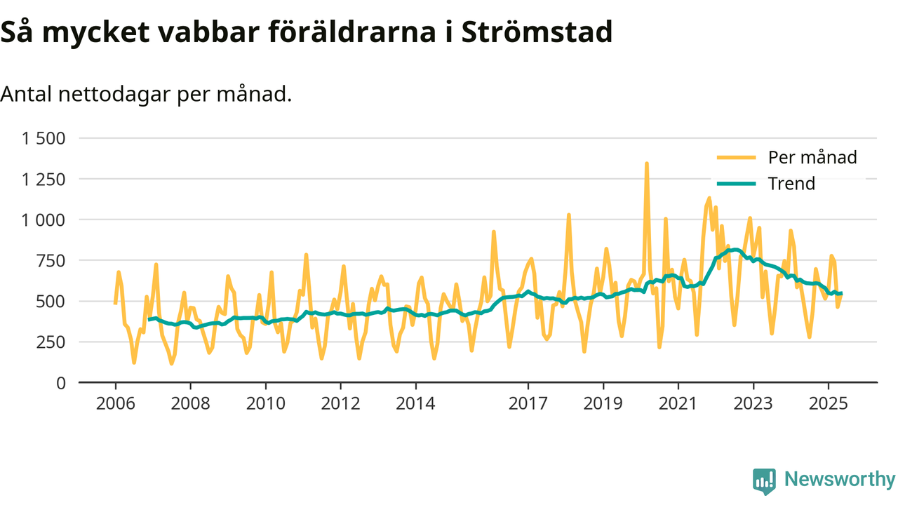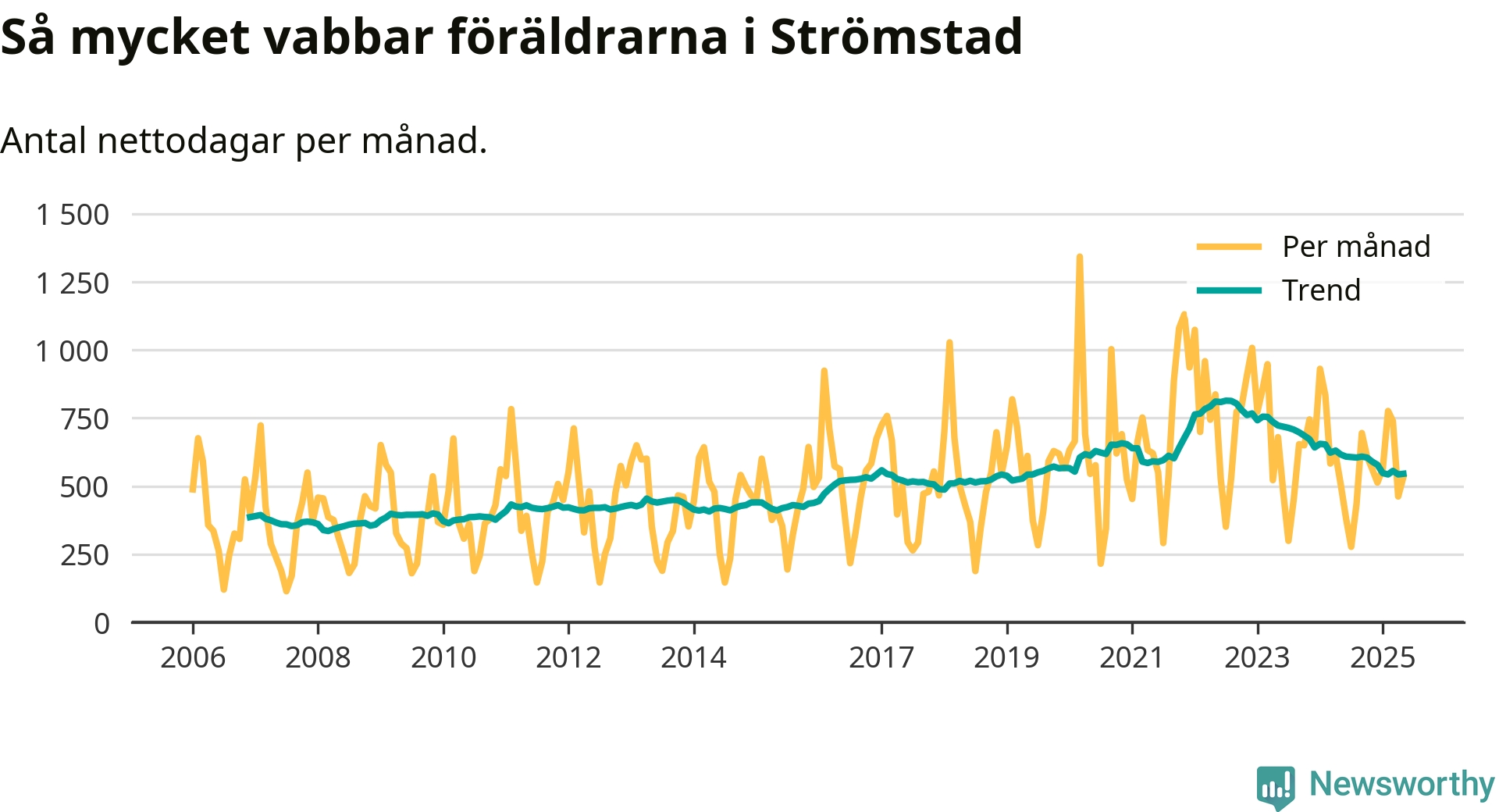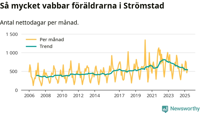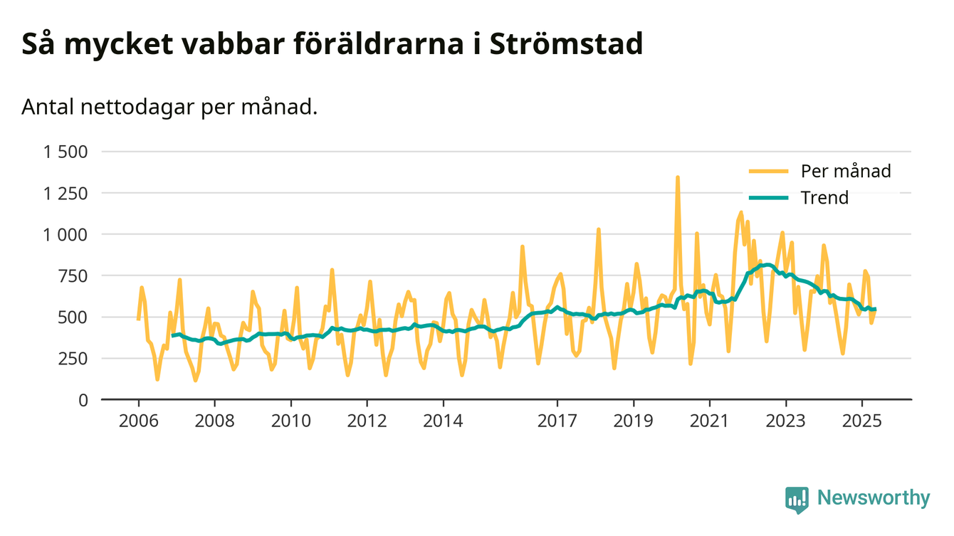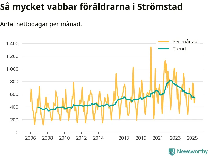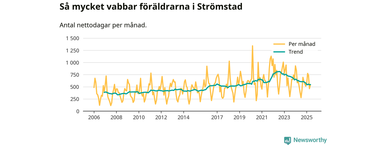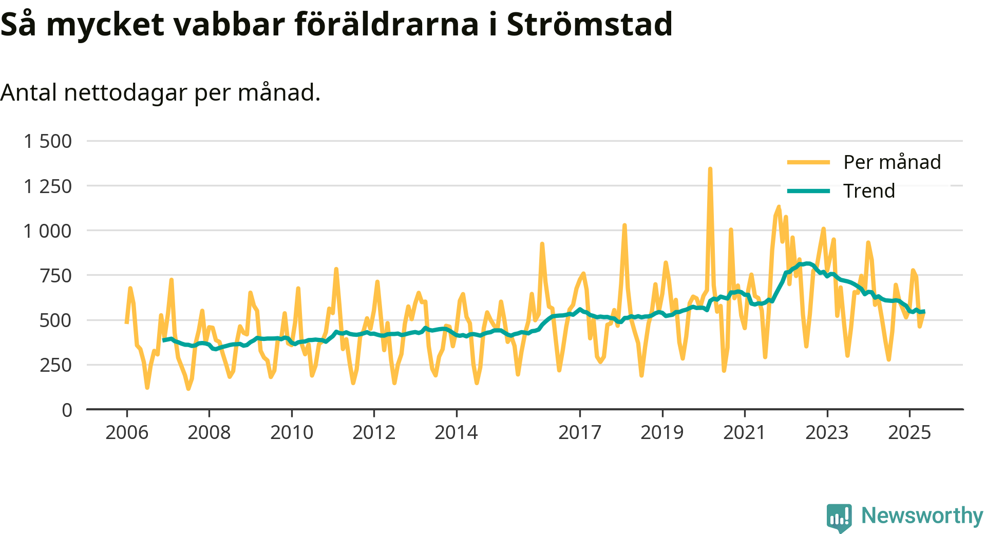 När coronapandemin drog in i mars 2020 peakade antalet vabbdagar både i Strömstads kommun och i riket som helhet. Under de senaste två åren har vabbuttaget börjat minska igen.
