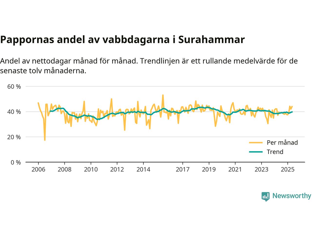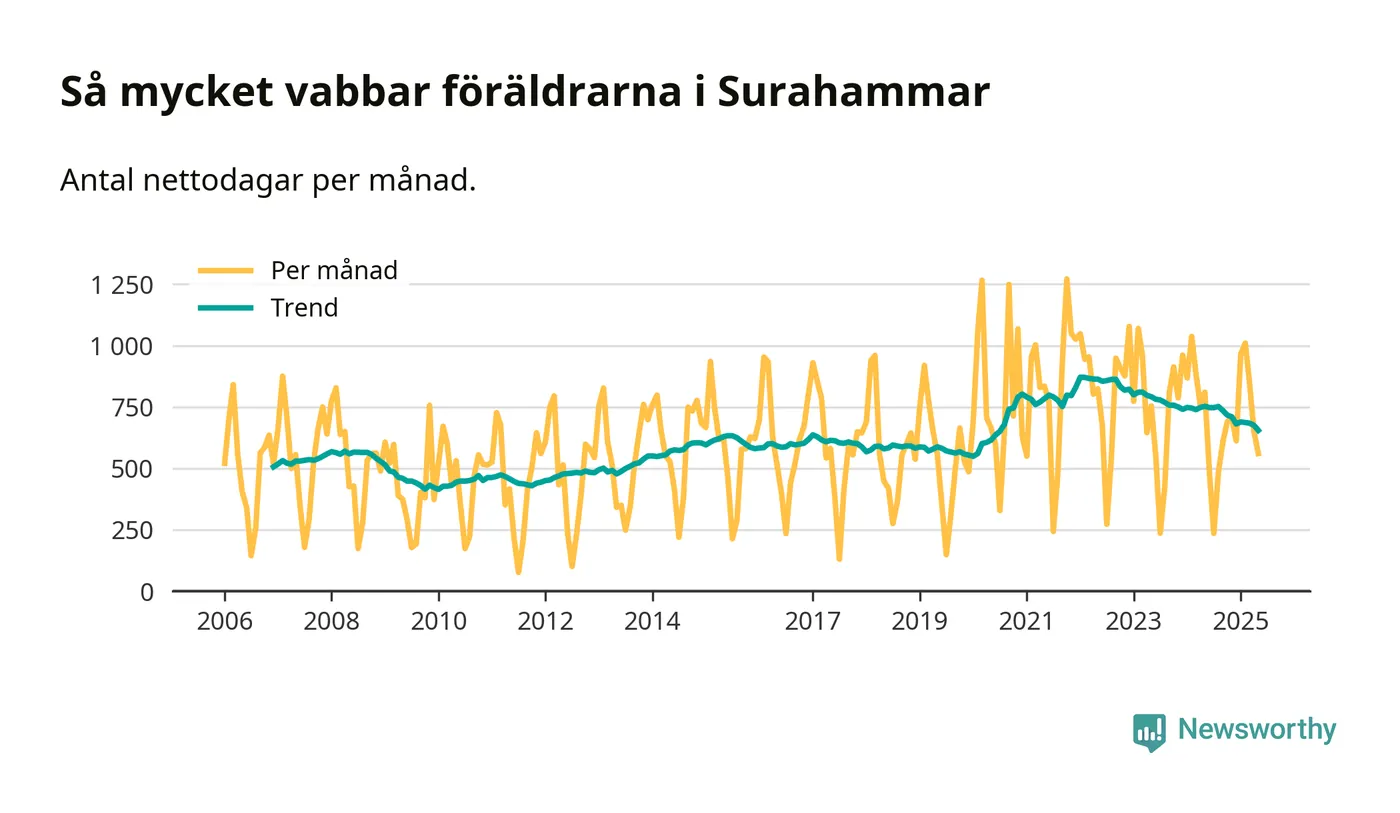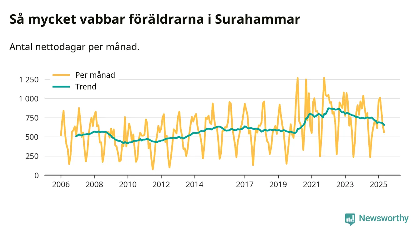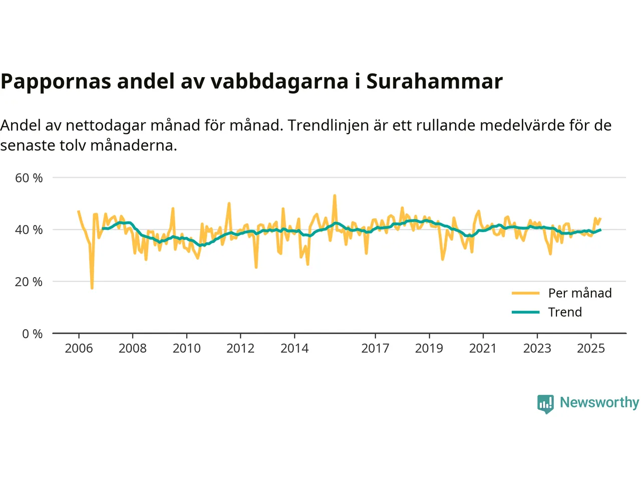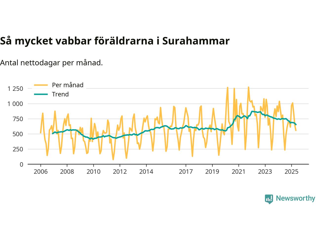 Surahammar ligger en bit från ett jämställt uttag. Under de senaste tolv månaderna har männen stått för 40 procent av all vabb i kommunen. Pappornas uttag peakade vintern 2018 då kommunens fäder var uppe i 43 procent av vabbdagarna 1.