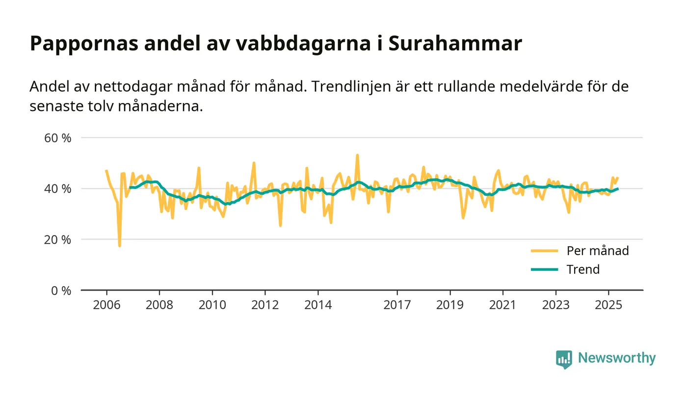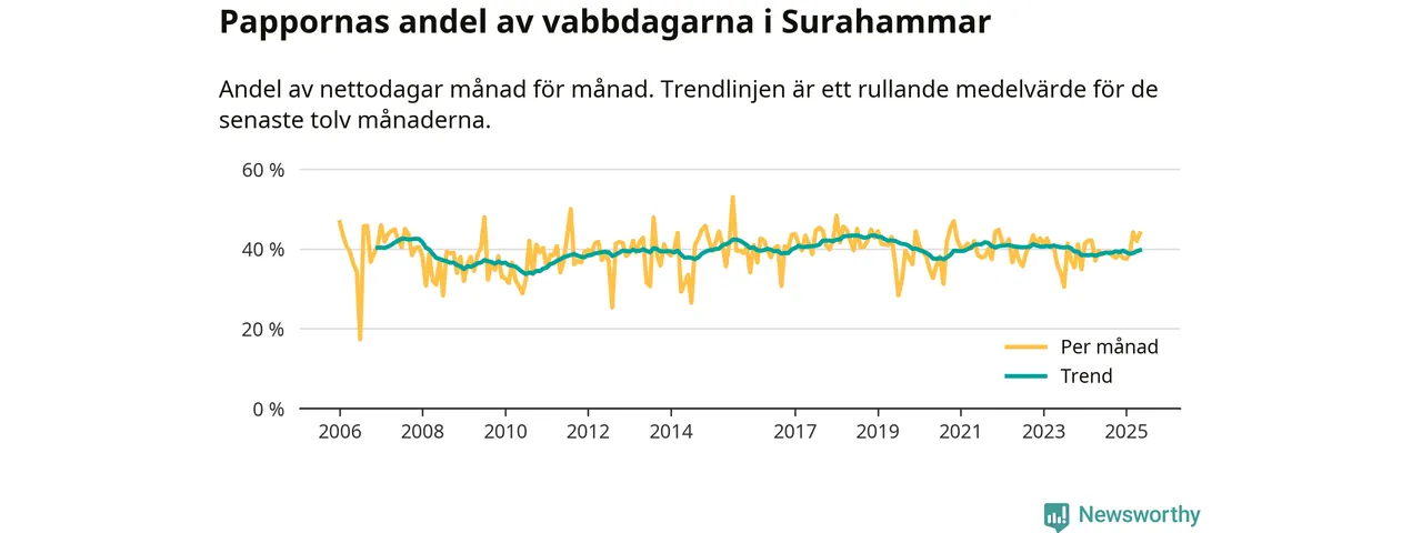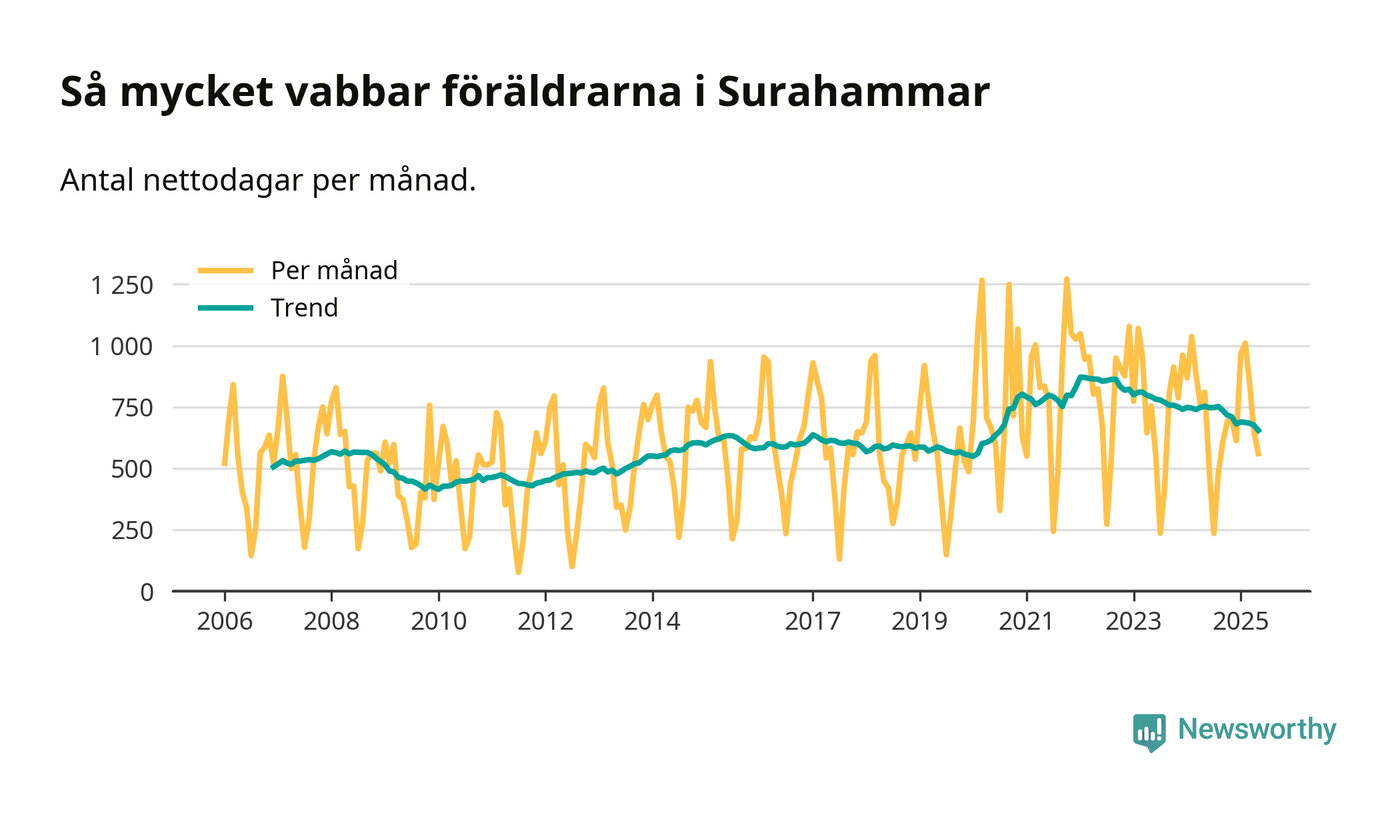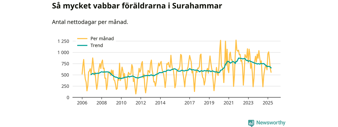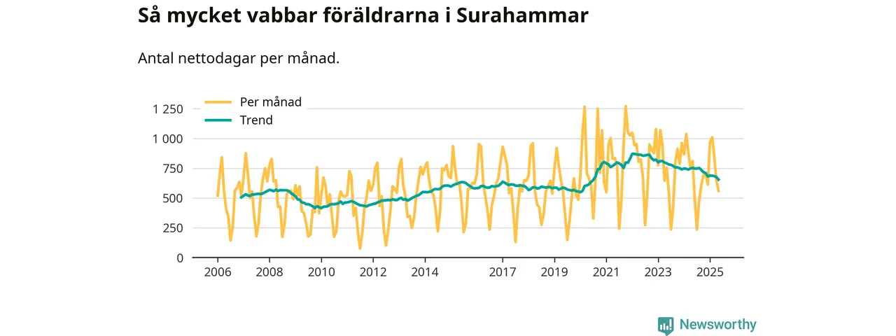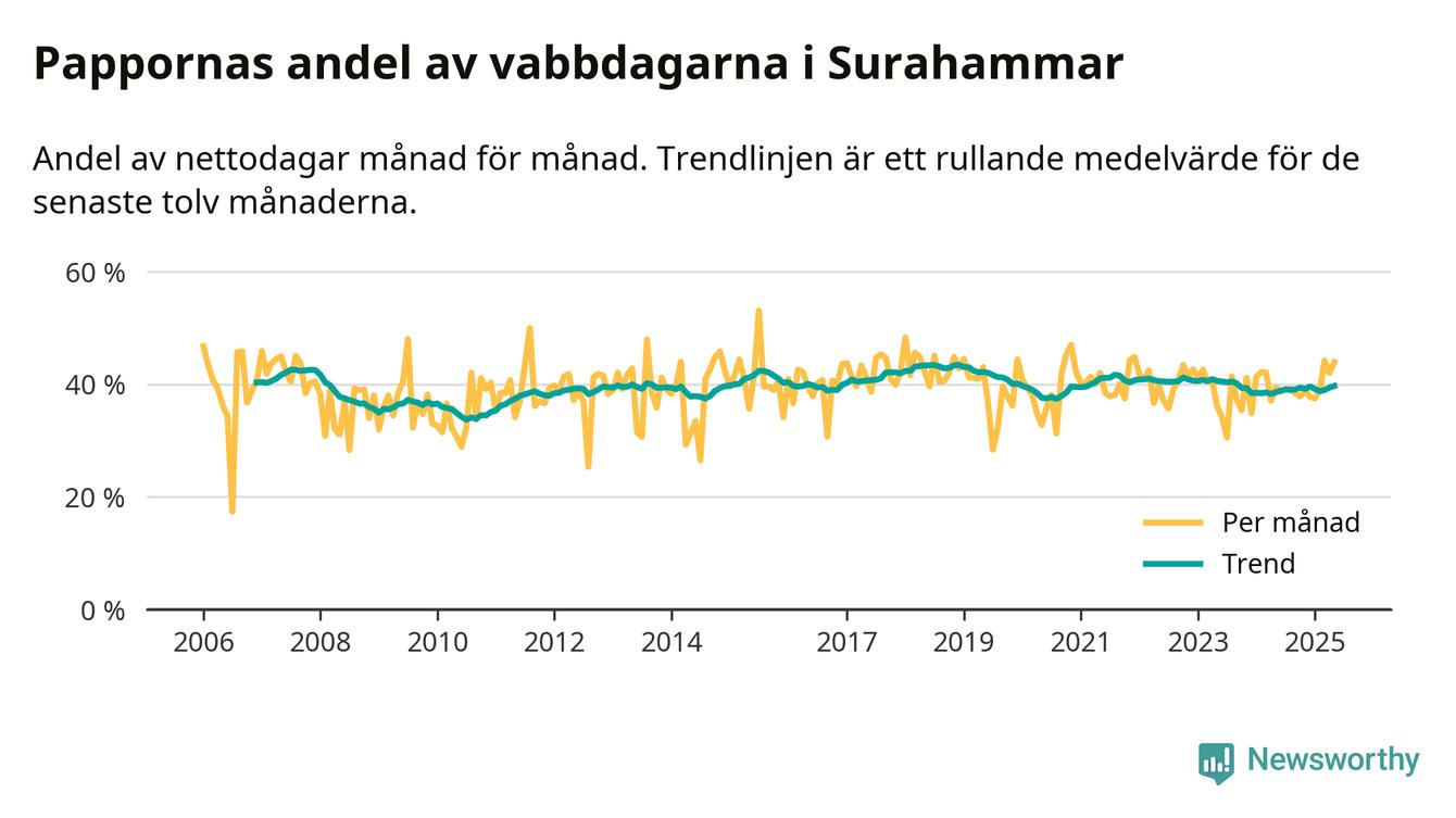 Surahammar ligger en bit från ett jämställt uttag. Under de senaste tolv månaderna har männen stått för 40 procent av all vabb i kommunen. Pappornas uttag peakade vintern 2018 då kommunens fäder var uppe i 43 procent av vabbdagarna 1.