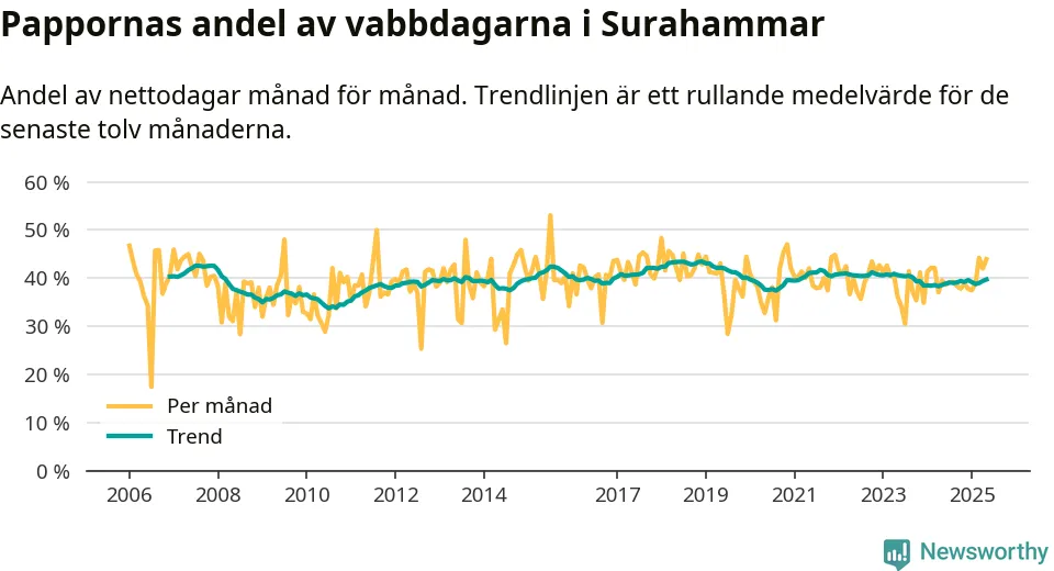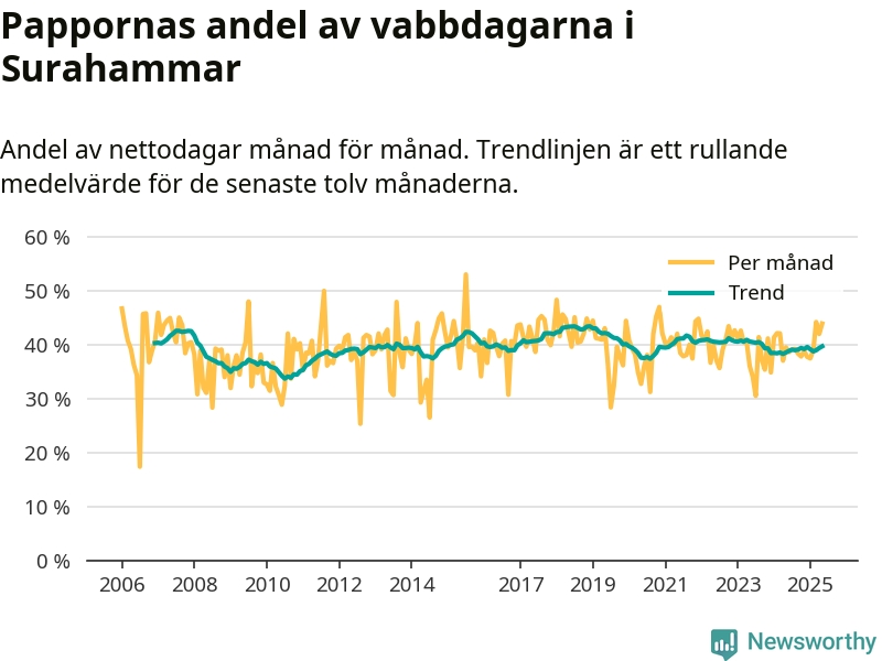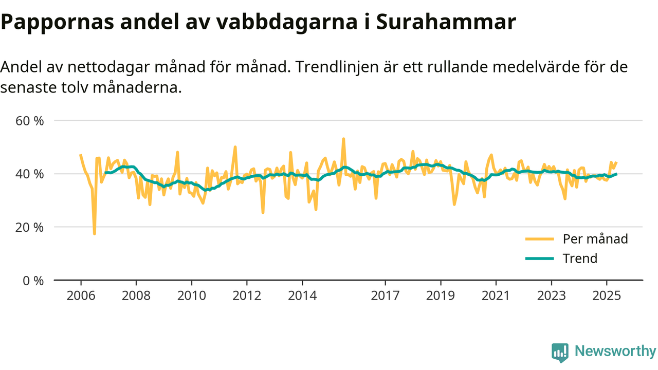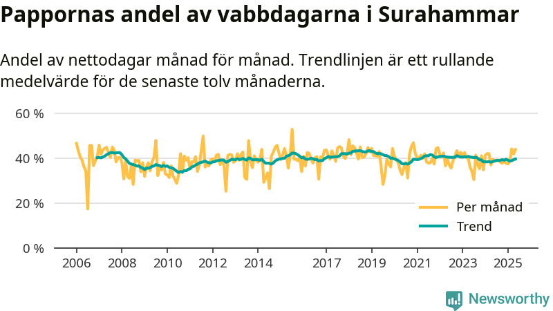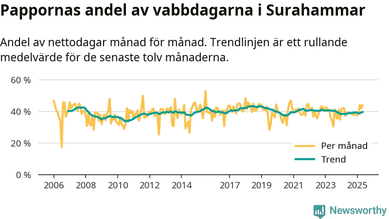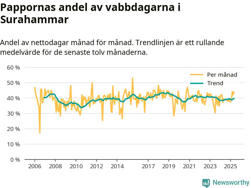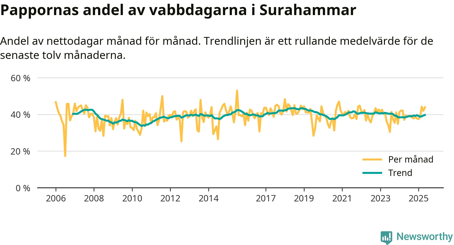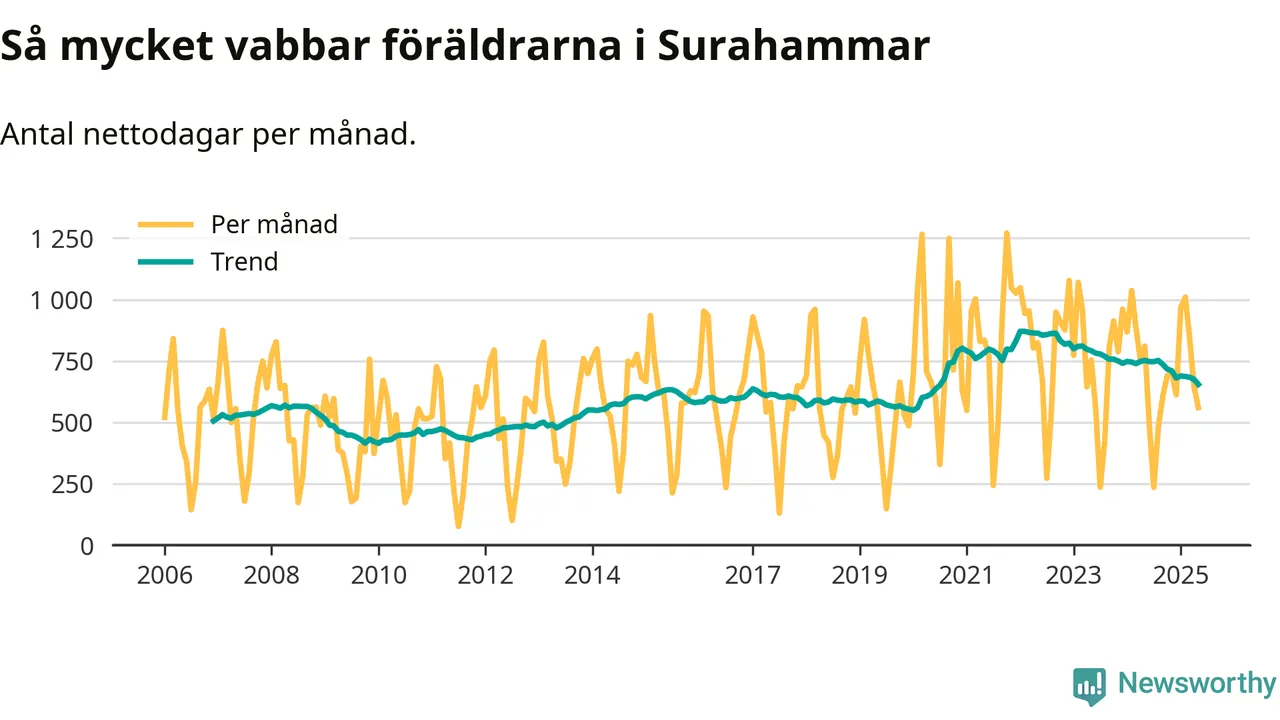 Surahammar ligger en bit från ett jämställt uttag. Under de senaste tolv månaderna har männen stått för 40 procent av all vabb i kommunen. Pappornas uttag peakade vintern 2018 då kommunens fäder var uppe i 43 procent av vabbdagarna 1.