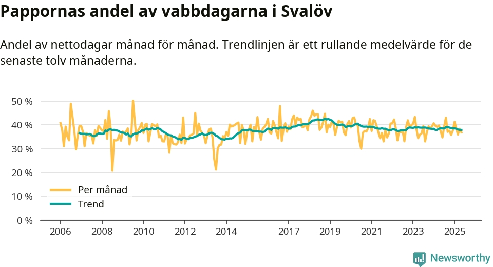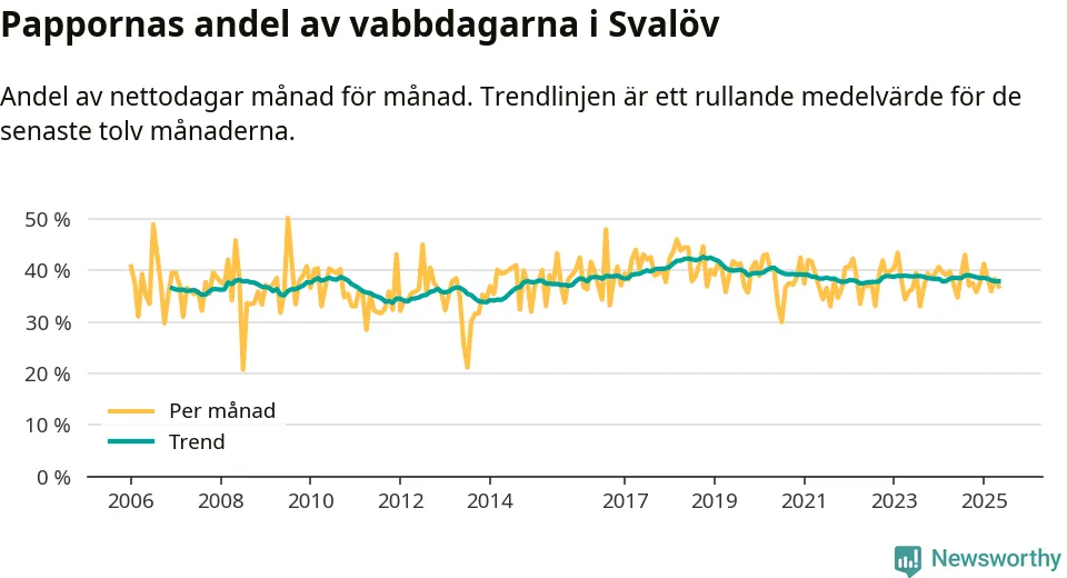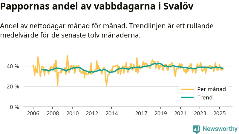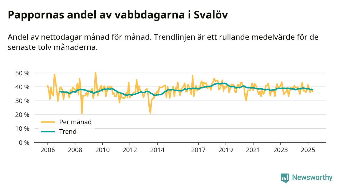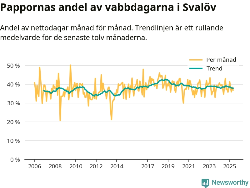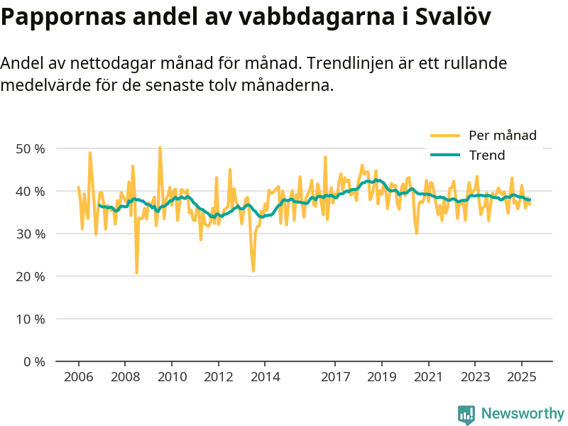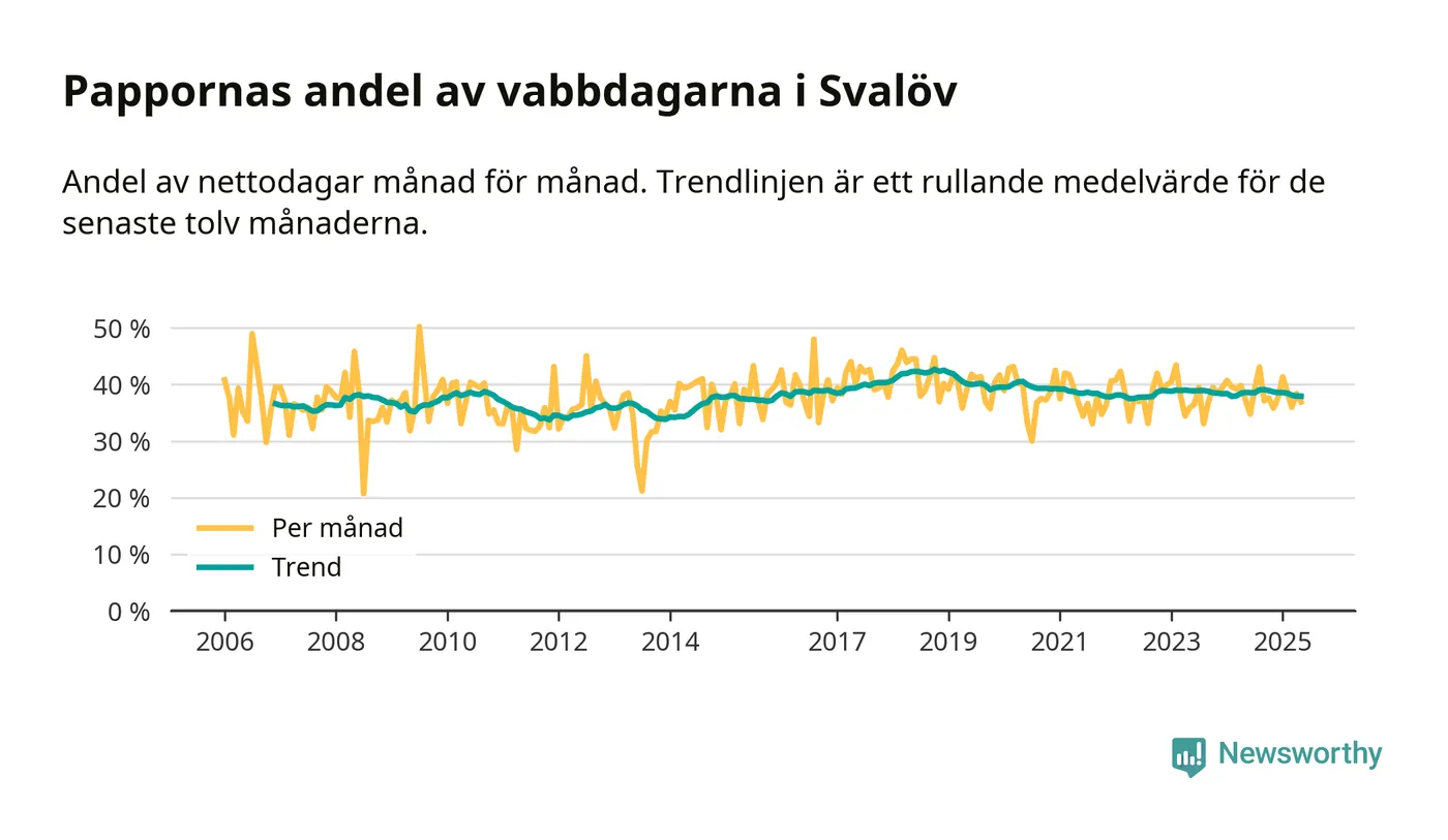 Pappor i Svalöv vabbar ungefär som rikssnittet, men mer än andra män i Skåne län (36 procent). Skillnaderna inom landet är stora. Dorotea är den enda kommun i landet som når 50–50-fördelning.