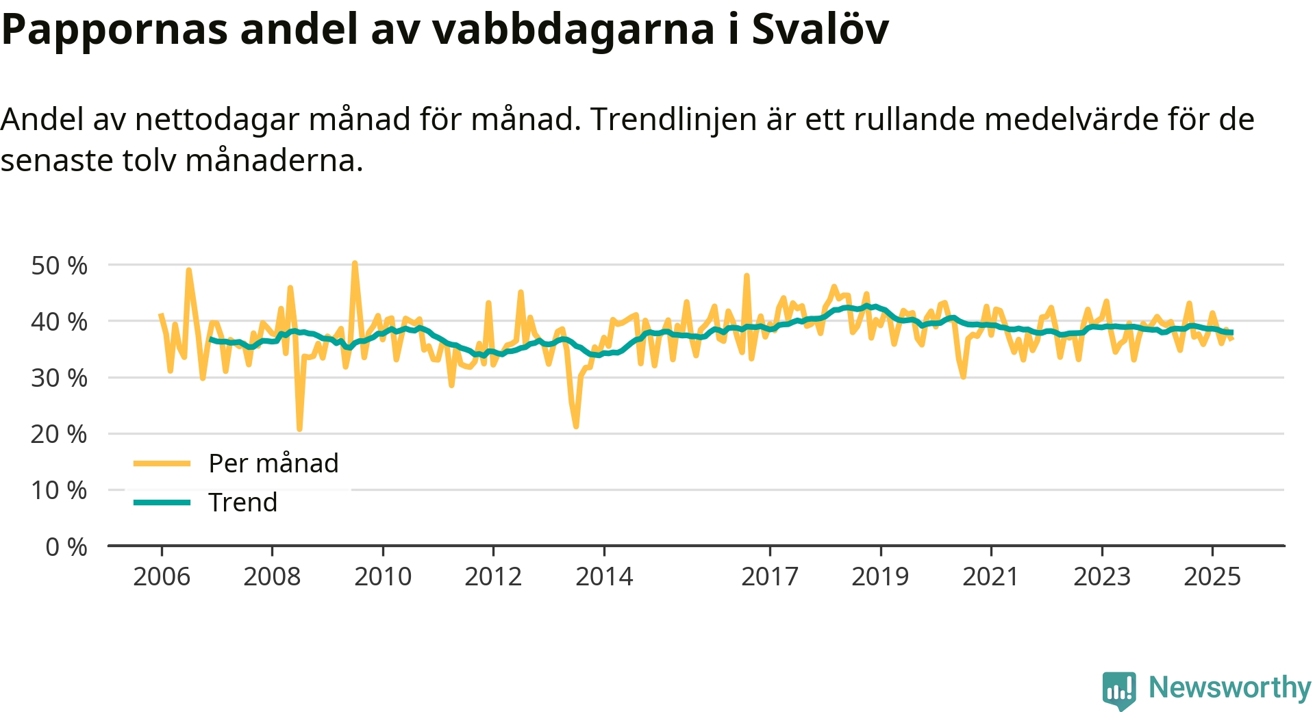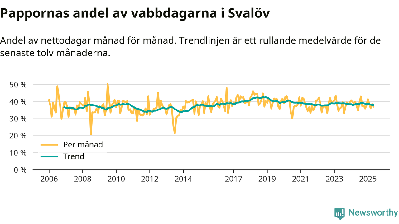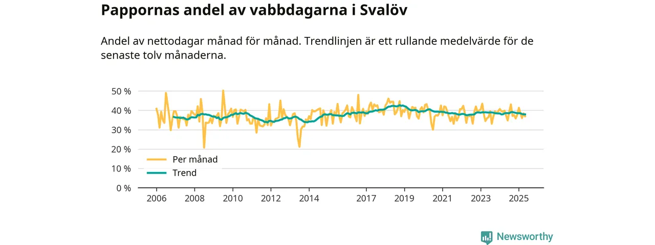 Svalöv ligger en bit från ett jämställt uttag. Under de senaste tolv månaderna har männen stått för 38 procent av all vabb i kommunen. Pappornas uttag peakade hösten 2018 då kommunens fäder var uppe i 43 procent av vabbdagarna 1.