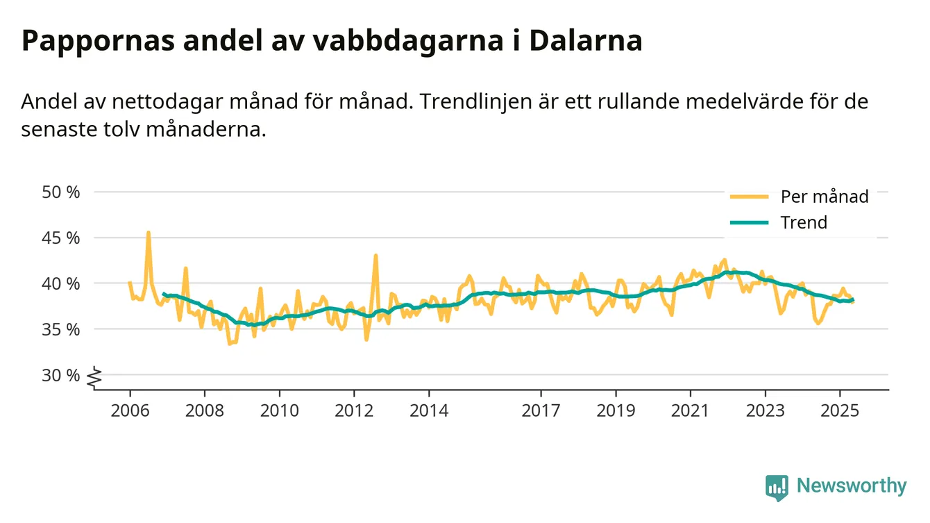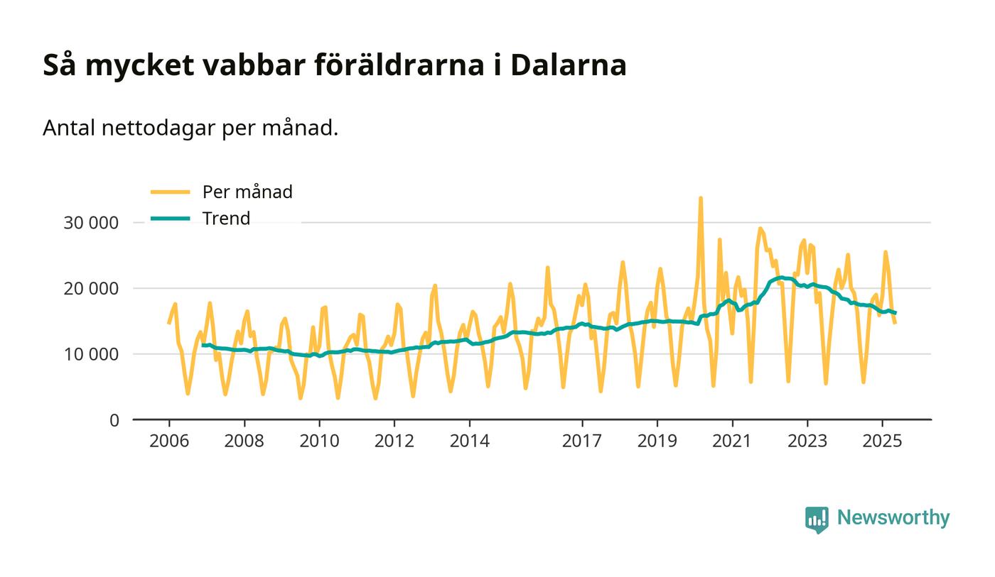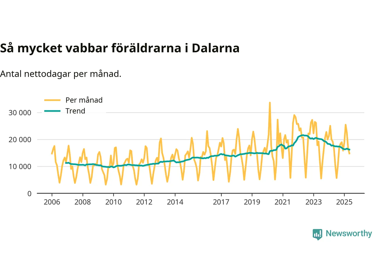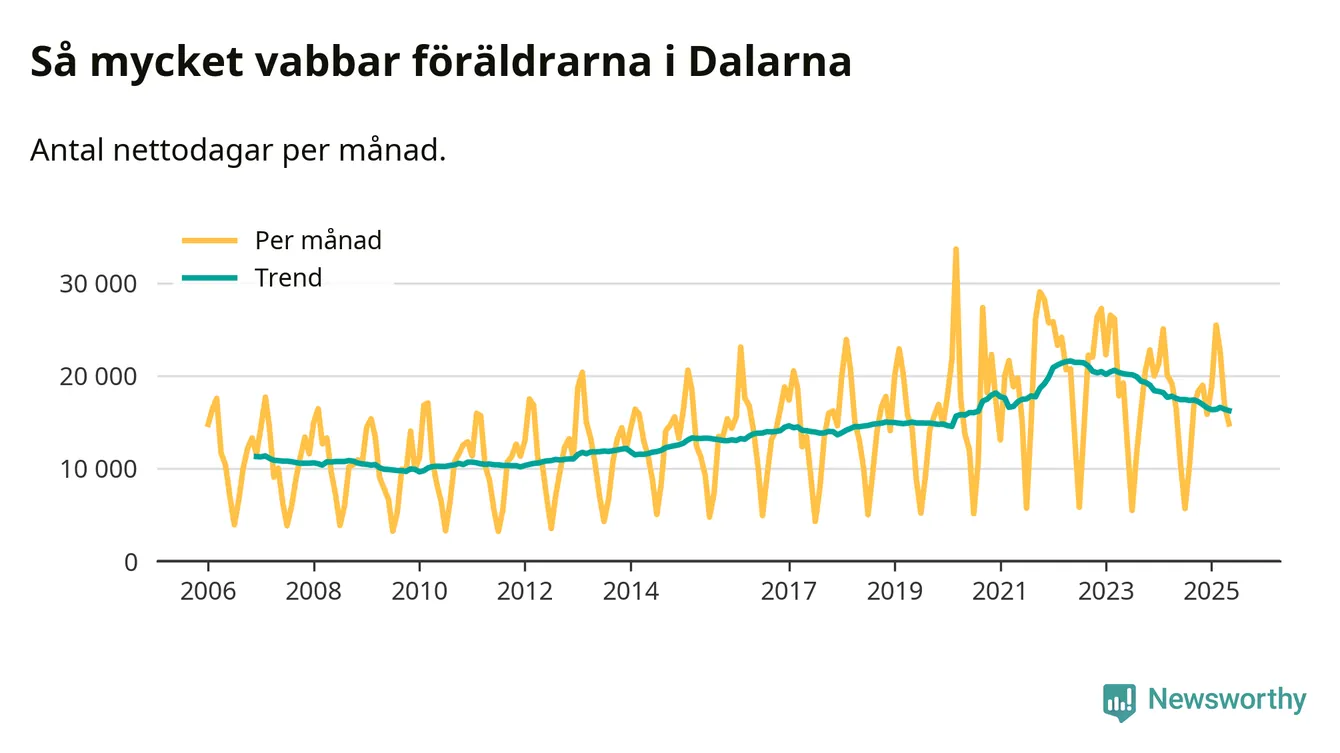 När coronapandemin drog in i mars 2020 peakade antalet vabbdagar både i Dalarnas län och i riket som helhet. Under de senaste två åren har vabbuttaget börjat minska igen.