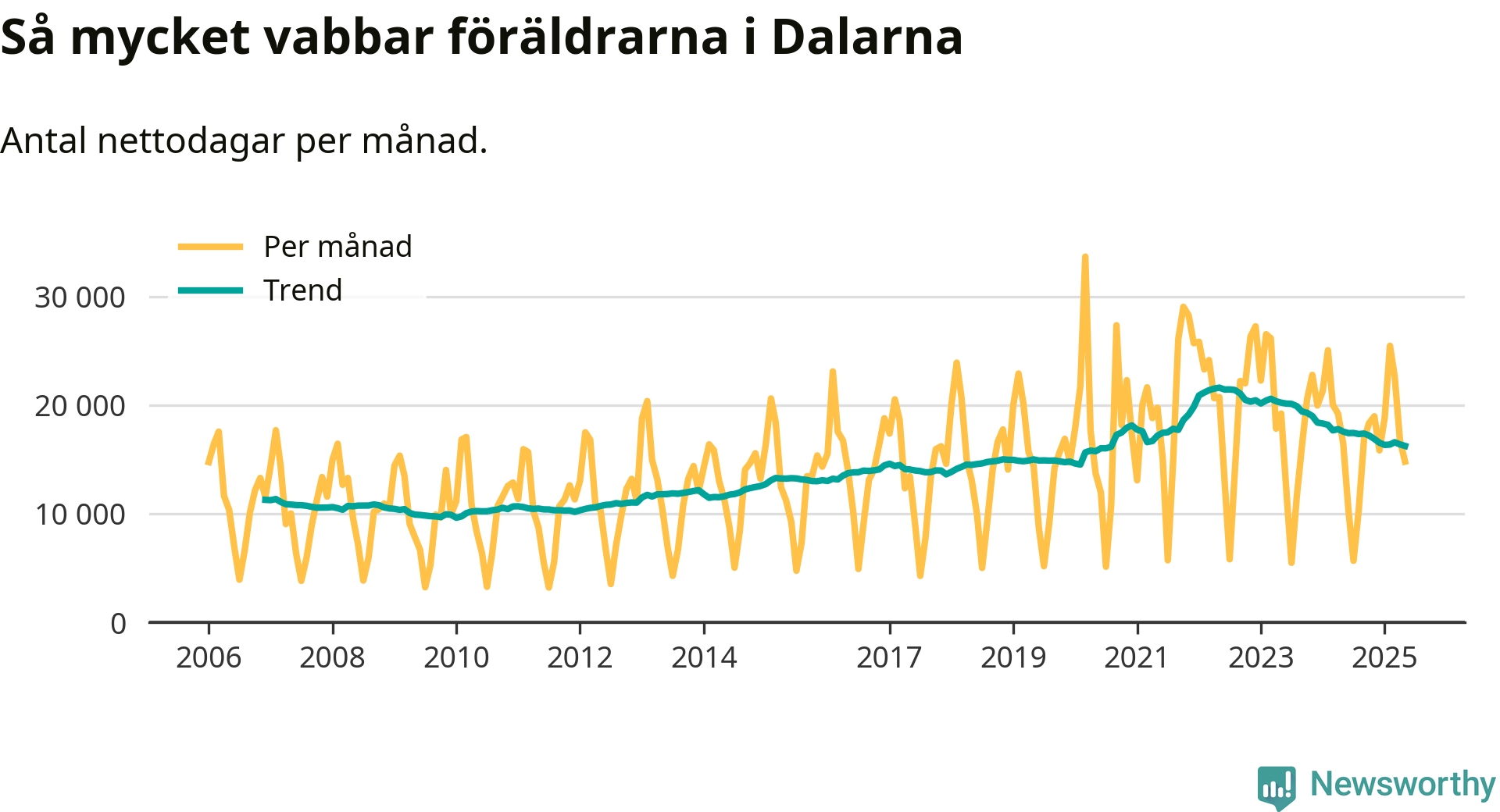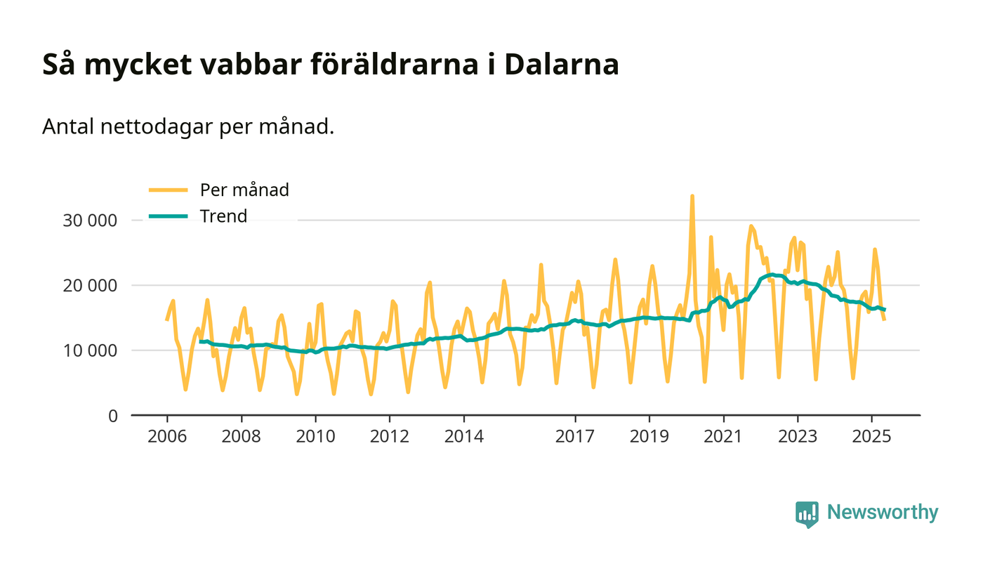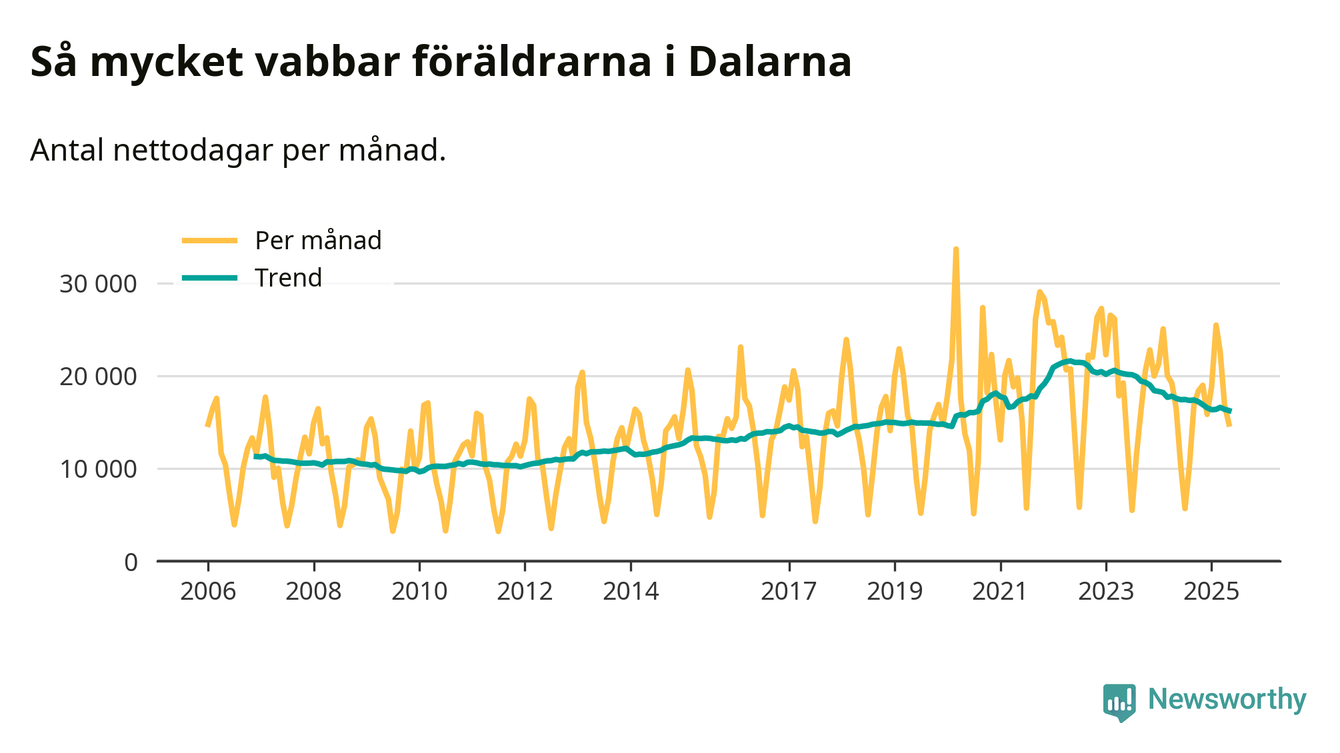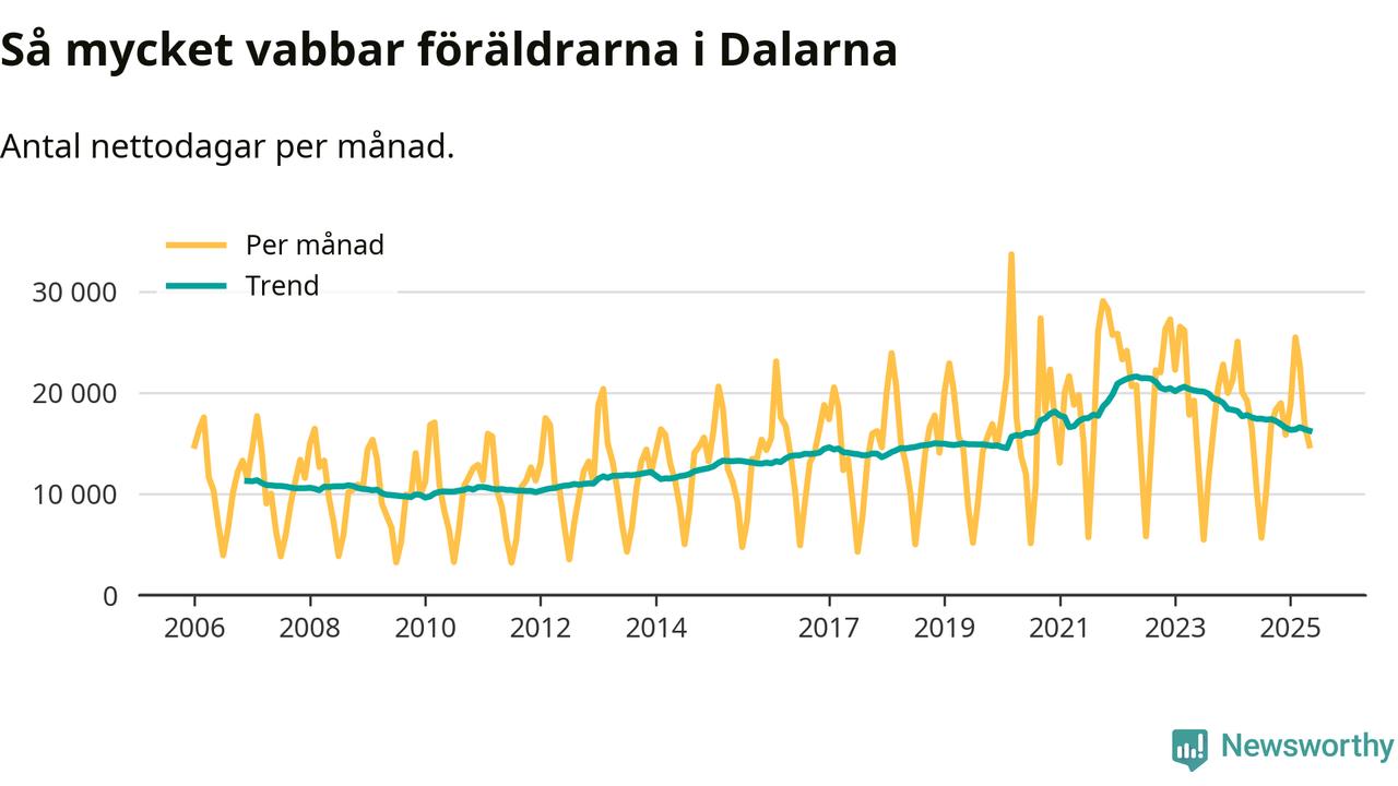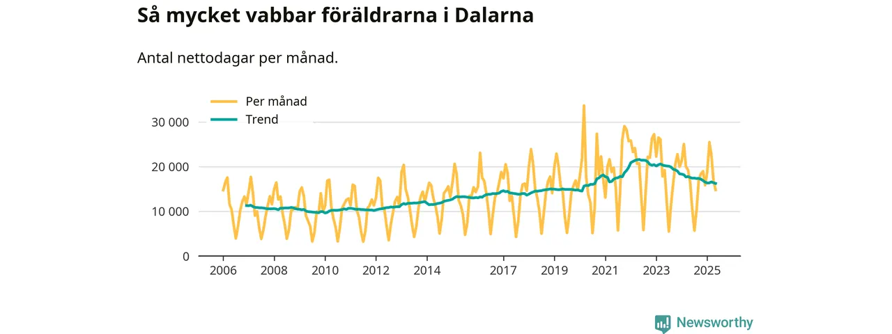 När coronapandemin drog in i mars 2020 peakade antalet vabbdagar både i Dalarnas län och i riket som helhet. Under de senaste två åren har vabbuttaget börjat minska igen.