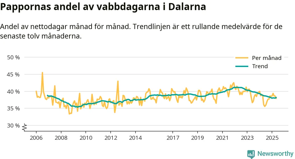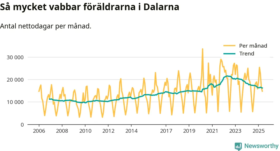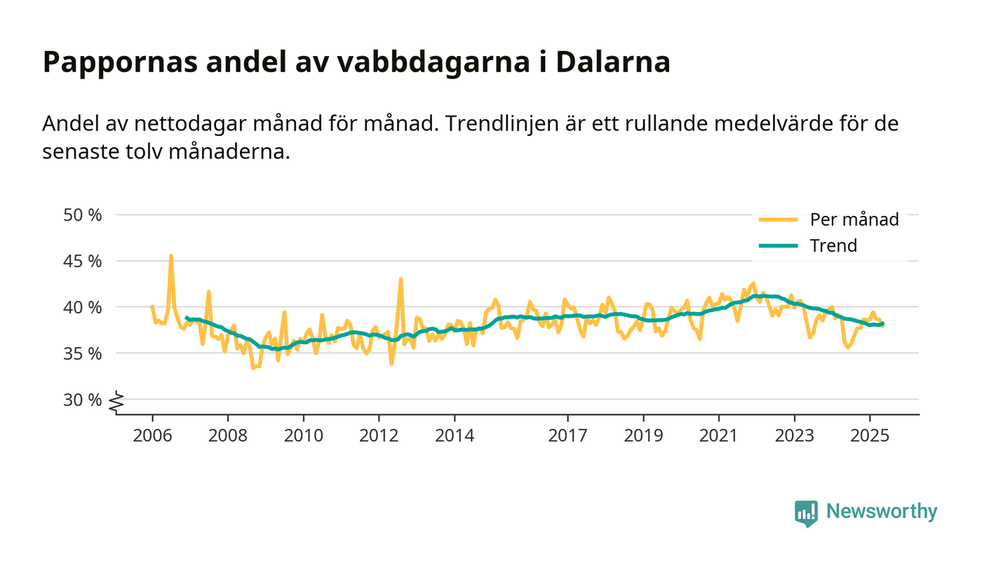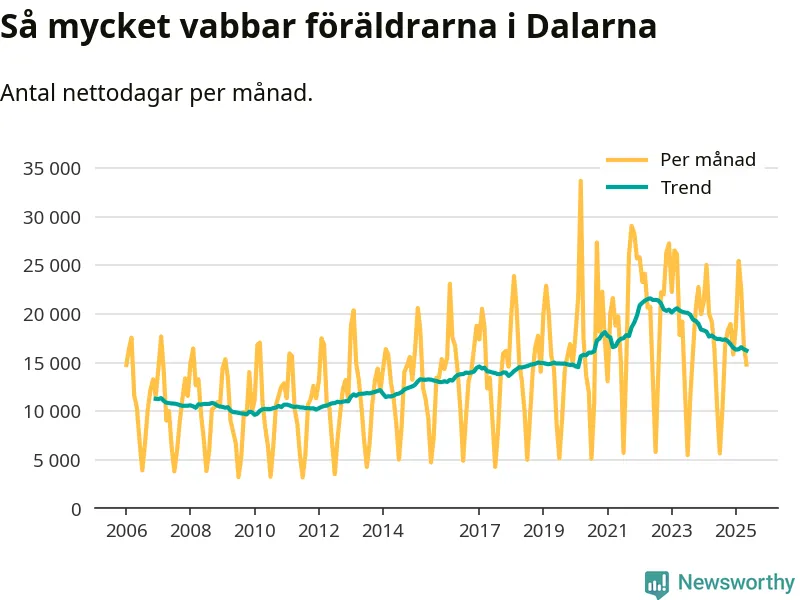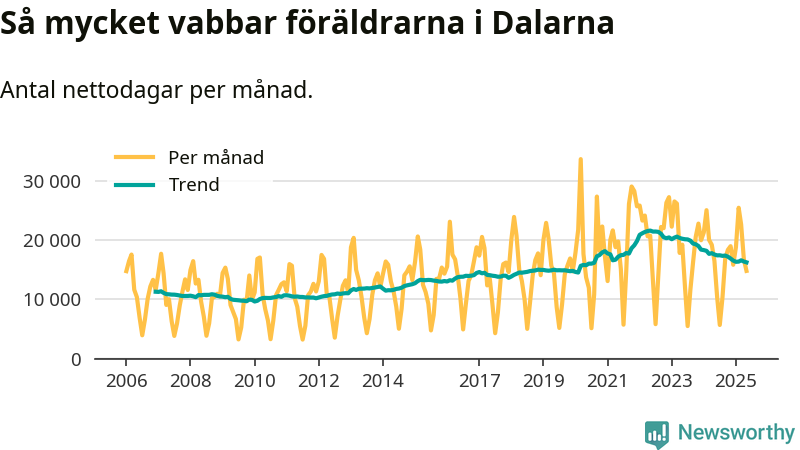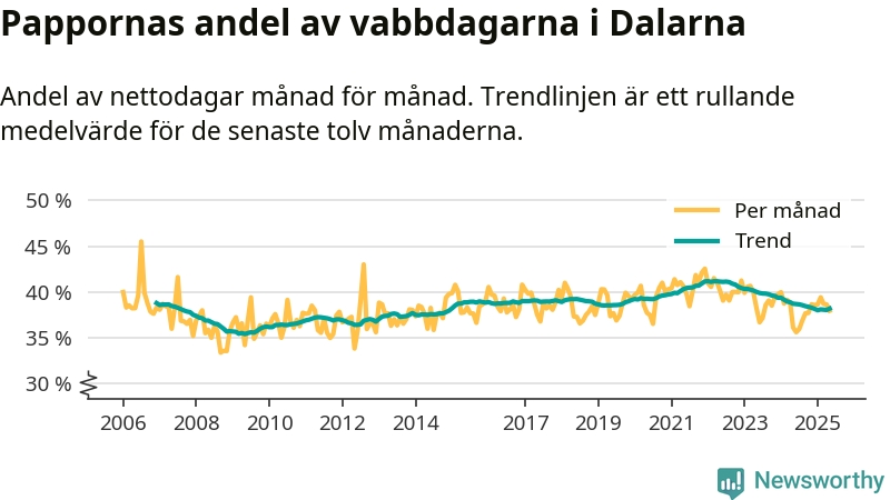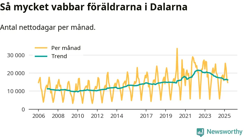 När coronapandemin drog in i mars 2020 peakade antalet vabbdagar både i Dalarnas län och i riket som helhet. Under de senaste två åren har vabbuttaget börjat minska igen.