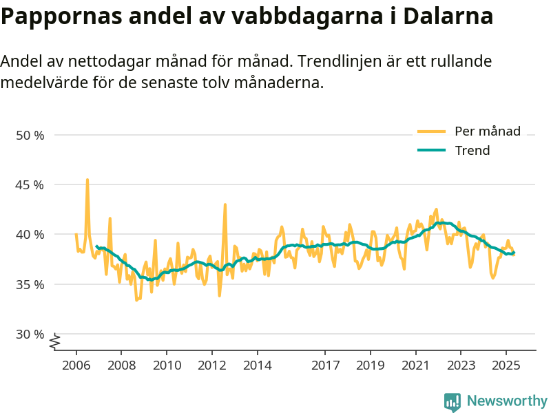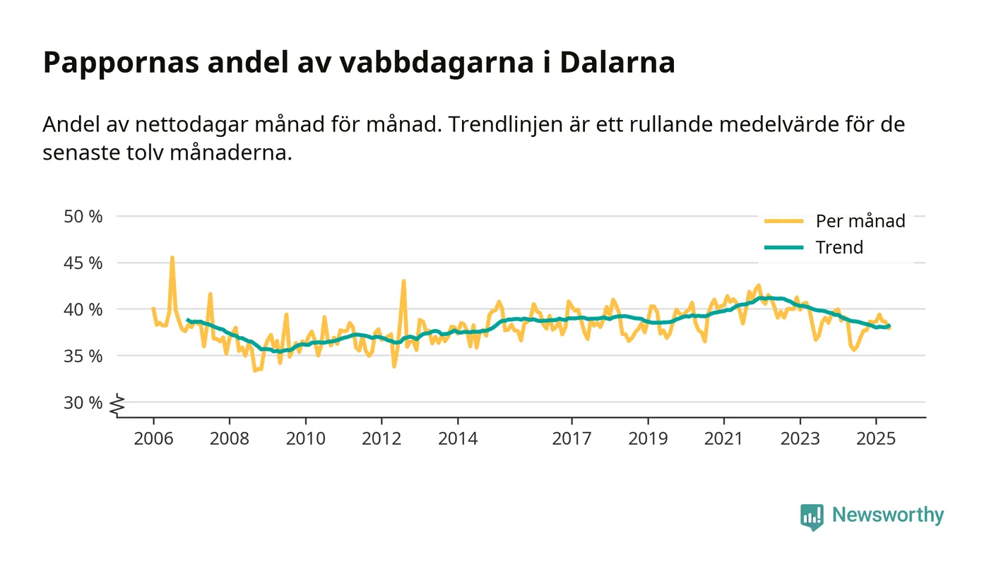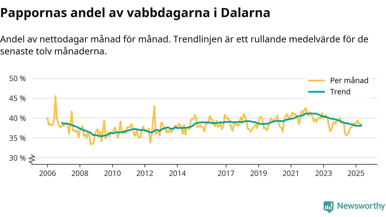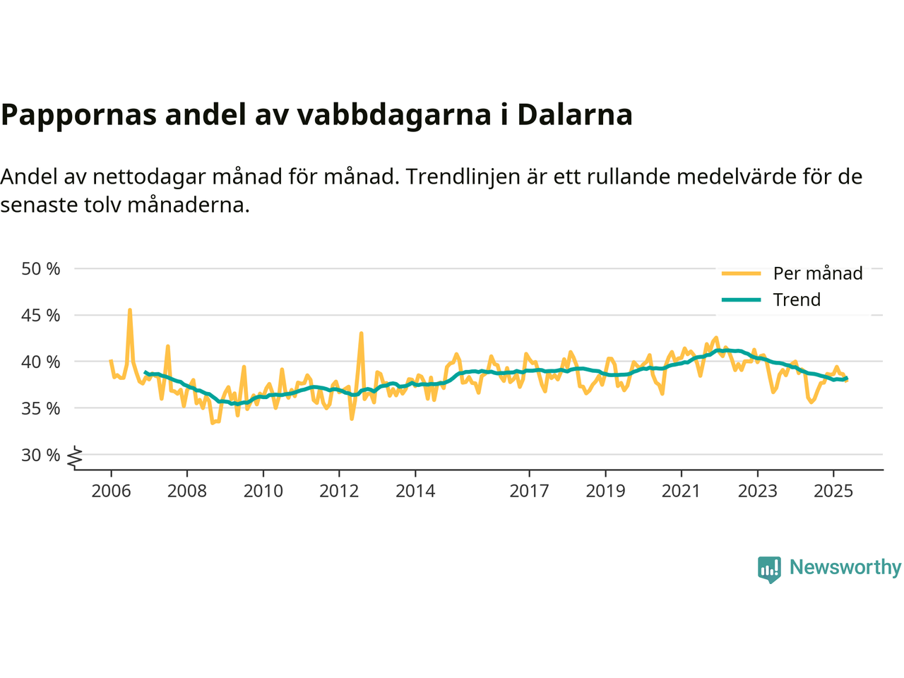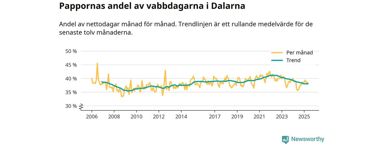 Dalarna ligger en bit från ett jämställt uttag. Under de senaste tolv månaderna har männen stått för 38 procent av all vabb i kommunen. I år har andelen varit lägre än på över tio år.