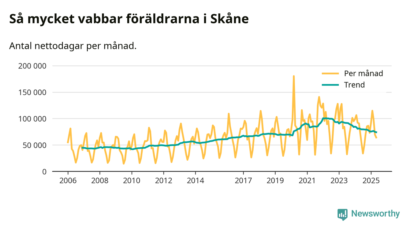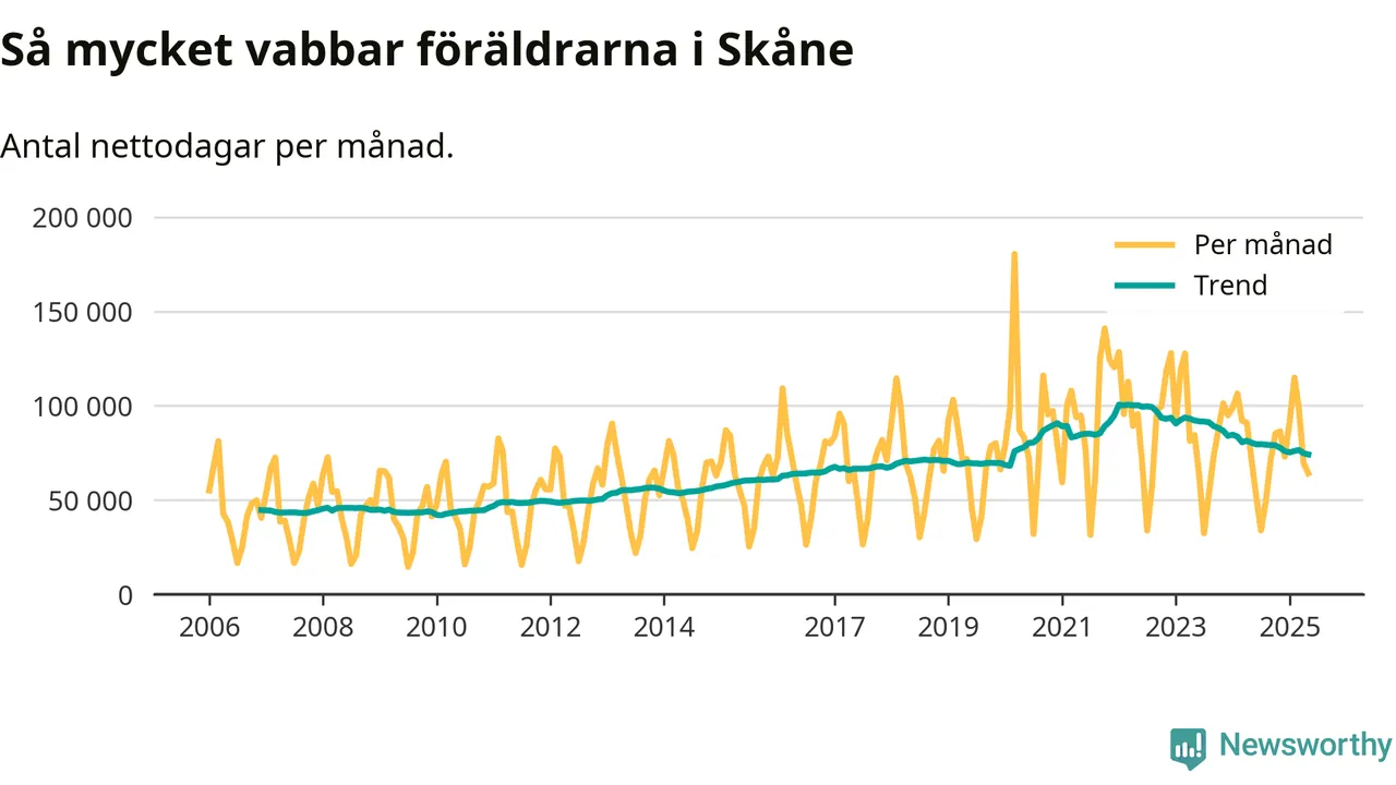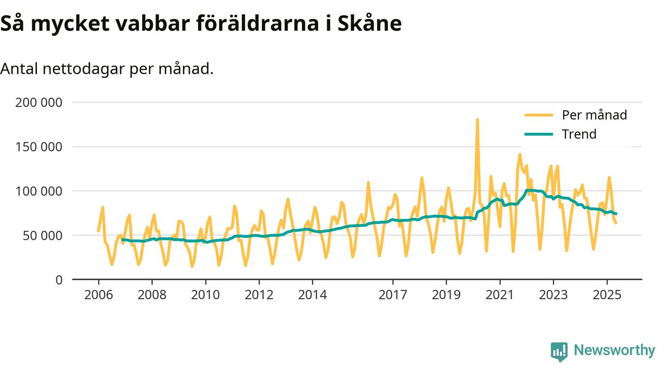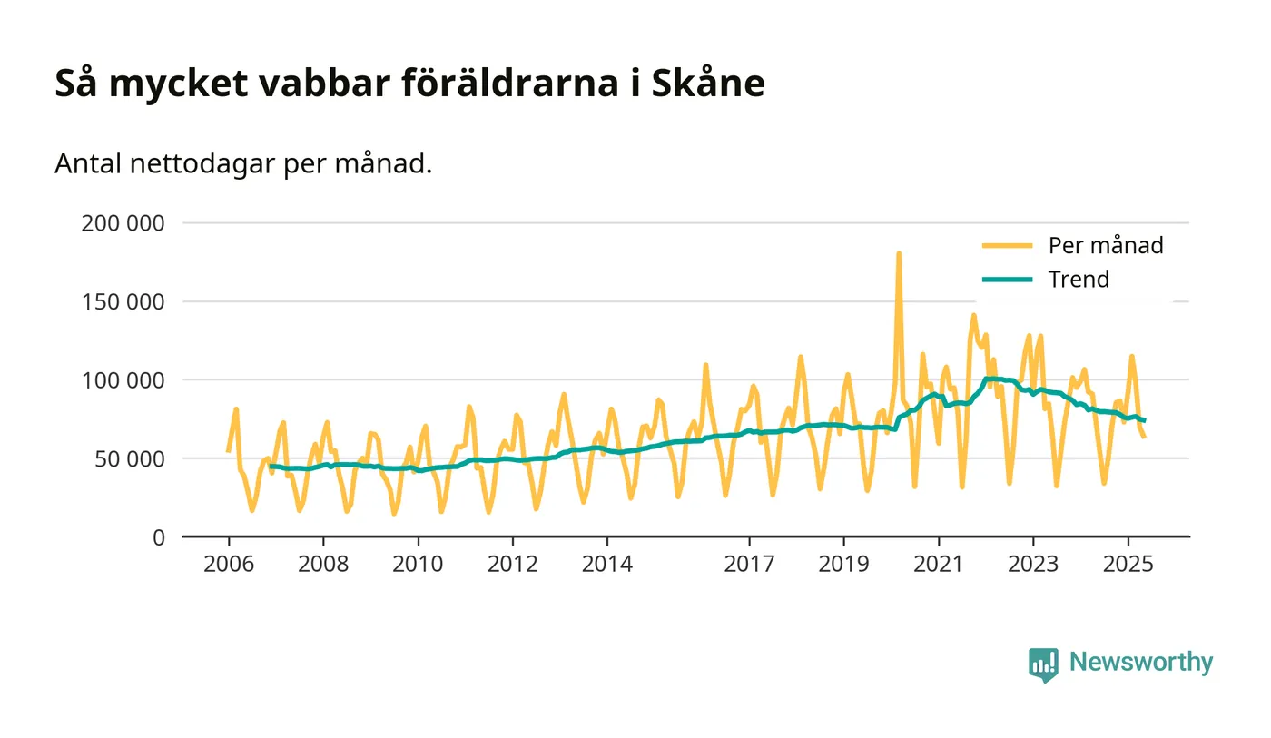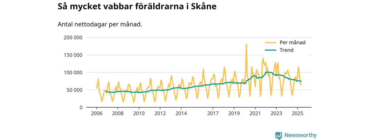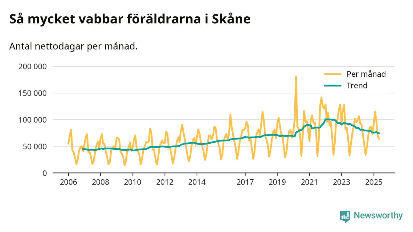 När coronapandemin drog in i mars 2020 peakade antalet vabbdagar både i Skåne län och i riket som helhet. Under de senaste två åren har vabbuttaget börjat minska igen.