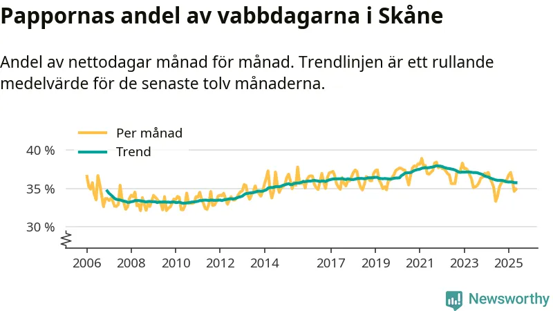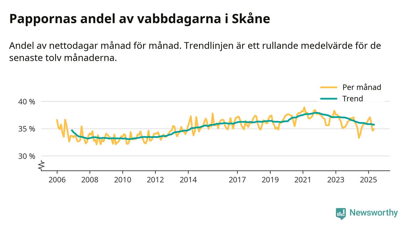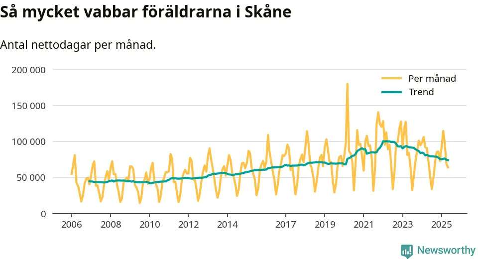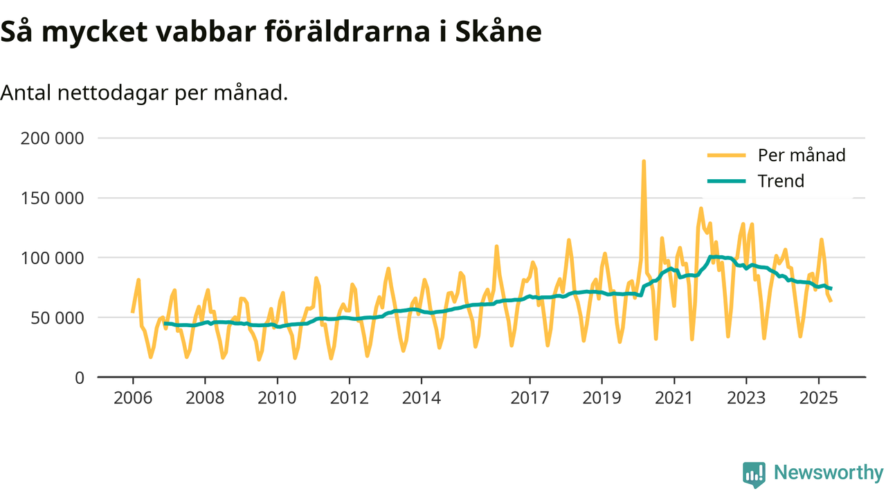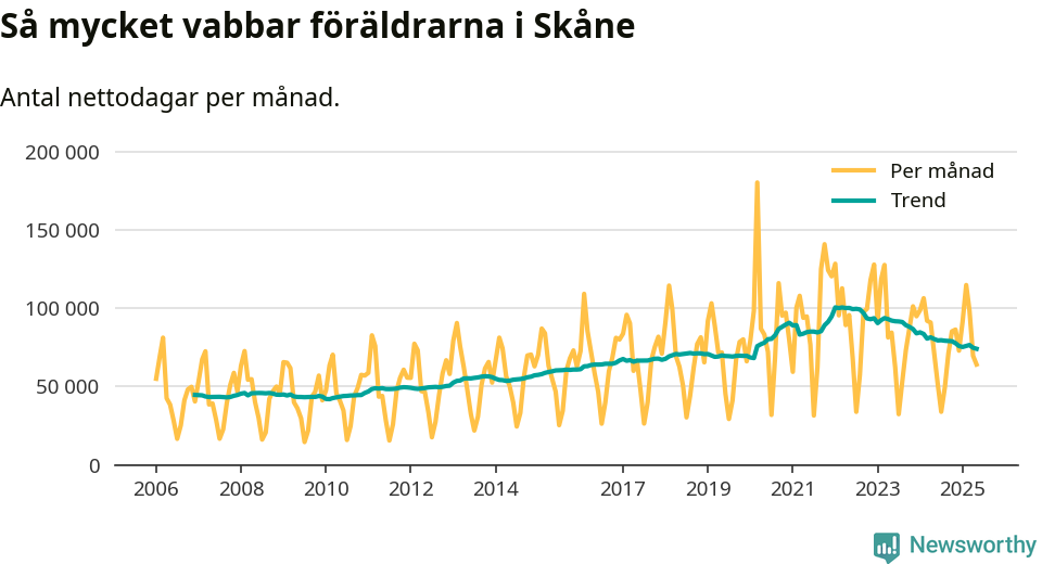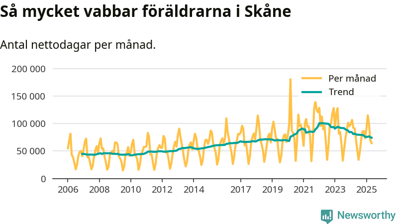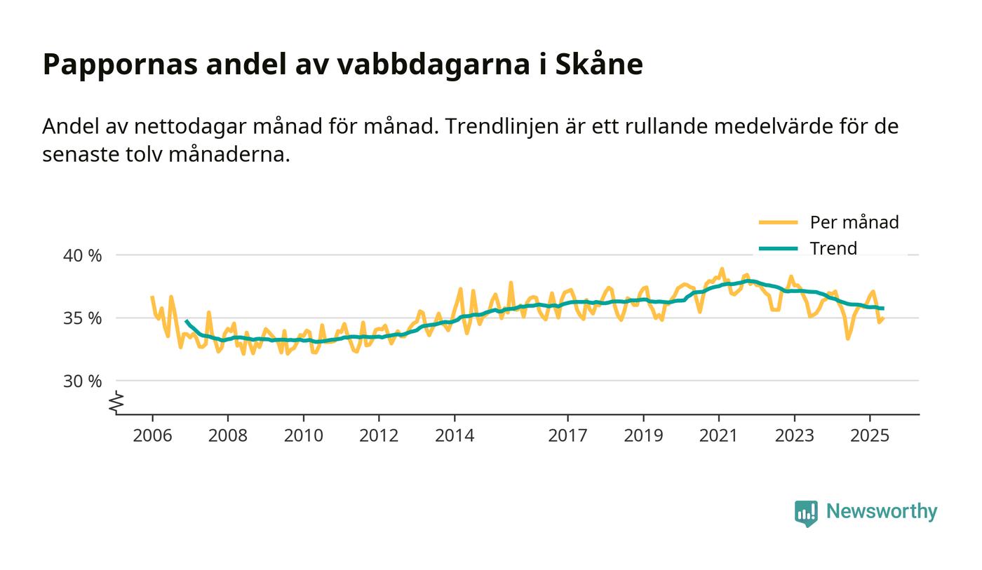 När coronapandemin drog in i mars 2020 peakade antalet vabbdagar både i Skåne län och i riket som helhet. Under de senaste två åren har vabbuttaget börjat minska igen.