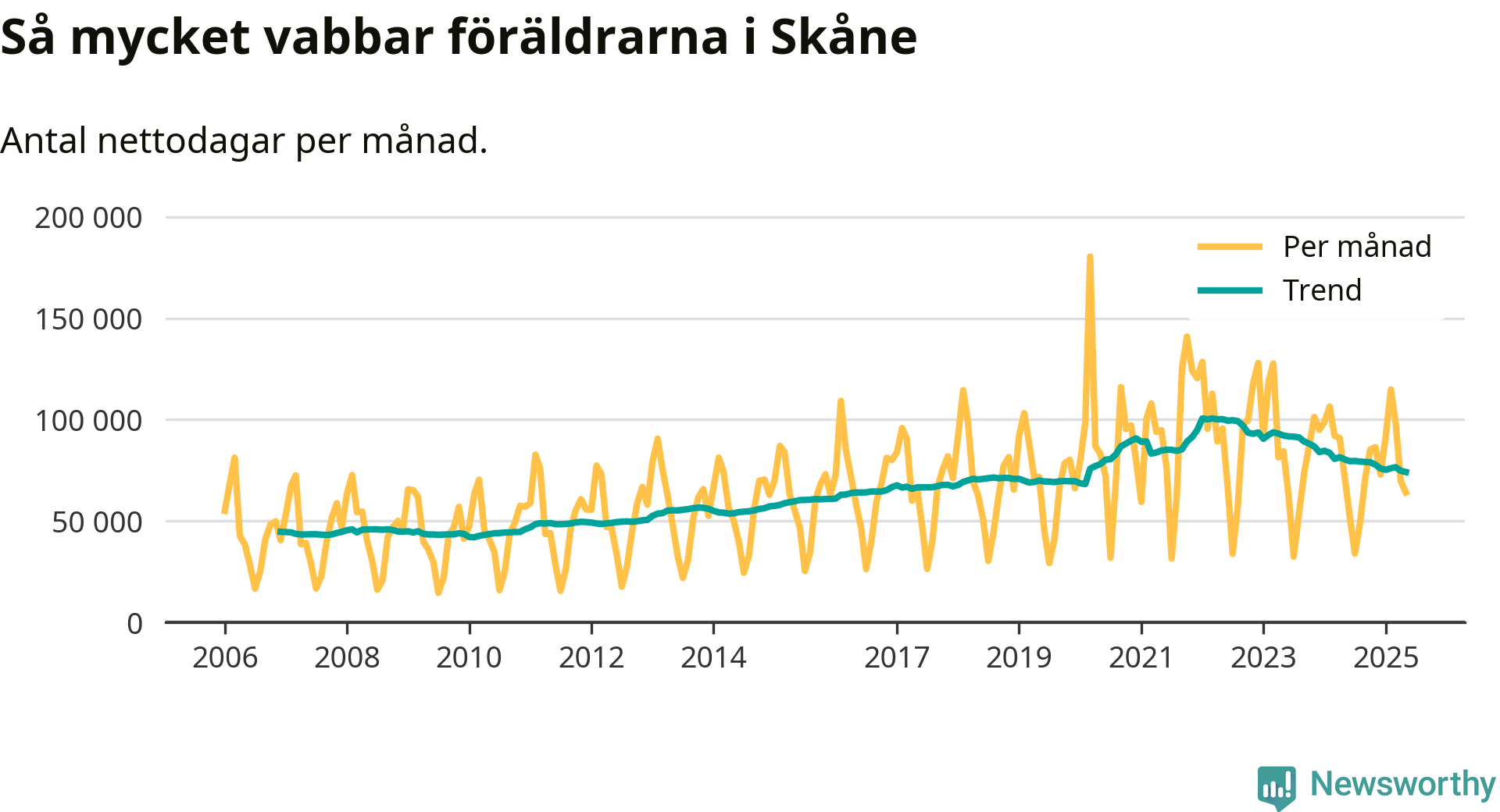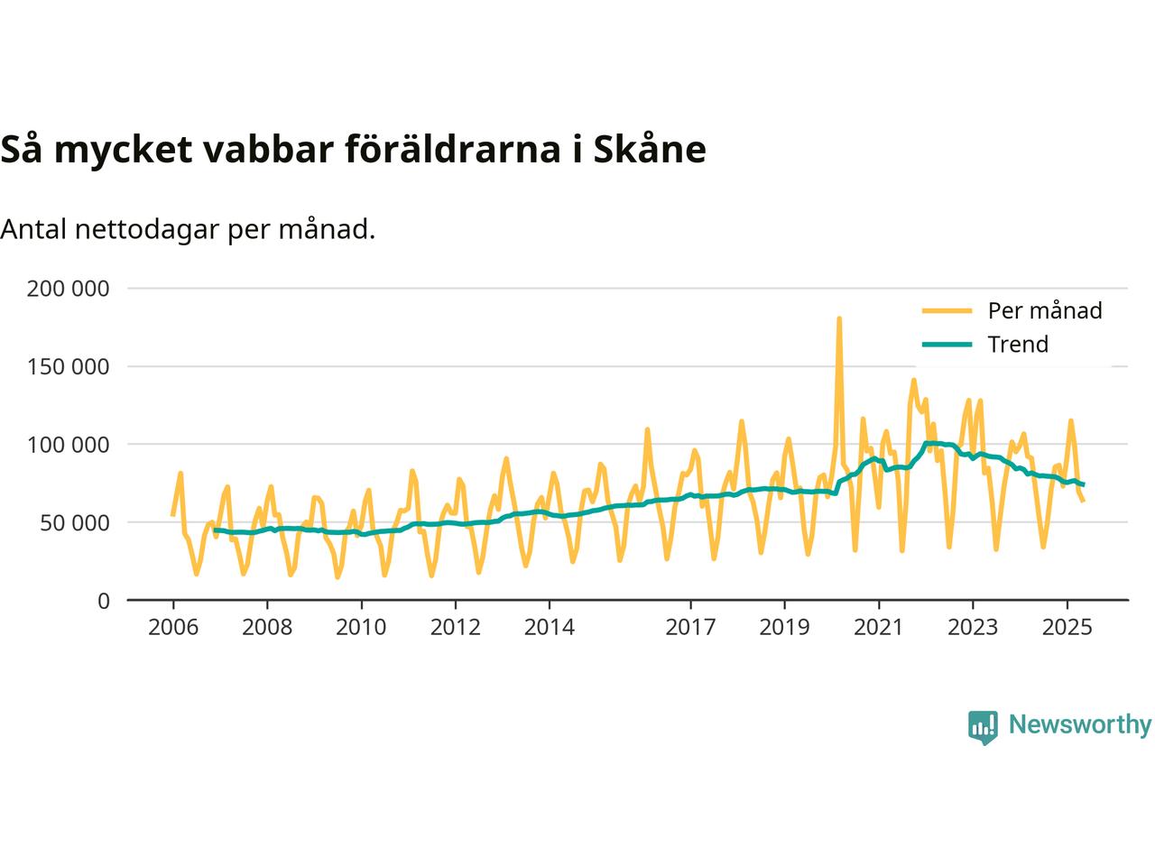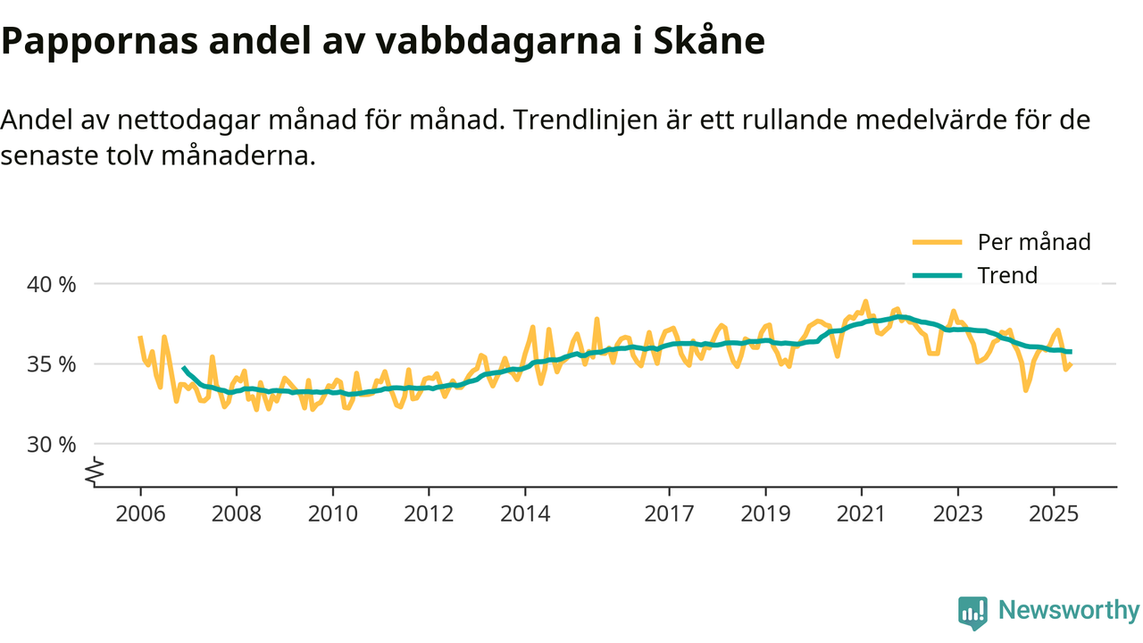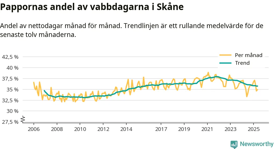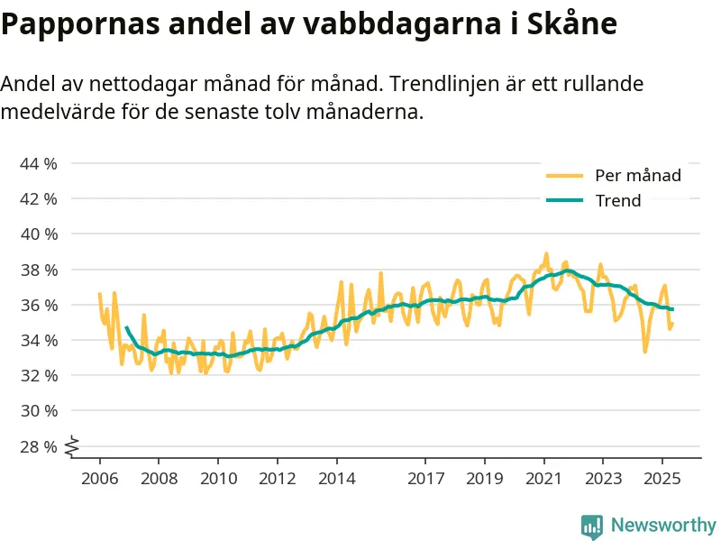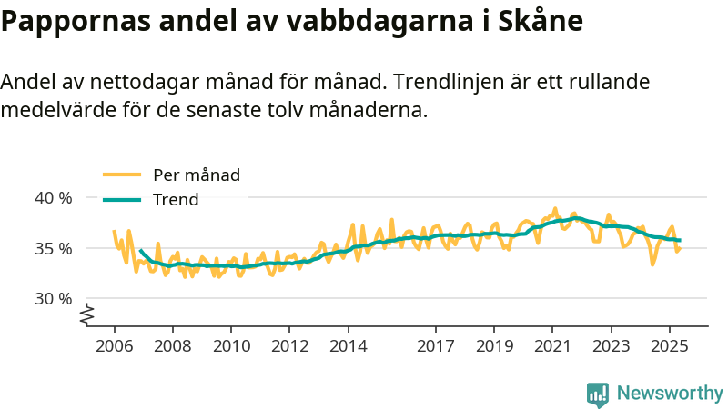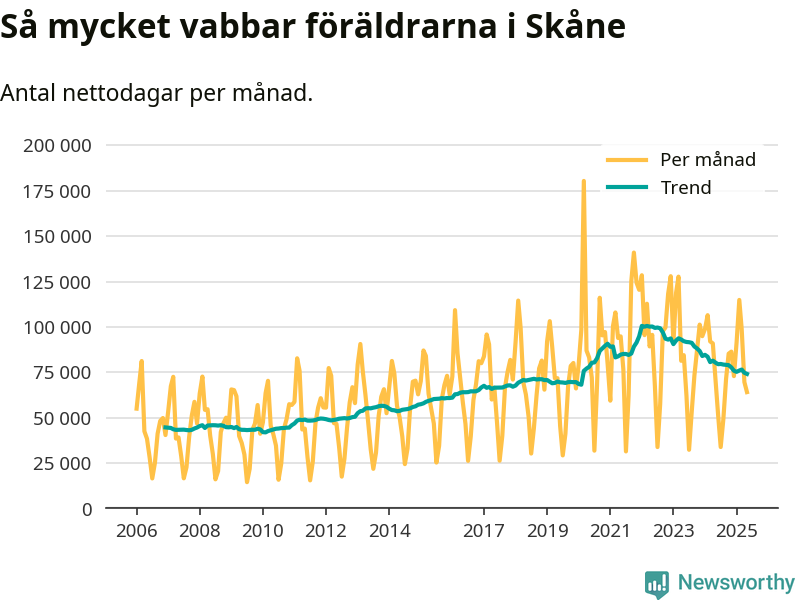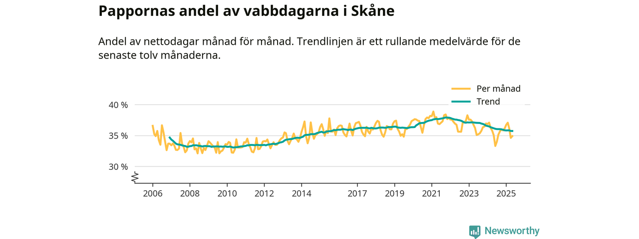 När coronapandemin drog in i mars 2020 peakade antalet vabbdagar både i Skåne län och i riket som helhet. Under de senaste två åren har vabbuttaget börjat minska igen.