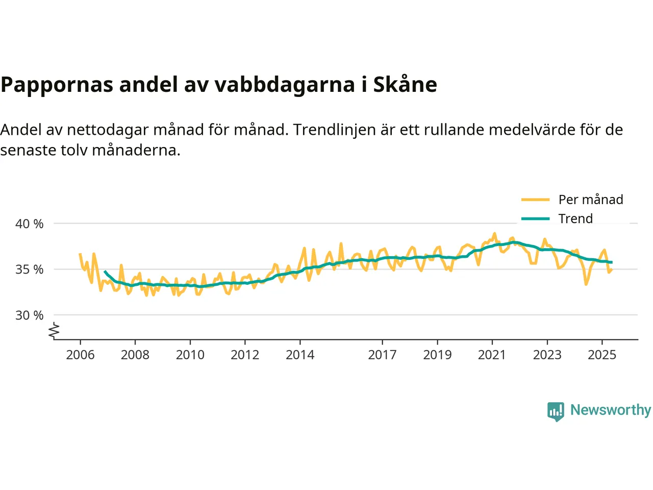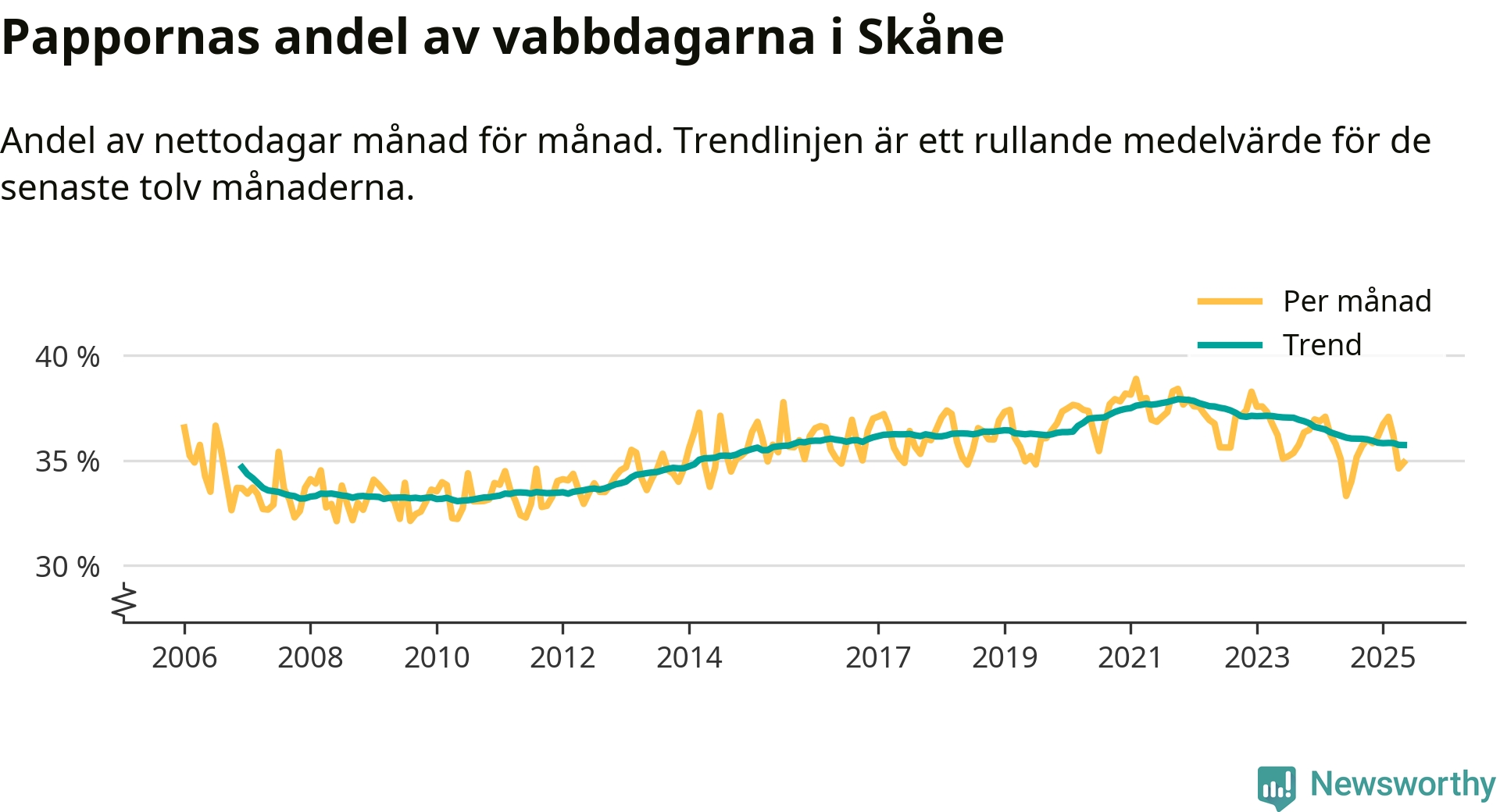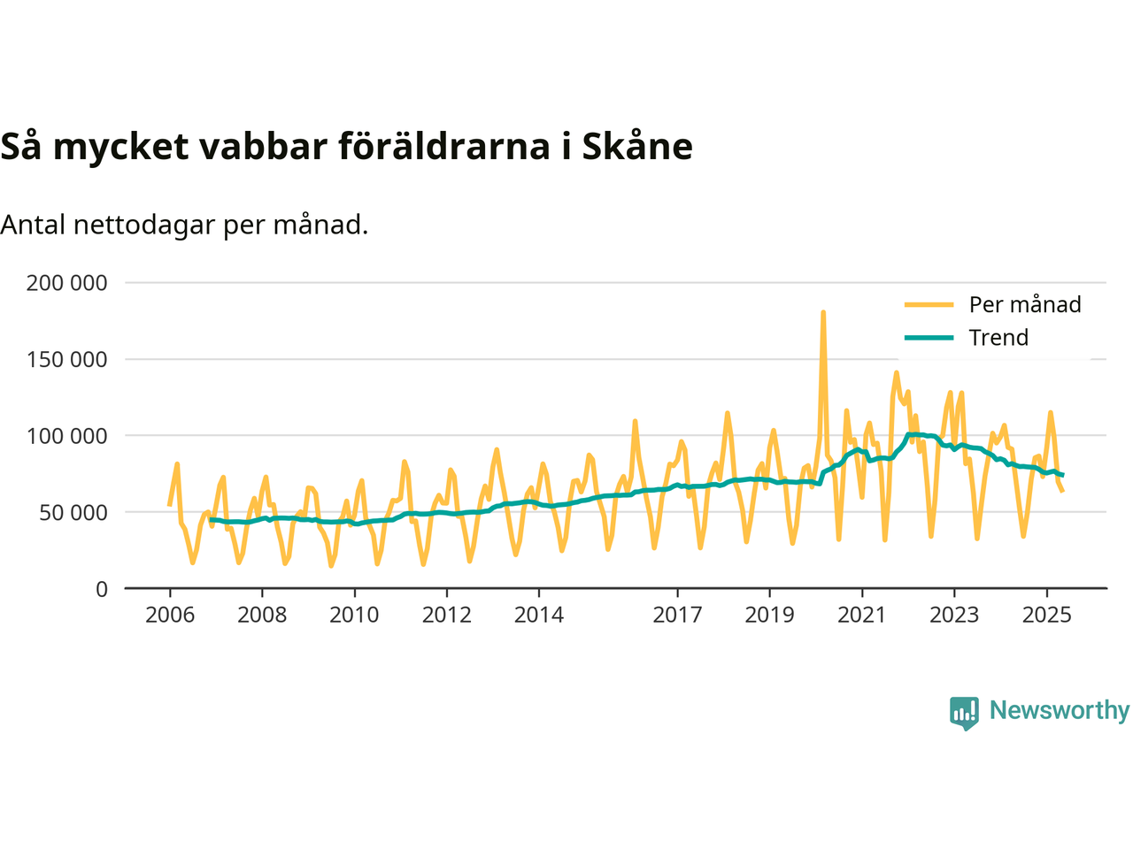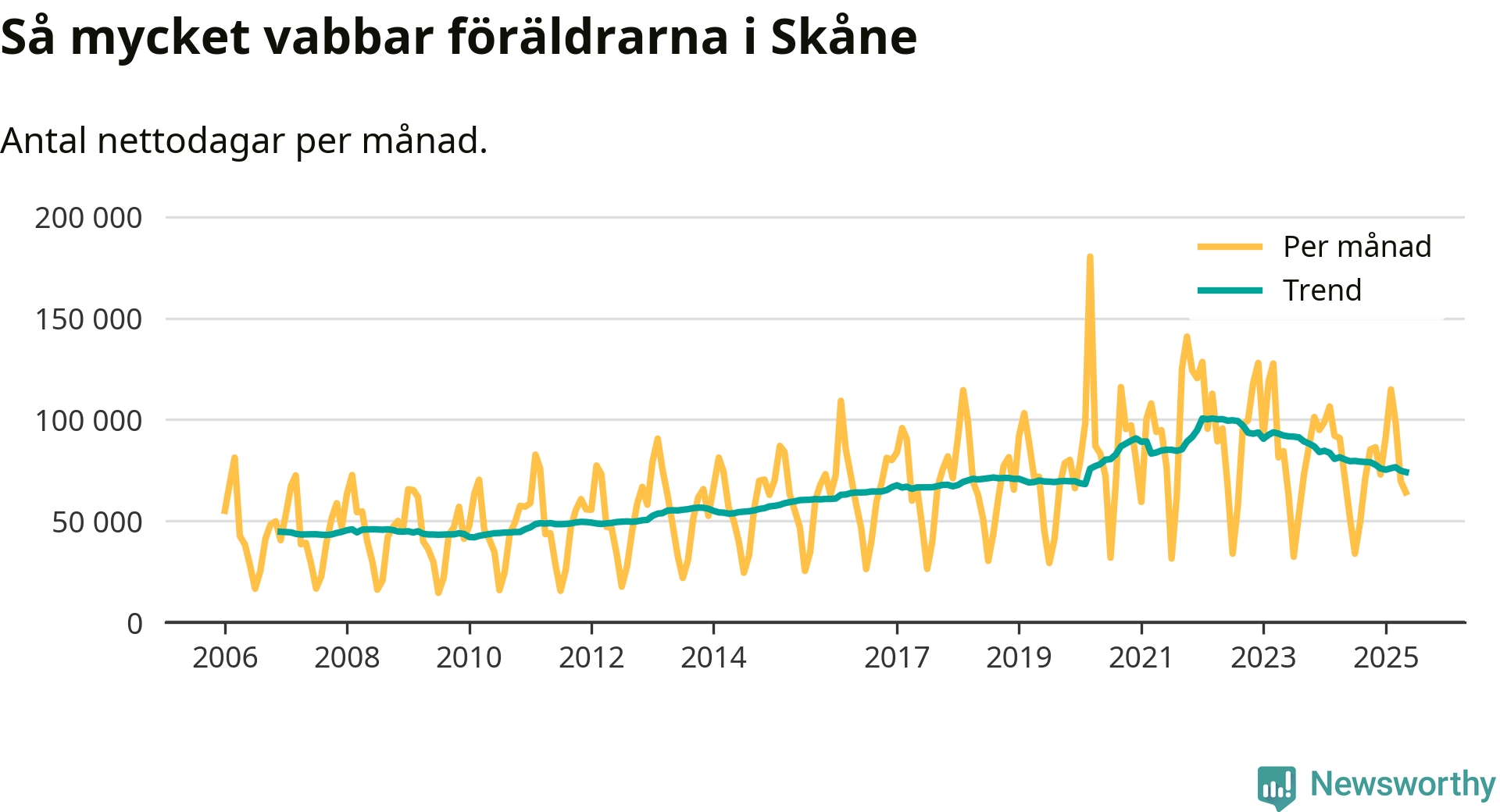 När coronapandemin drog in i mars 2020 peakade antalet vabbdagar både i Skåne län och i riket som helhet. Under de senaste två åren har vabbuttaget börjat minska igen.