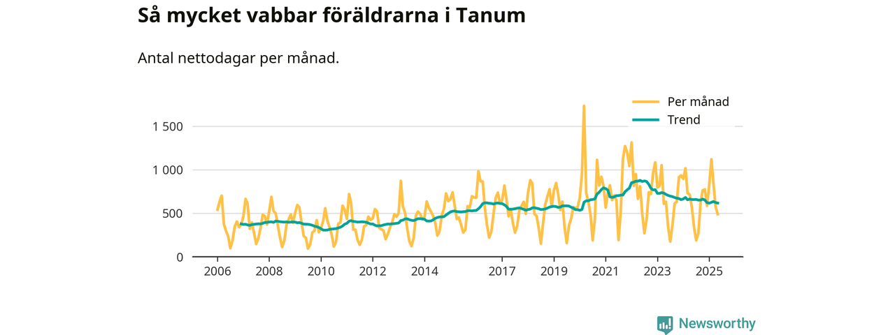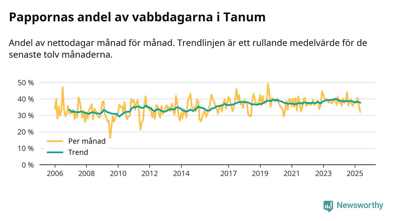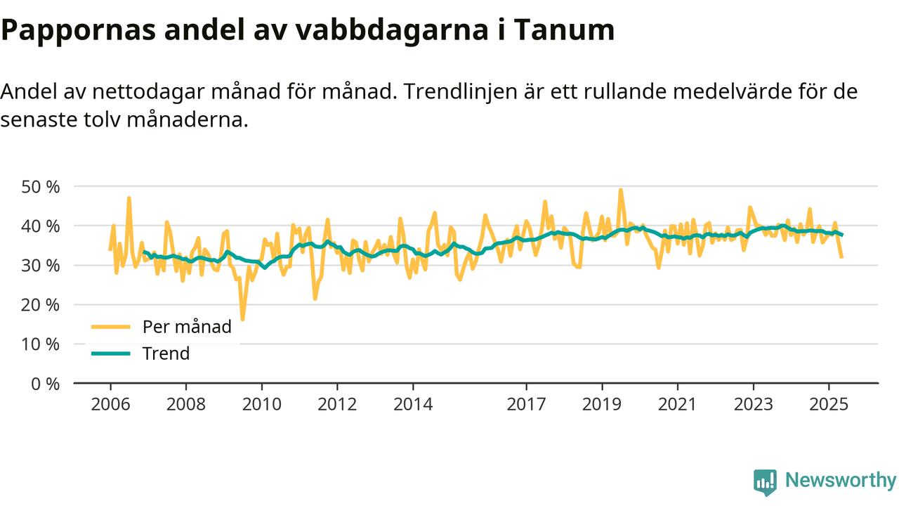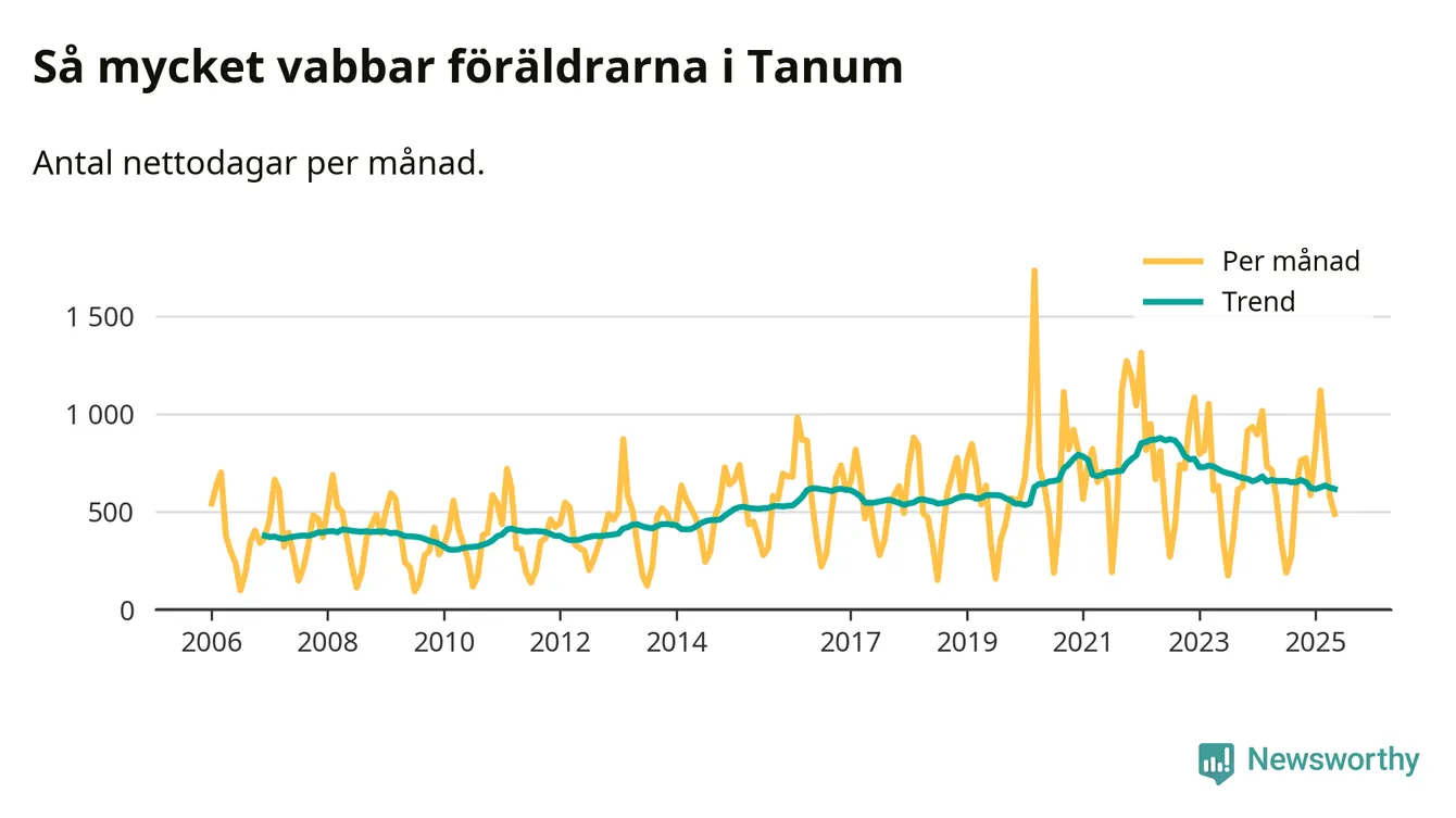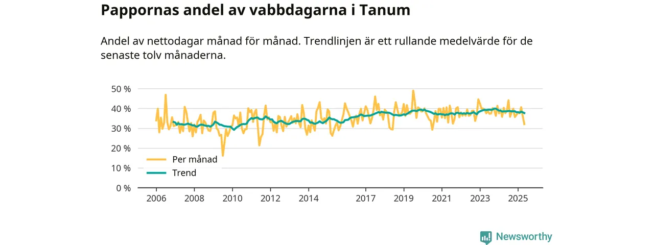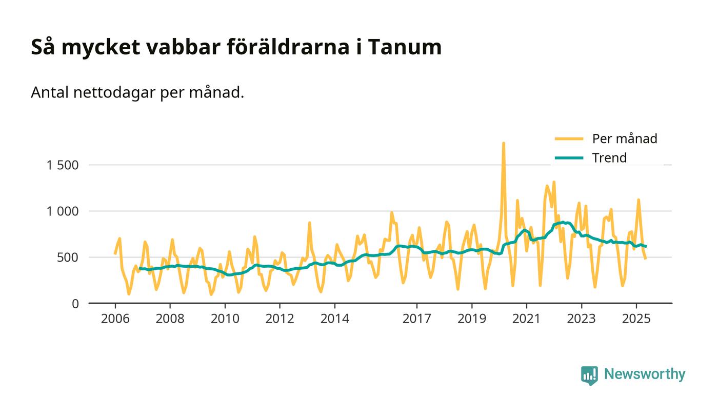 Tanum ligger en bit från ett jämställt uttag. Under de senaste tolv månaderna har männen stått för 38 procent av all vabb i kommunen. Pappornas uttag peakade hösten 2023 då kommunens fäder var uppe i 40 procent av vabbdagarna 1.