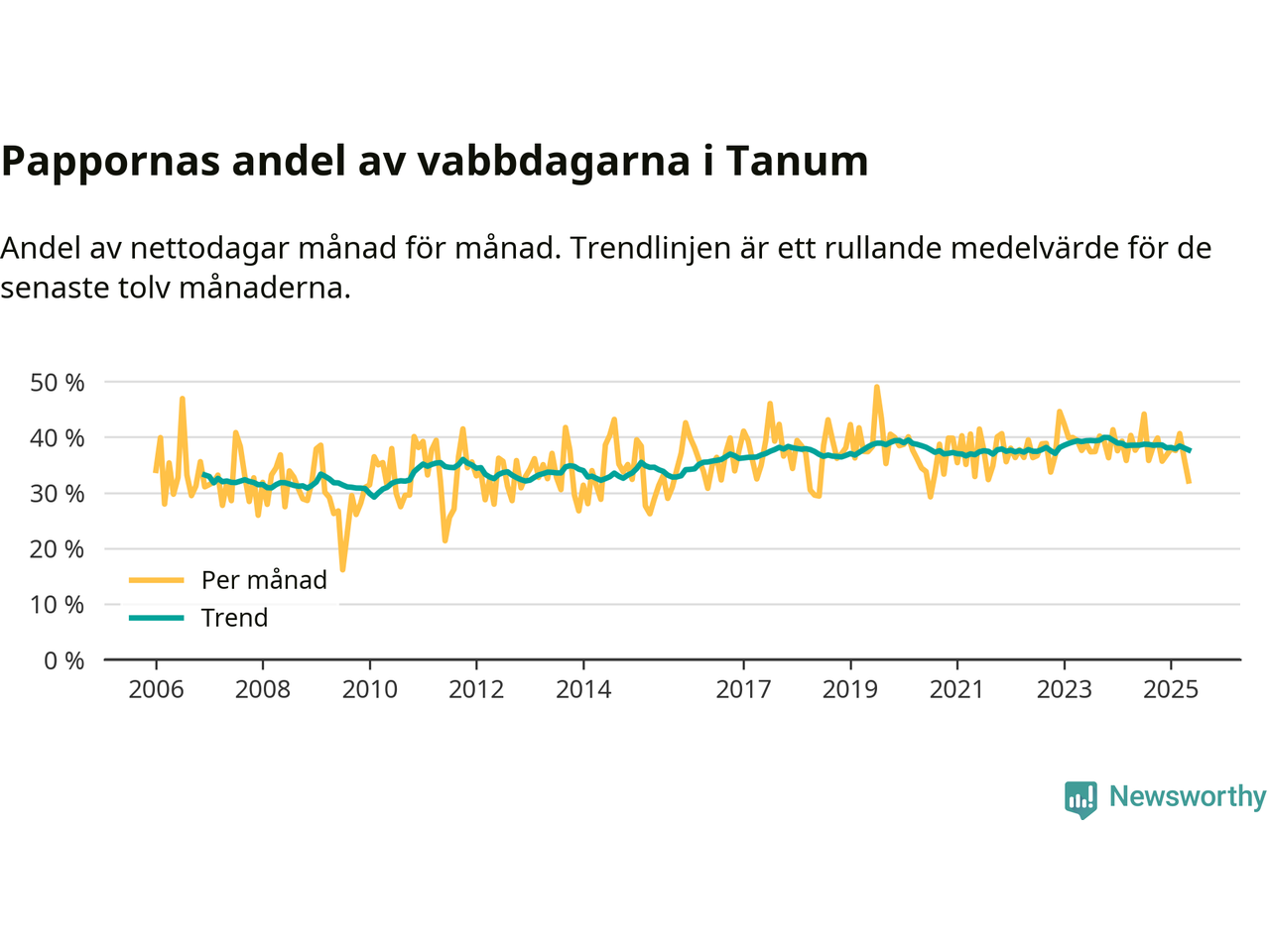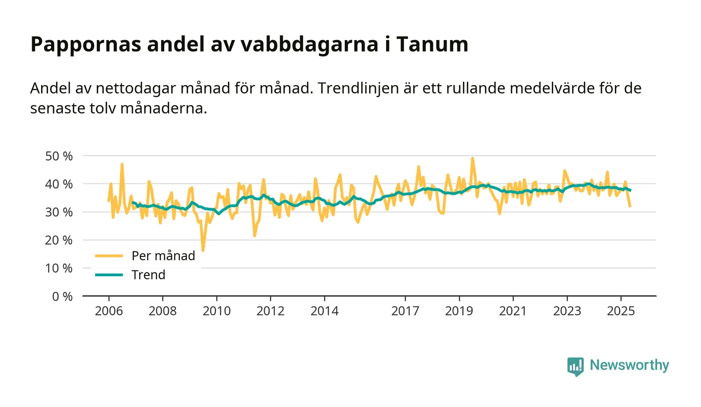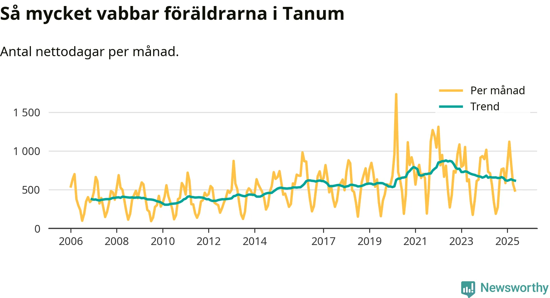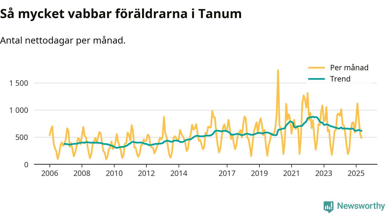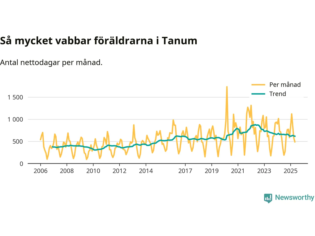 Tanum ligger en bit från ett jämställt uttag. Under de senaste tolv månaderna har männen stått för 38 procent av all vabb i kommunen. Pappornas uttag peakade hösten 2023 då kommunens fäder var uppe i 40 procent av vabbdagarna 1.